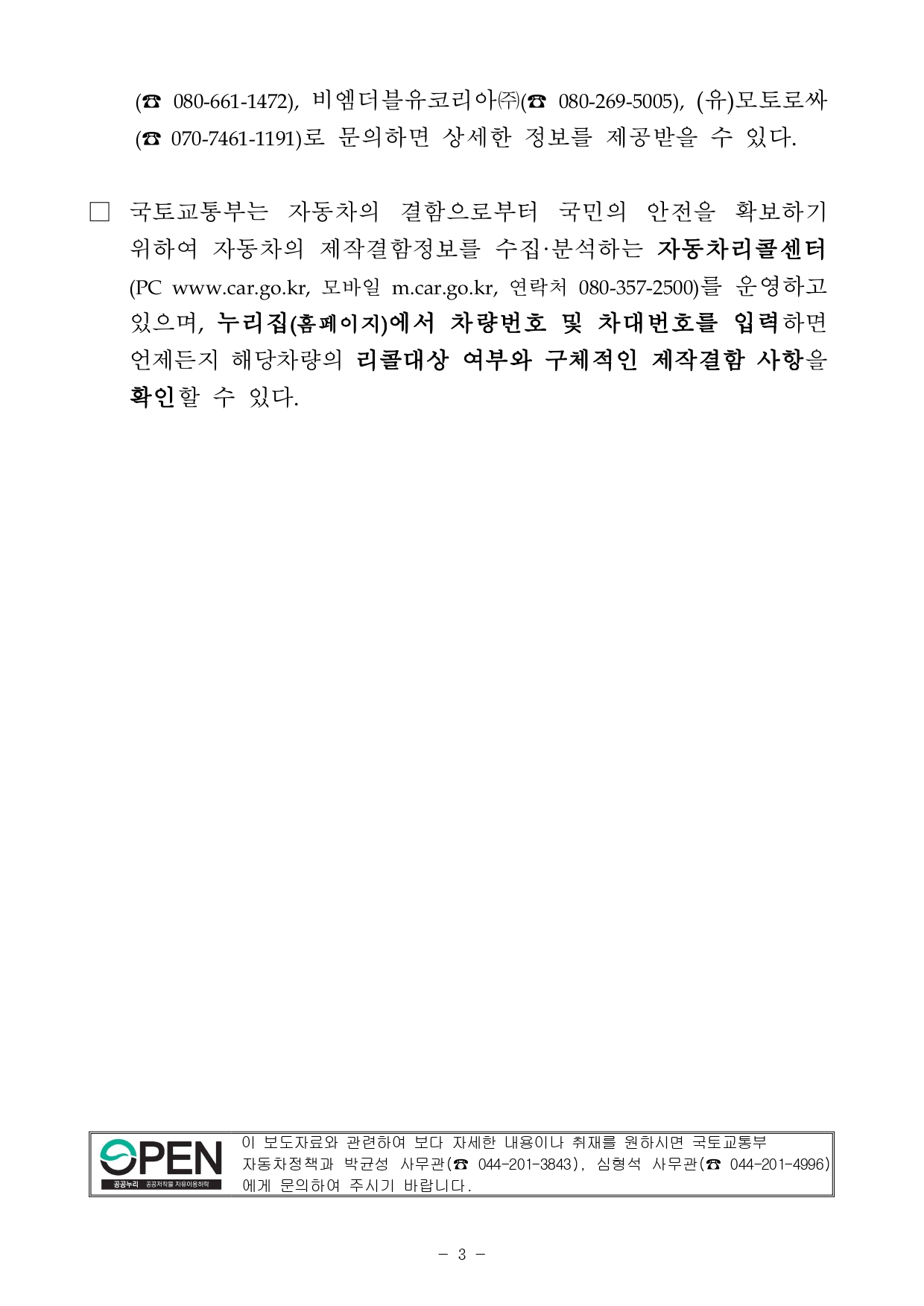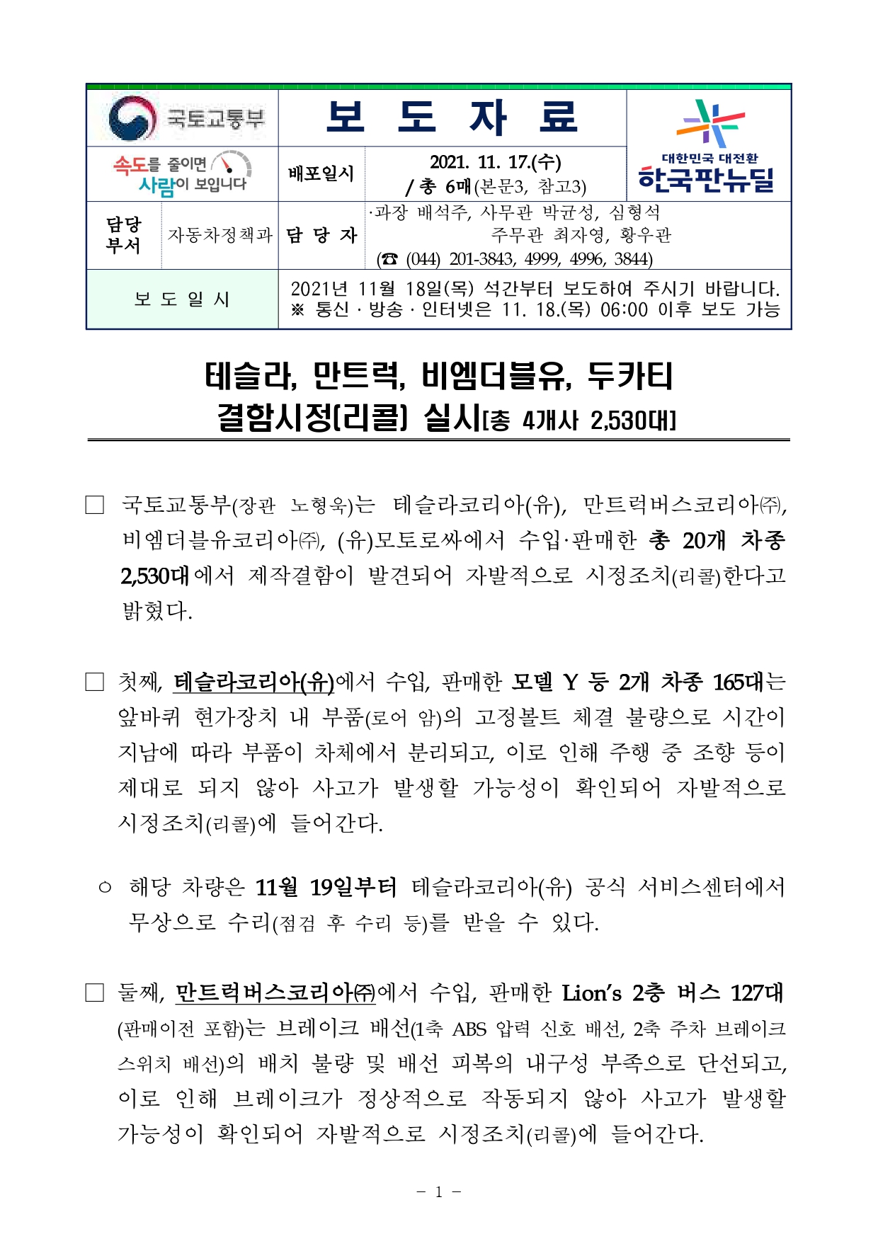 □ 국토교통부(장관 노형욱)는 테슬라코리아(유), 만트럭버스코리아㈜, 비엠더블유코리아㈜, (유)모토로싸에서 수입·판매한 총 20개 차종 2,530대에서 제작결함이 발견되어 자발적으로 시정조치(리콜)한다고 밝혔다.