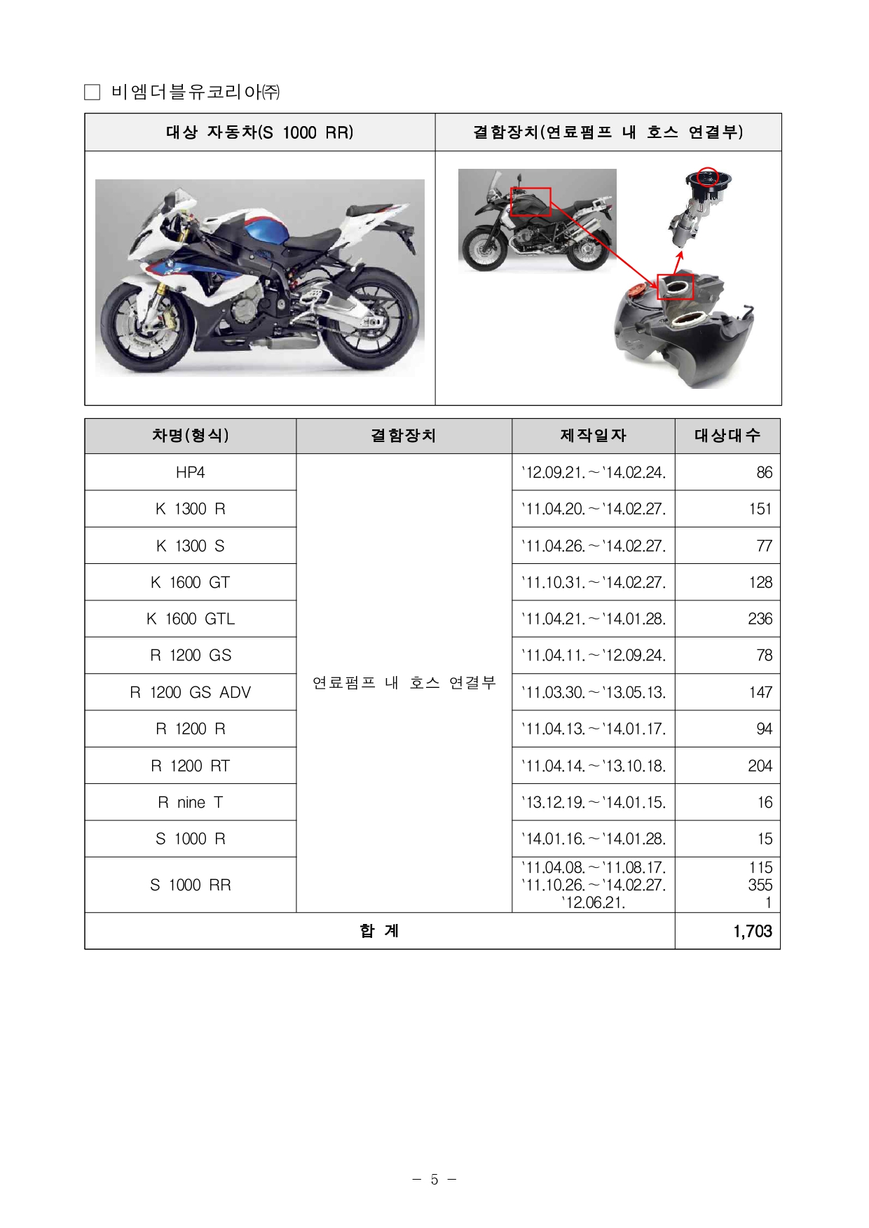 □ 셋째, 비엠더블유코리아㈜에서 수입, 판매한 S 1000 RR 등 12개 이륜 차종 1,703대는 연료펌프 내 호스 연결부의 미세한 균열로 연료가 누유 되고, 이로 인해 화재가 발생할 가능성이 확인되어 자발적으로 시정조치(리콜)에 들어간다.