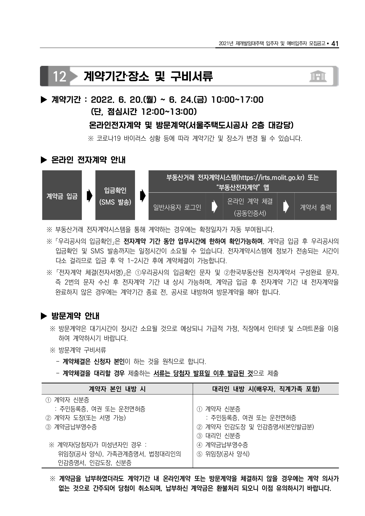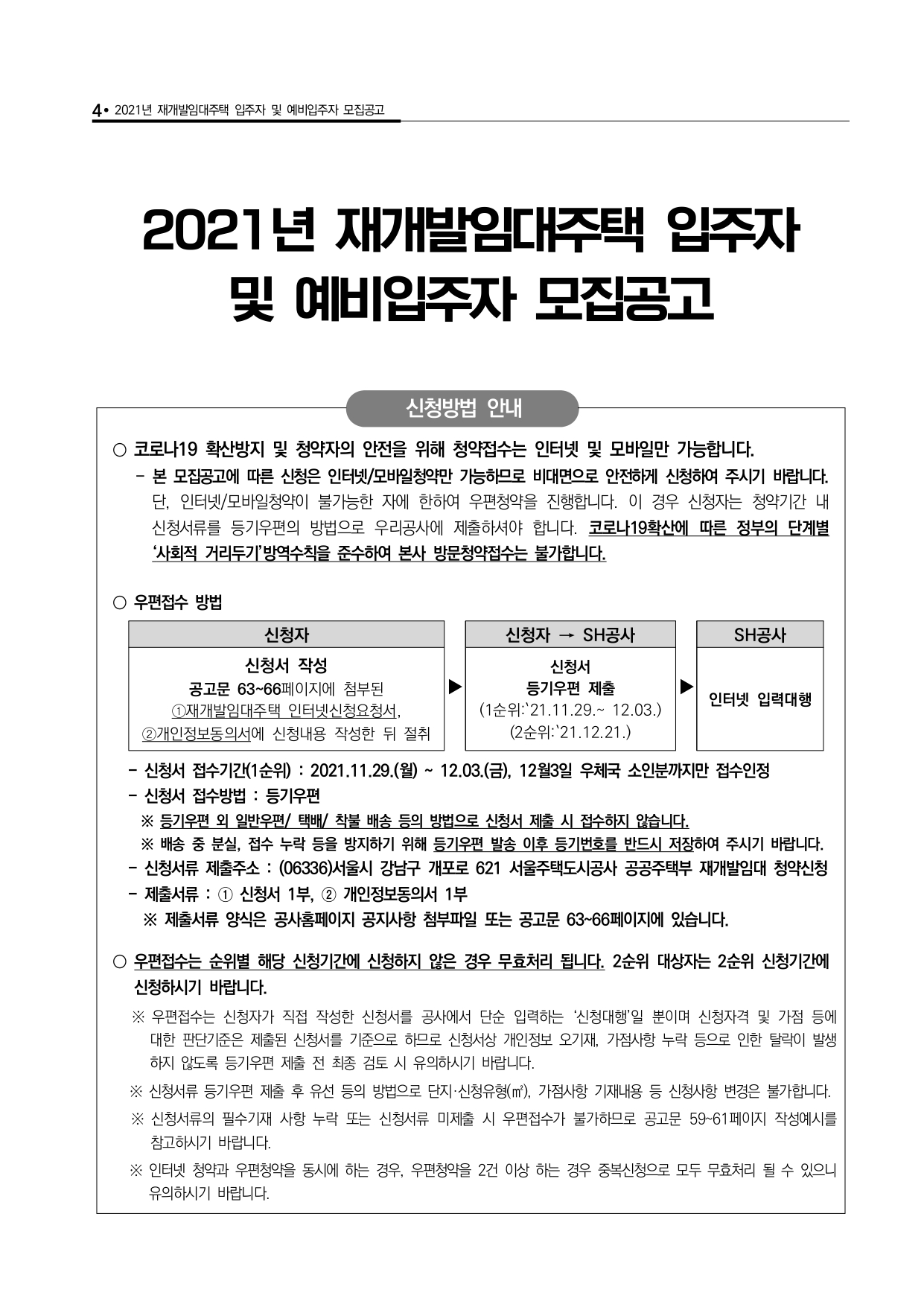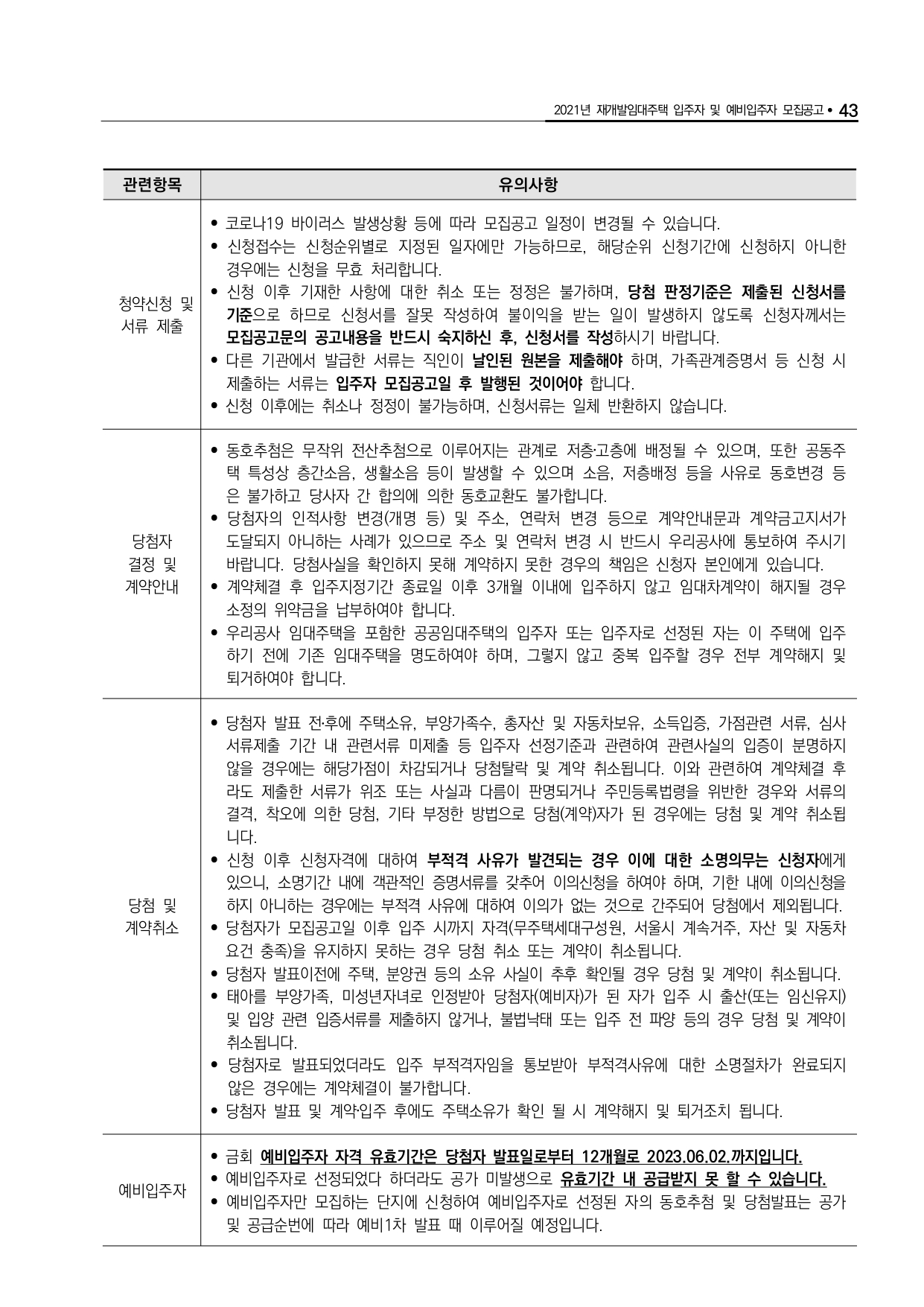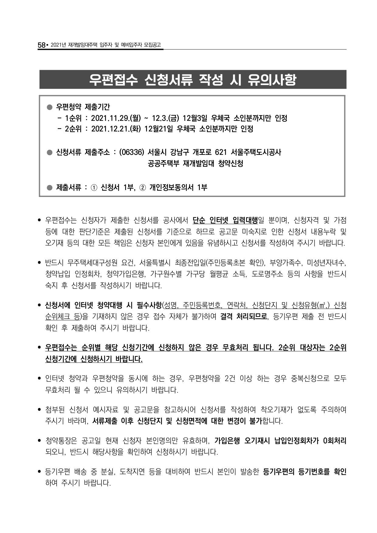 □ 우리 공사에서는 입주자 모집공고 관련 상담을 실시하고 있으나, 신청자 개인의 다양한 상황에 대한 부정확한 정보로 착오안내가 이루어질 수 있으니 청약 관련 상담은 참고자료로만 활용해 주시고 청약자는 공고문 내용을 반드시 숙지 후 신청하시어 청약과정에서 불이익(가점사항 누락 또는 실제보다 낮게 기재, 서류미제출 탈락 등)이 발생하는 일이 없도록 유의하시기 바라며, 이로 인한 모든 책임은 신청자 본인에게 있음을 유념하시기 바랍니다.