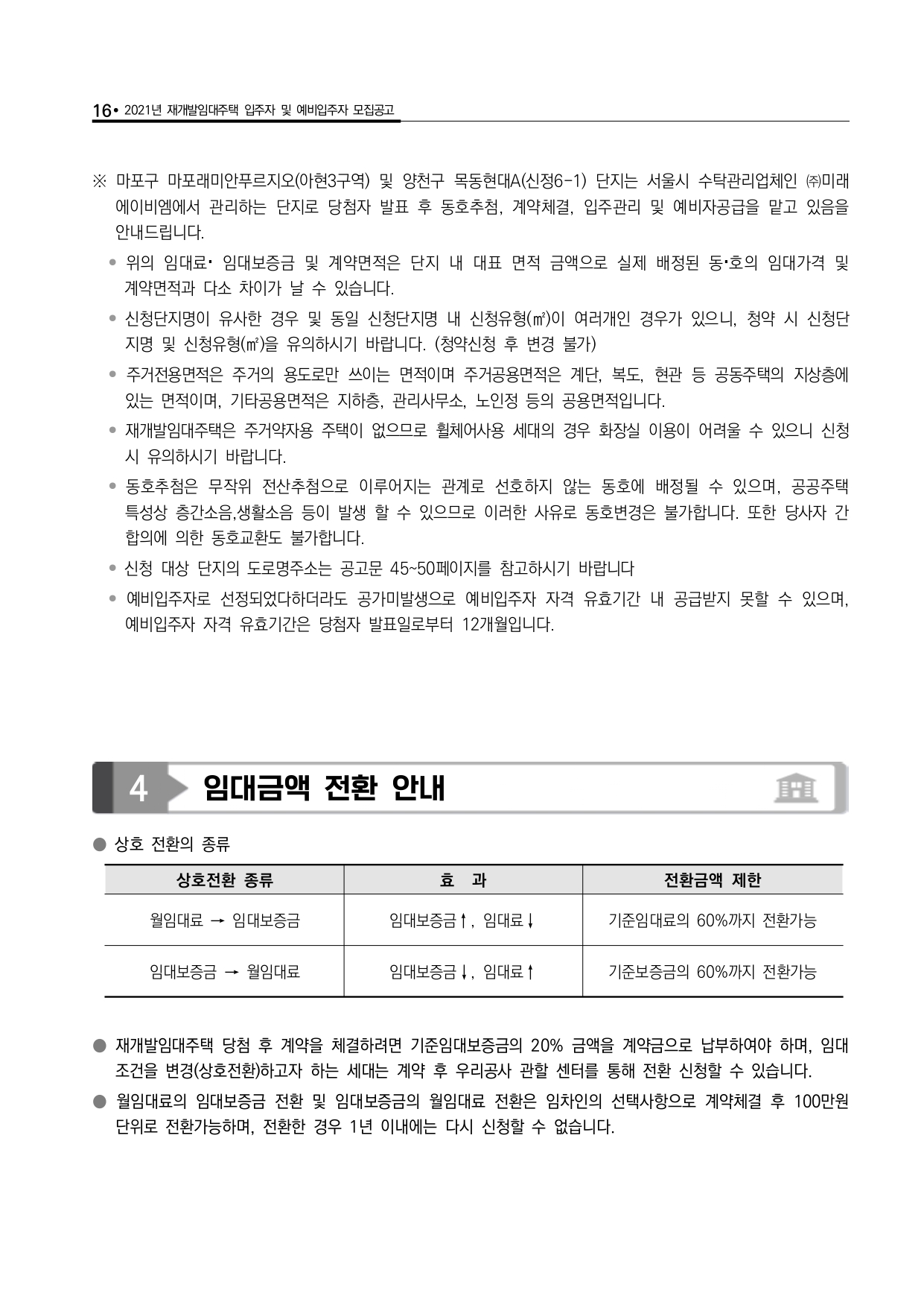 □ 서울주택도시공사에서 공급하는 서울시 재개발임대주택은 재개발사업 철거세입자에게 우선 공급하고 남은 공가를 무주택 시민의 주거안정을 위하여 공급하는 임대주택으로 분양전환 되지 않습니다.