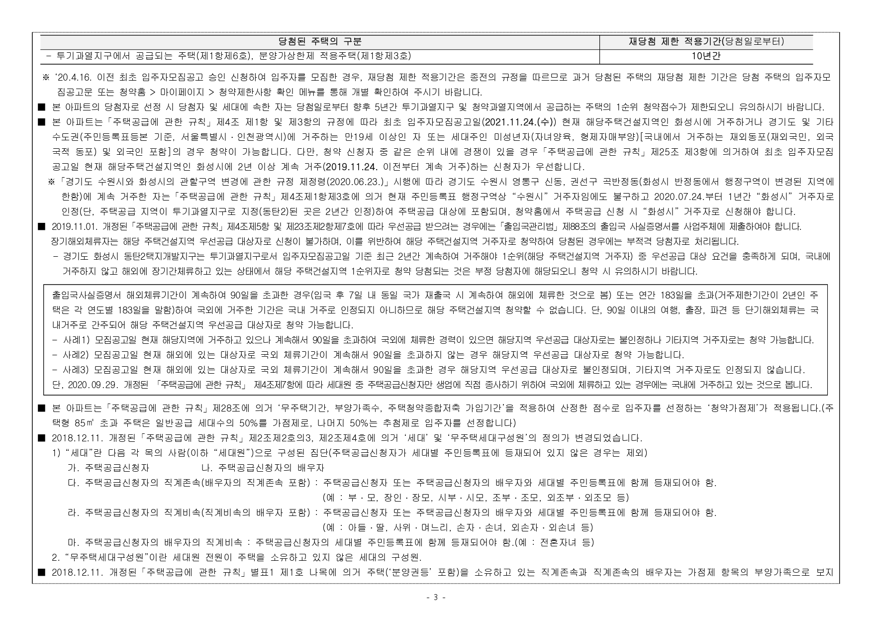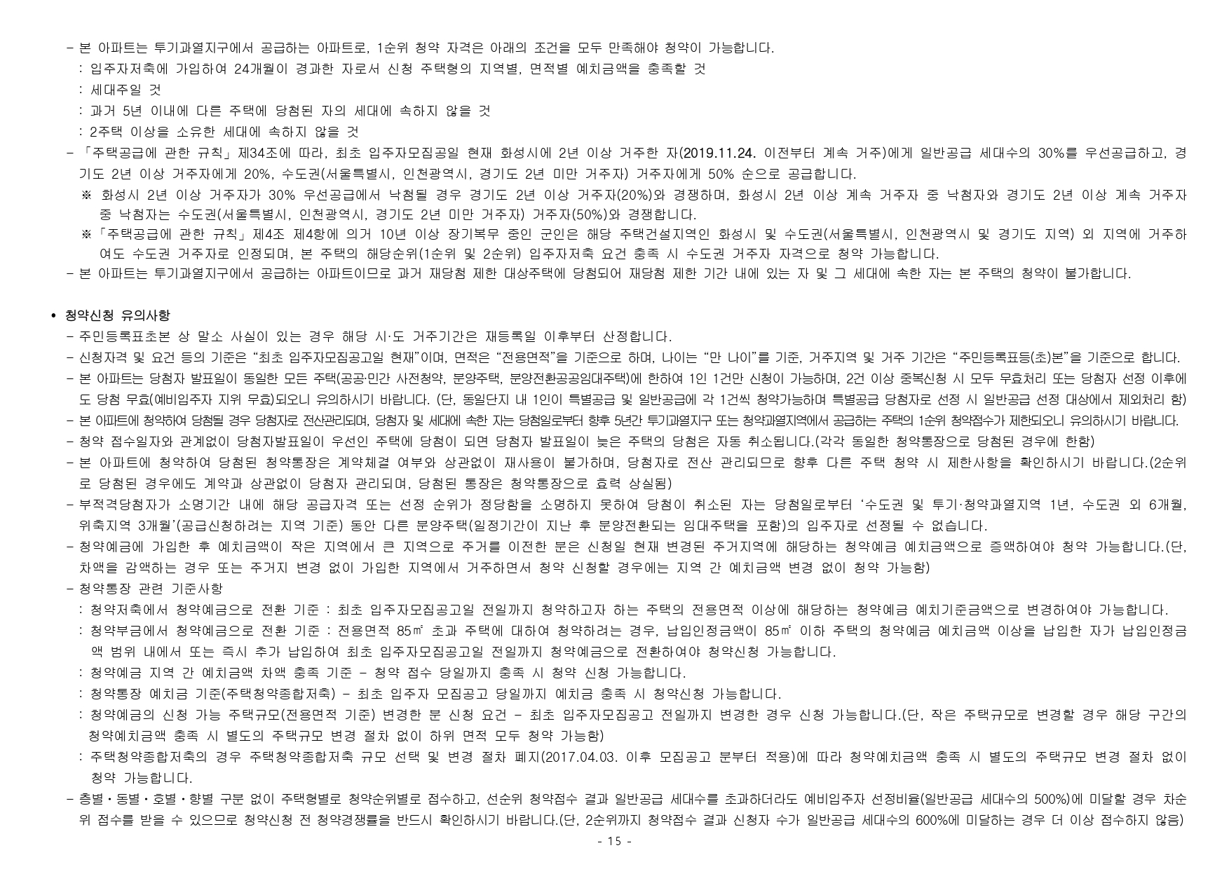■ 해당 주택건설지역(경기도 화성시 동탄2택지개발지구)은「주택법」제63조 및 제63조의2에 의한 투기과열지구 및 청약과열지역으로서, 본 아파트는「주택공급에 관한 규칙」에 따라 1주 택 이상 소유한 세대에 속한 분은 1순위 가점제 청약이 불가하며, 2주택 이상 소유한 세대에 속한 분은 1순위 자격에서 제외됩니다.