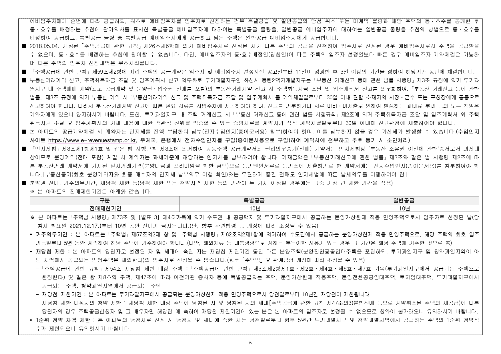 ■ 본 아파트는 수도권 투기과열지구 및 청약과열지역의 대규모 택지개발지구에서 공급하는 분양가상한제 적용 민영주택으로 당첨자로 선정 시「주택공급에 관한 규칙」제54조에 따른 재당첨 제한을 적용받게 되며, 기존 주택 당첨으로 인해 재당첨 제한 기간 내에 있는 자 및 그 세대에 속한 자는 본 아파트 청약이 불가합니다.(단, 본 제도는 당첨된 청약통장의 재사용을 허용하는 제도가 아니므로 당첨된 청약통장은 계약여부와 관계없이 재사용이 불가합니다.)