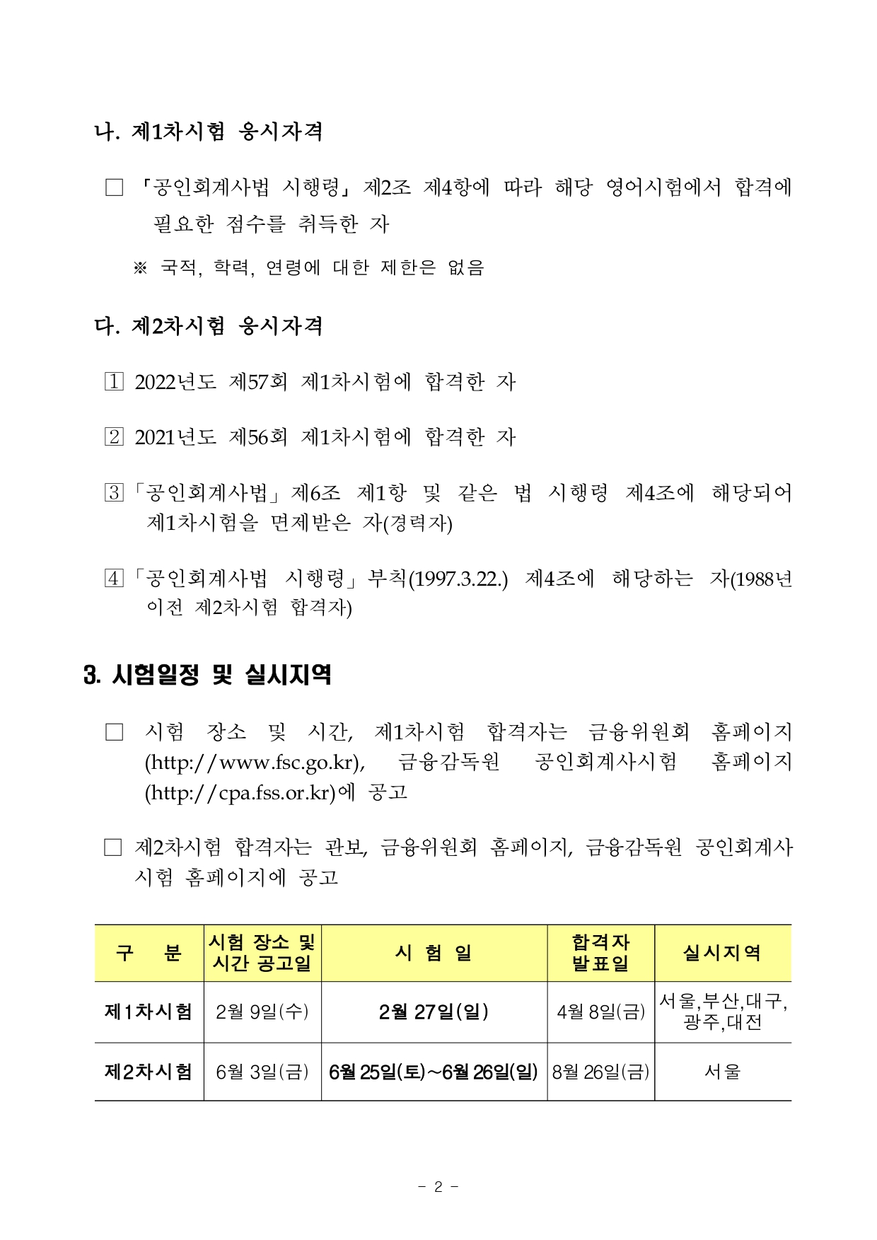 공인회계사법 시행령 제5조에 따라 2022년도 제57회 공인회계사 시험 시행계획을 다음과 같이 공고합니다.