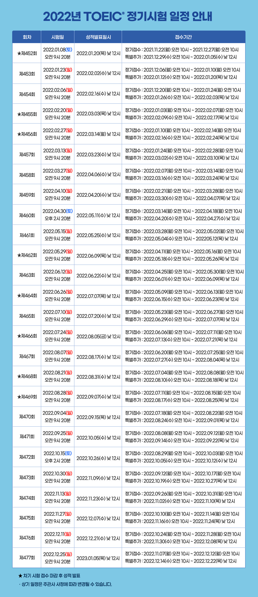 2022 TOEIC 정기시험 일정 안내입니다.