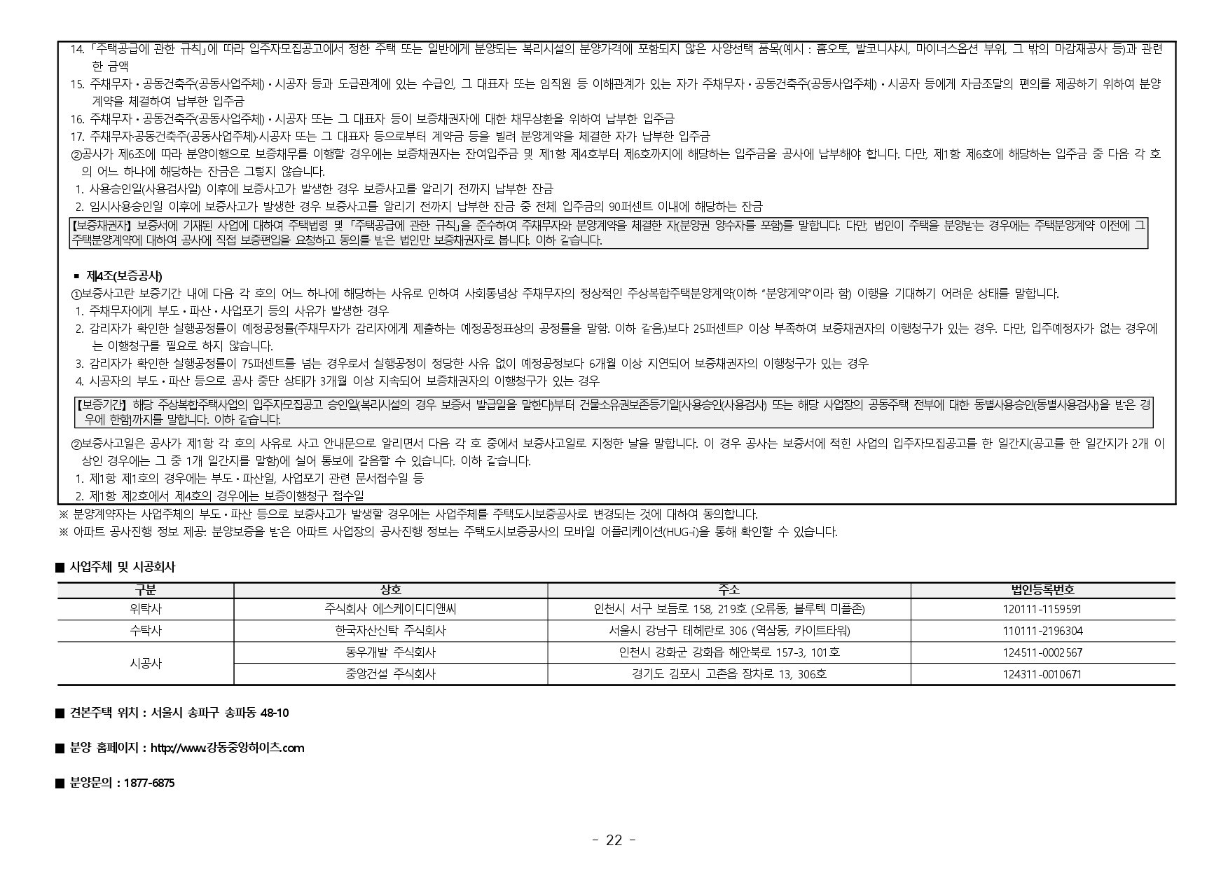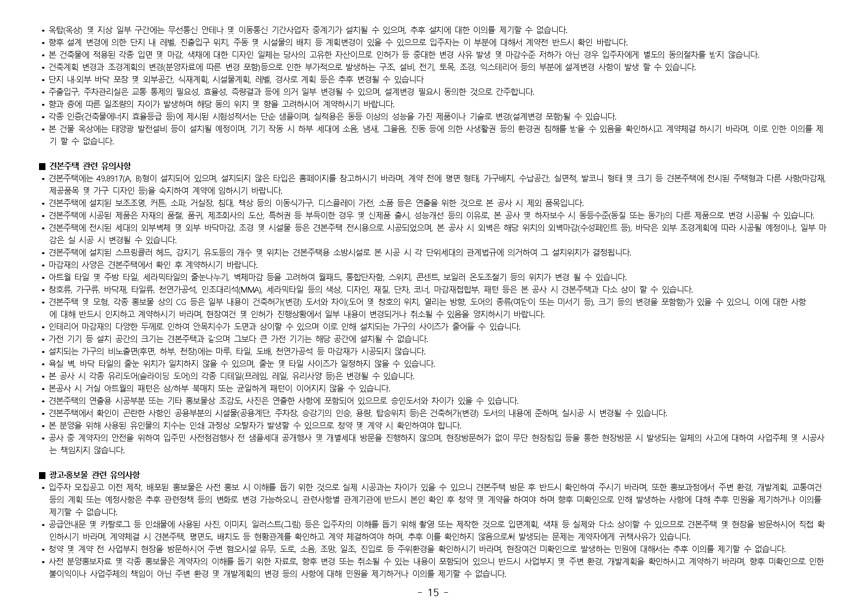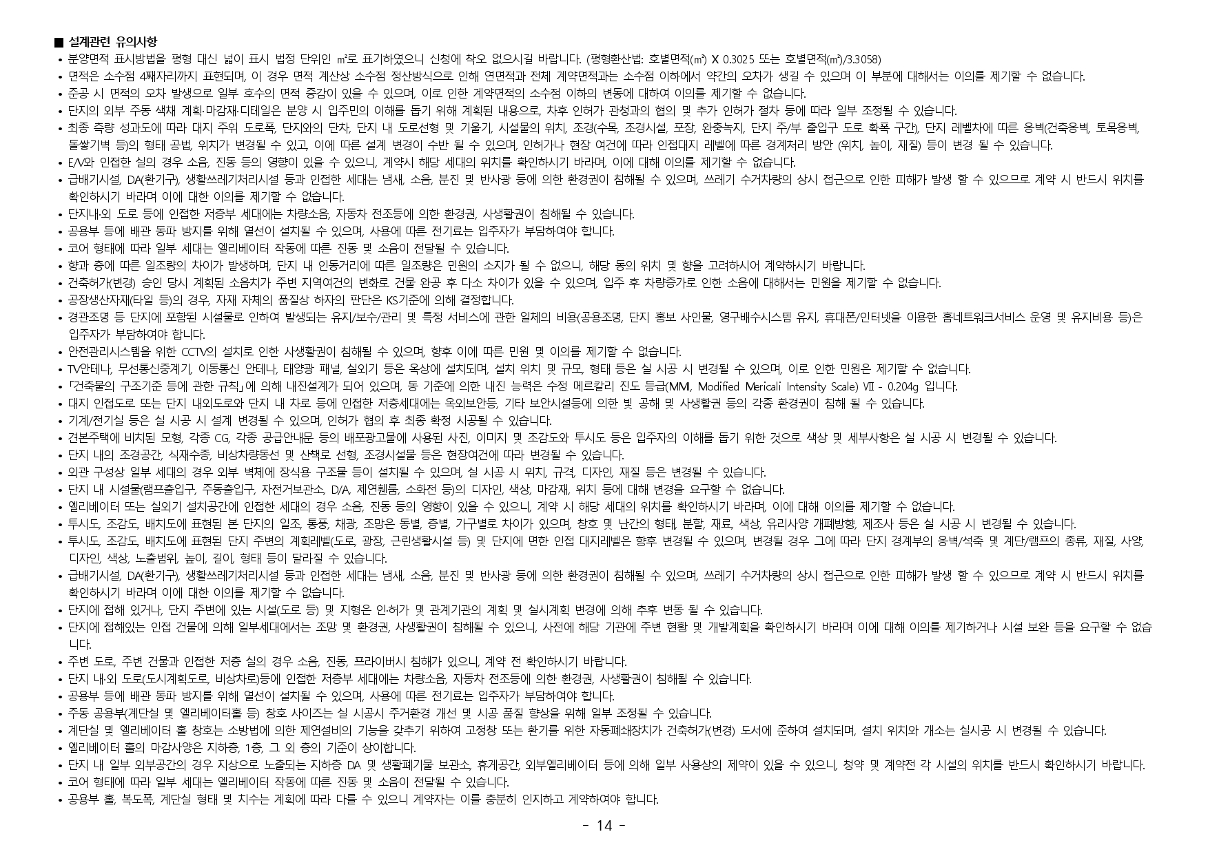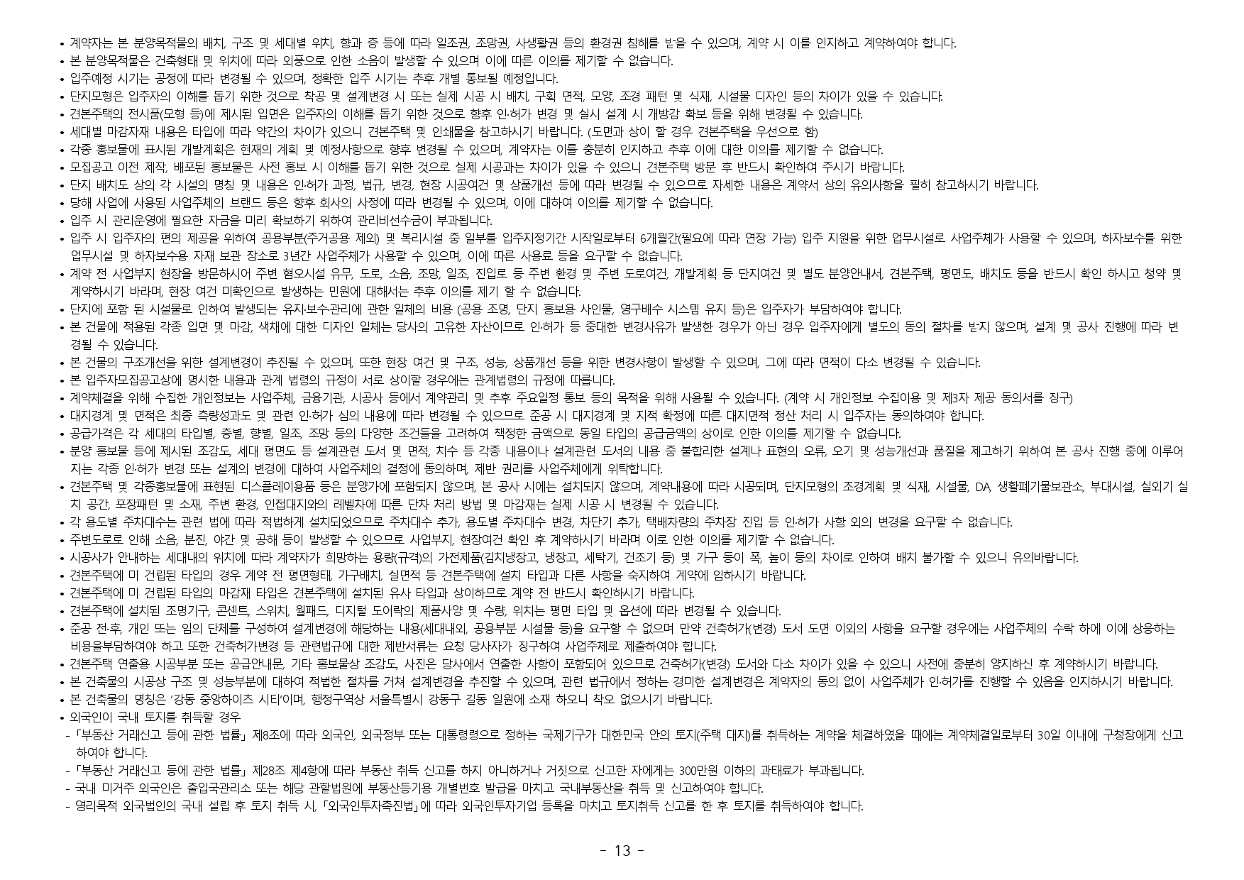 ■ 한국부동산원 청약콜센터(1644-7445)는 청약홈 홈페이지(www.applyhome.co.kr) 이용안내 및 기본적인 청약자격 상담을 하고 있으며, 고객 상담 과정에서 청약자 개인의 다양하고 복잡한 상황에 대한 정확하지 않은 정보의 제공으로 일부 착오 안내가 이루어지는 경우가 있습니다. 청약콜센터 및 견본주택 방문 고객 상담은 청약자의 이해를 돕기 위한 것으로 유의사항 및 제한사항 등 본 모집공고의 내용을 충분히 숙지하시어 자격사항 및 유의 사항 등을 본인이 직접 확인 후 청약신청 또는 계약체결 하시어 불이익을 받는 일이 없도록 하시기 바라며, 미숙지 또는 미확인으로 인한 착오행위 등에 따른 불이익에 대하여는 청약자 및 계약자 본인에게 책임이 있으니 이점 유의하시기 바랍니다.