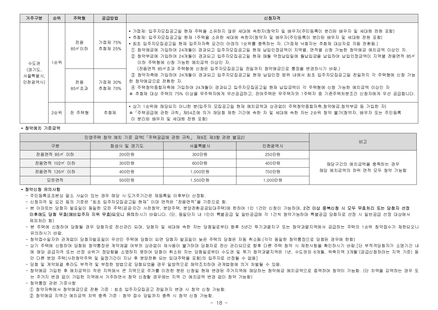 - 해당 주택건설지역(화성시)은 「주택법」 제63조 및 제63조의2에 의한 비투기과열지구 및 청약과열지역(조정대상지역 제1지역)이며, 「수도권 정비계획법」제6조 제1항 규정에 의한 성장관리권역입니다. 본 아파트는 「주택공급에 관한 규칙」에 따라 무주택자 또는 1주택자는 1순위 청약신청이 가능하나, 1주택자는 가점제 청약제한 및 2주택 이상 소유하신 분은 청약 1순위 자격에서 제외됩니다. 주택소유 관한 사항은 「주택공급에 관한 규칙」제53조를 참조하시기 바랍니다.