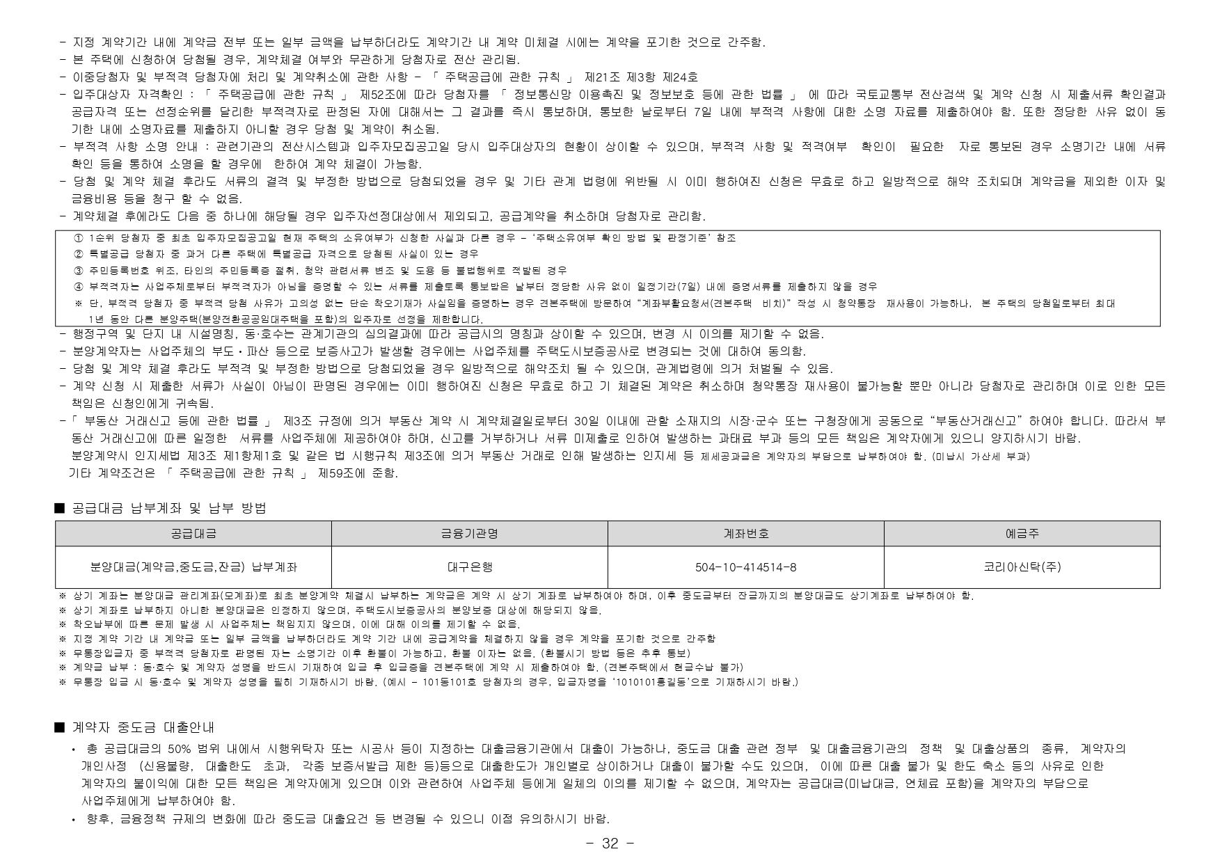 ■ 본 아파트는 수도권 비투기과열지구 및 청약과열지역의 민간택지에서 공급하는 분양가상한제 미적용 민영주택으로 당첨자로 선정시「주택공급에 관한 규칙」제54조에 따른 재당첨 제한을 적용받게 되며 기존 주택 당첨으로 인해 재당첨 제한 기간 내에 있는 자 및 그 세대에 속한 자는 본 아파트 청약이 불가합니다. (단, 본 제도는 당첨된 청약통장의 재사용을 허용하는 제도가 아니므로 당첨된 청약통장은 계약여 부와 관계없이 재사용이 불가합니다.)