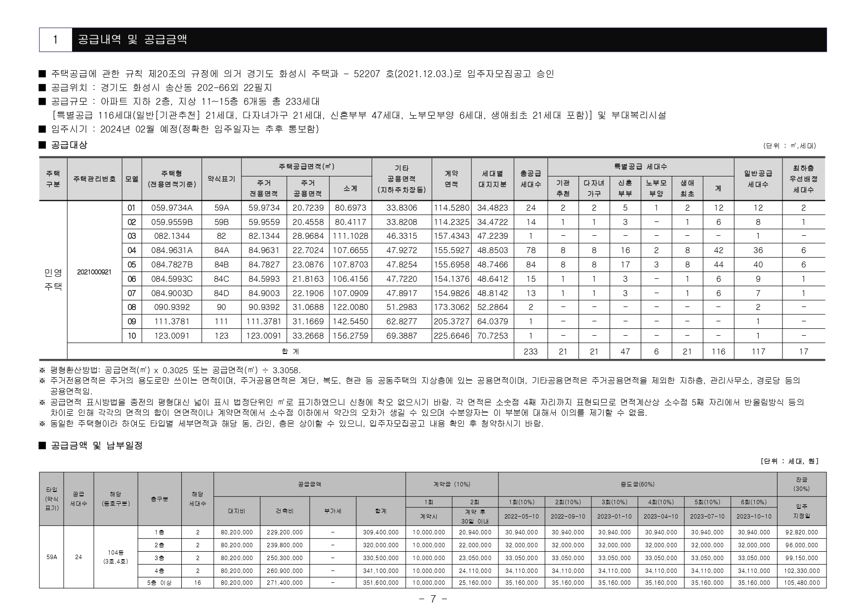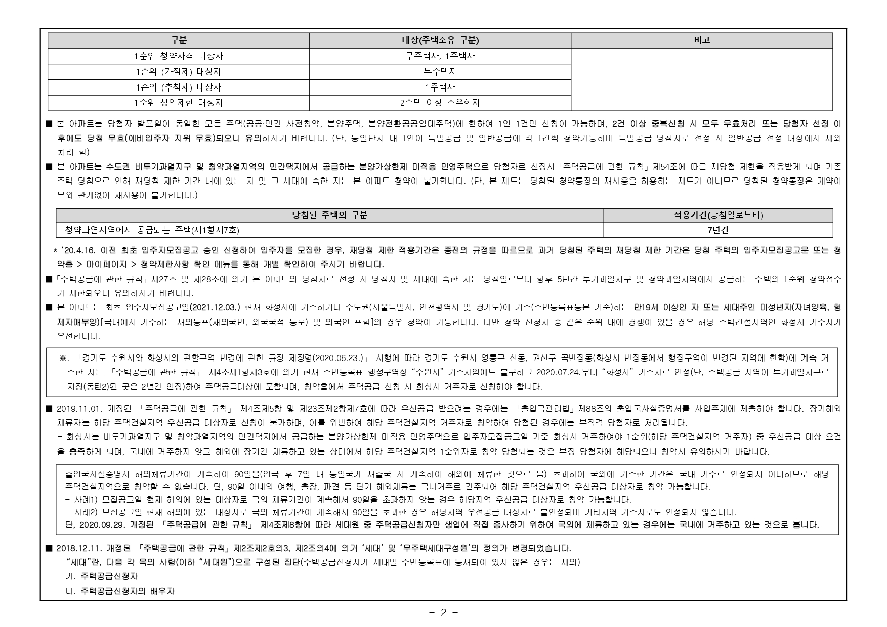 - 해당 주택건설지역(화성시)은 「주택법」 제63조 및 제63조의2에 의한 비투기과열지구 및 청약과열지역(조정대상지역 제1지역)이며, 「수도권 정비계획법」제6조 제1항 규정에 의한 성장관리권역입니다. 본 아파트는 「주택공급에 관한 규칙」에 따라 무주택자 또는 1주택자는 1순위 청약신청이 가능하나, 1주택자는 가점제 청약제한 및 2주택 이상 소유하신 분은 청약 1순위 자격에서 제외됩니다. 주택소유 관한 사항은 「주택공급에 관한 규칙」제53조를 참조하시기 바랍니다.