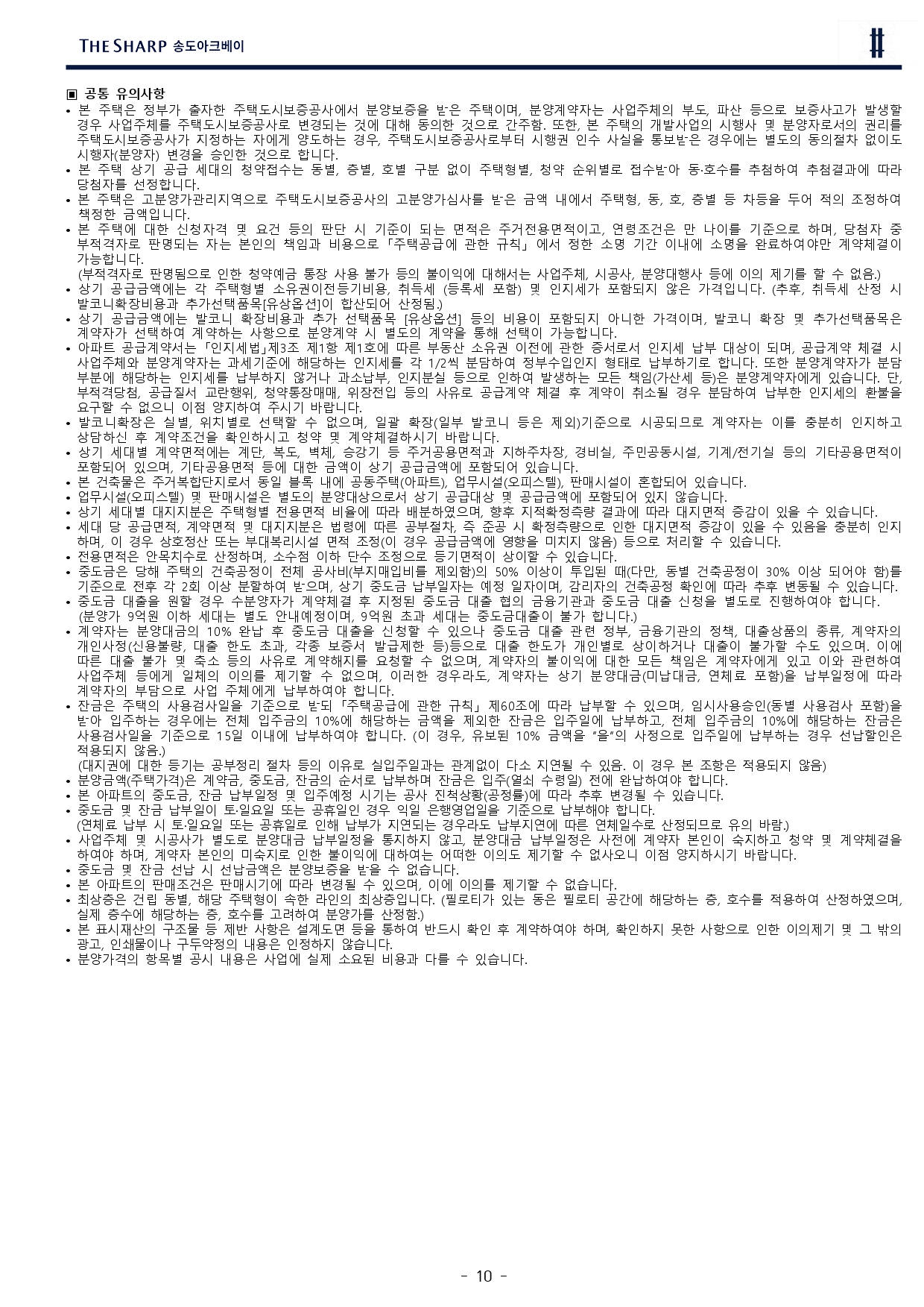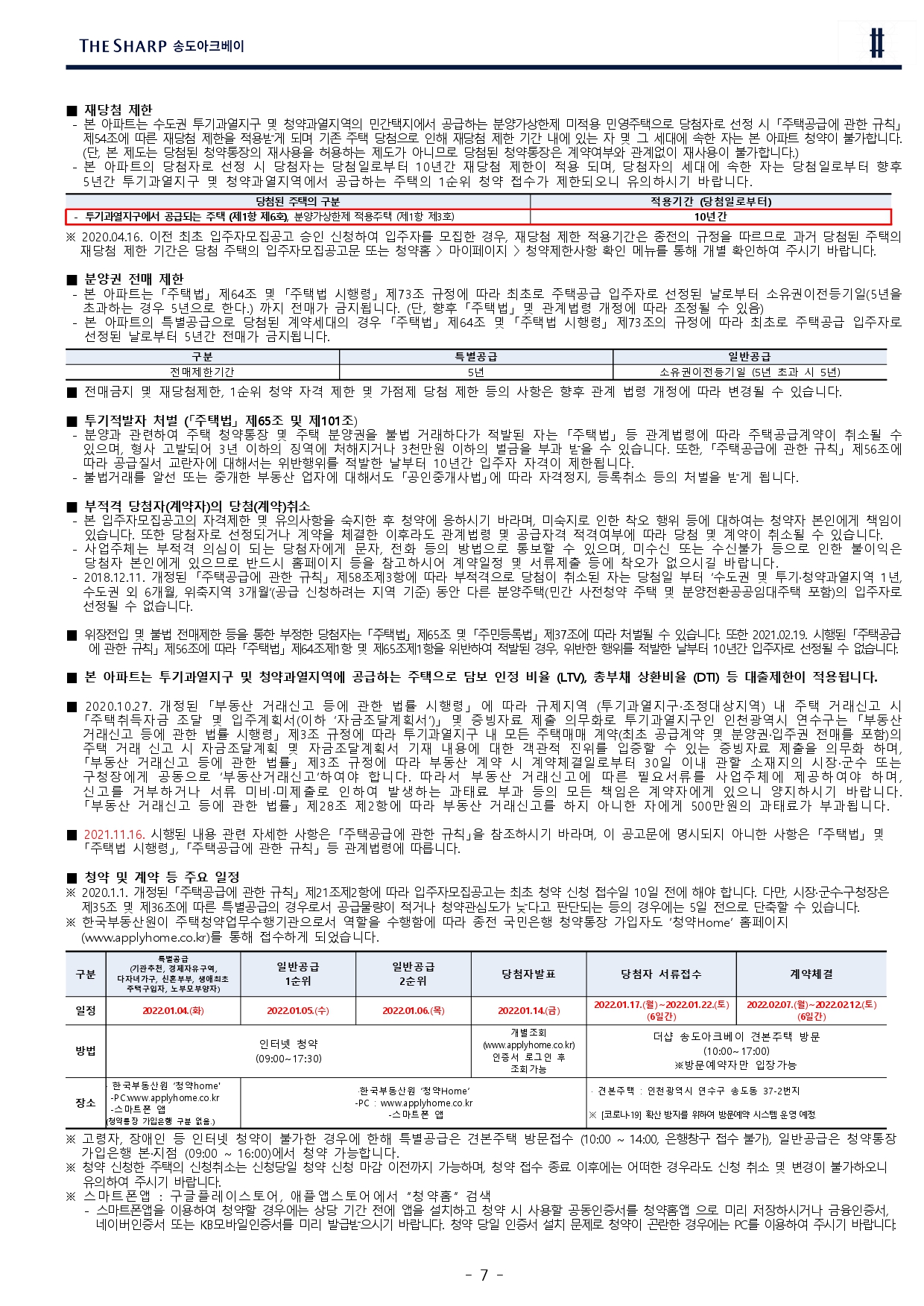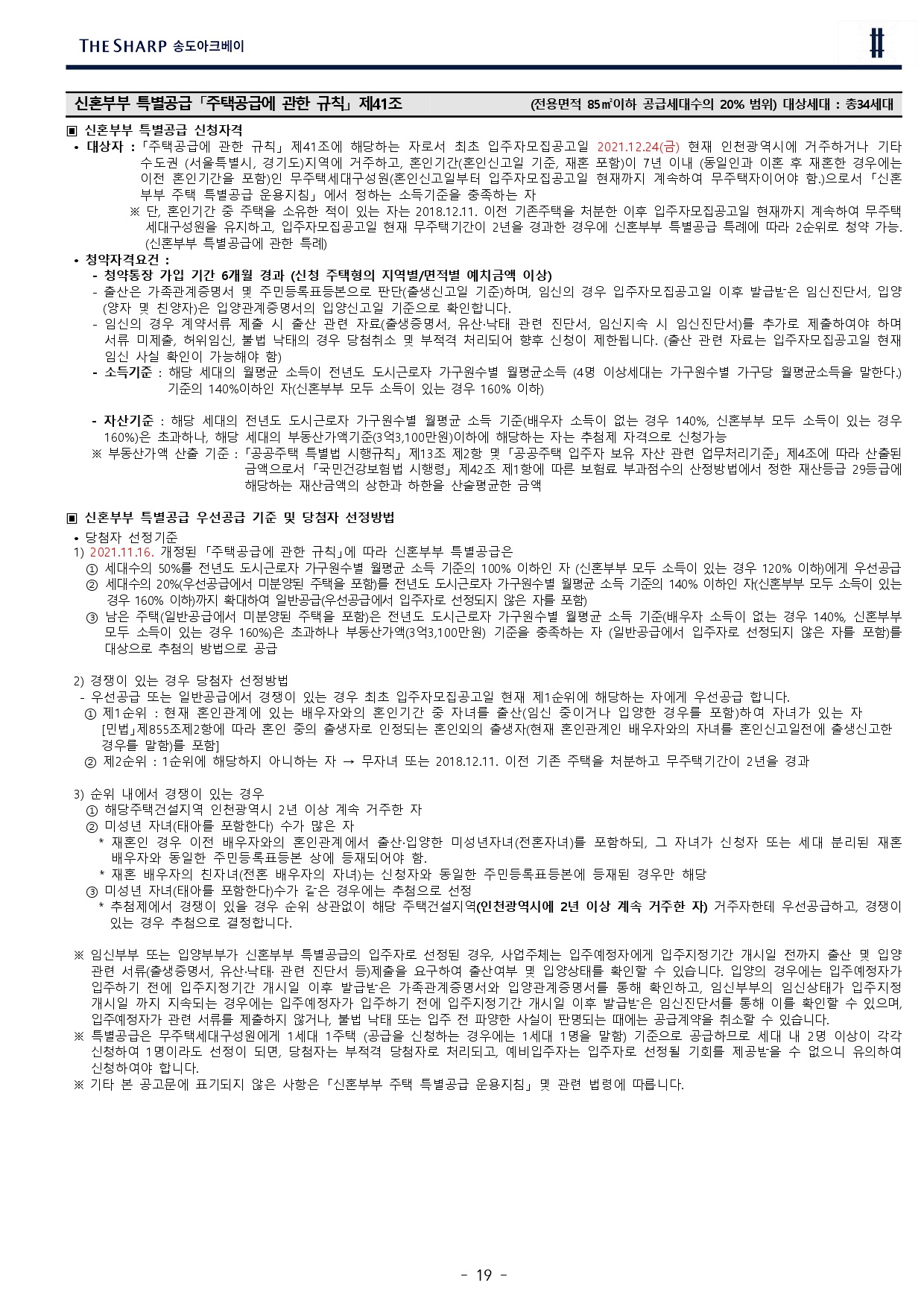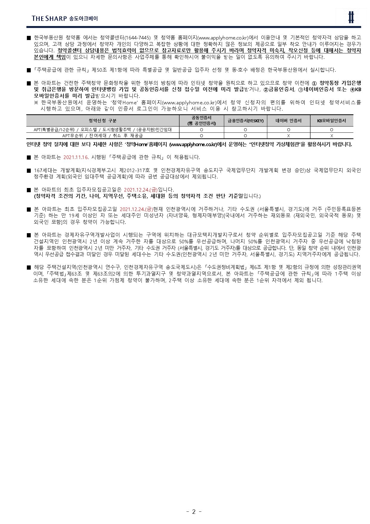 ■ 해당 주택건설지역(인천광역시 연수구, 인천경제자유구역 송도국제도시)은 「수도권정비계획법」 제6조 제1항 및 제2항의 규정에 의한 성장관리권역 이며, 「주택법」제63조 및 제63조의2에 의한 투기과열지구 및 청약과열지역으로서, 본 아파트는 「주택공급에 관한 규칙」에 따라 1주택 이상 소유한 세대에 속한 분은 1순위 가점제 청약이 불가하며, 2주택 이상 소유한 세대에 속한 분은 1순위 자격에서 제외 됩니다.