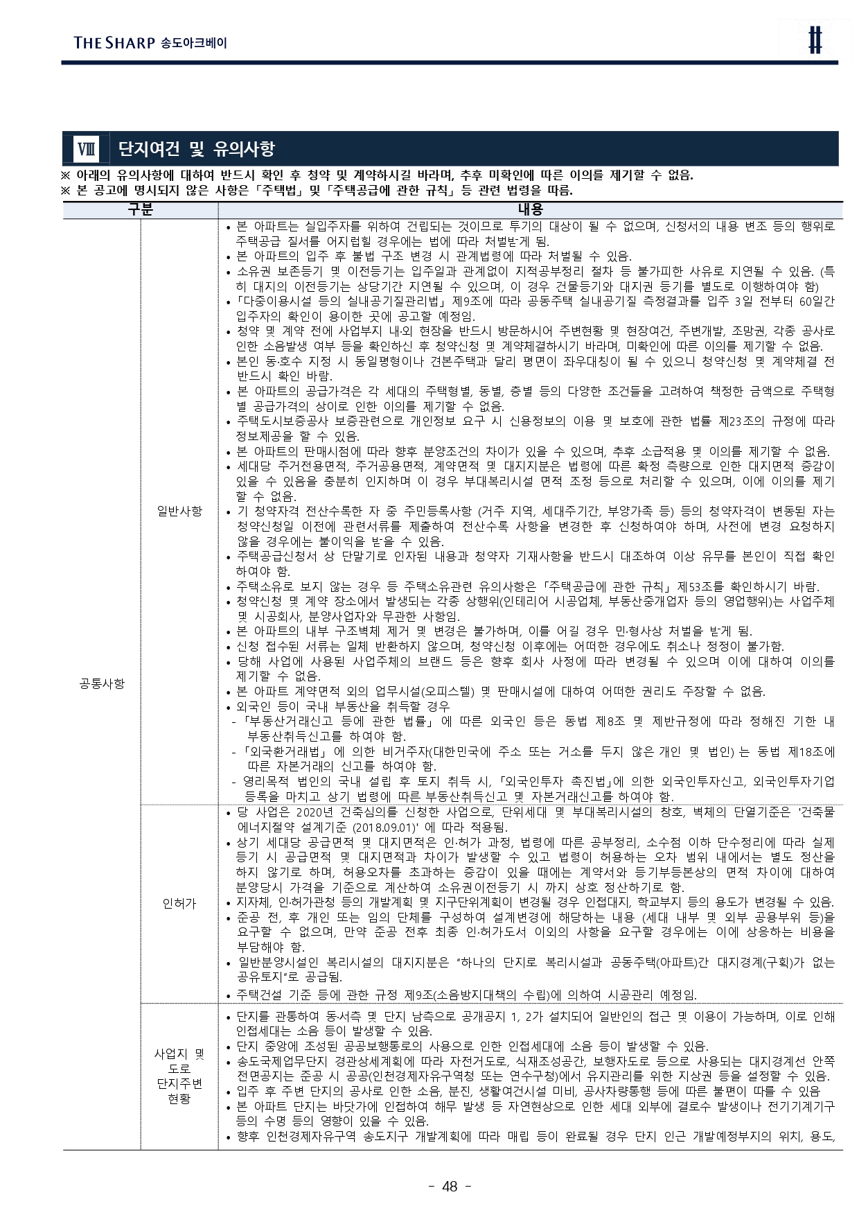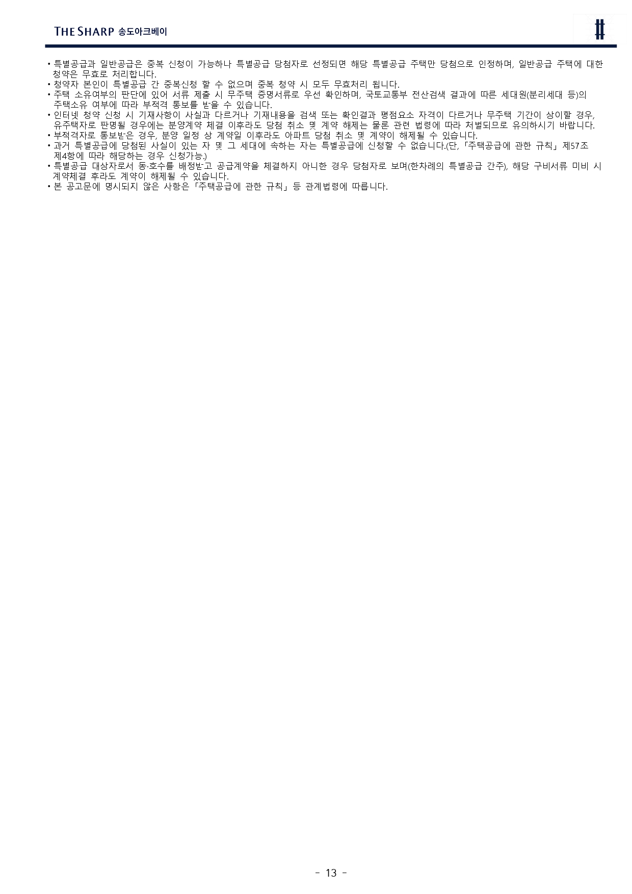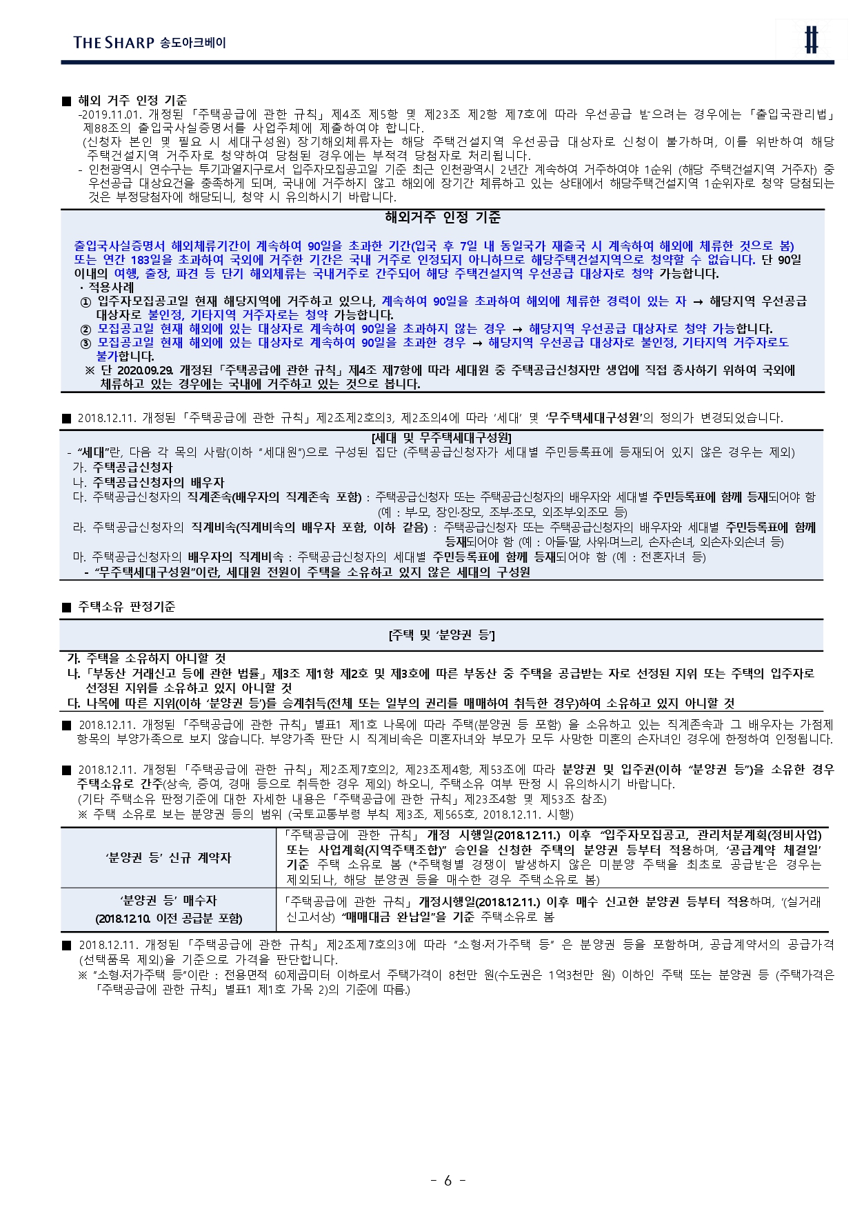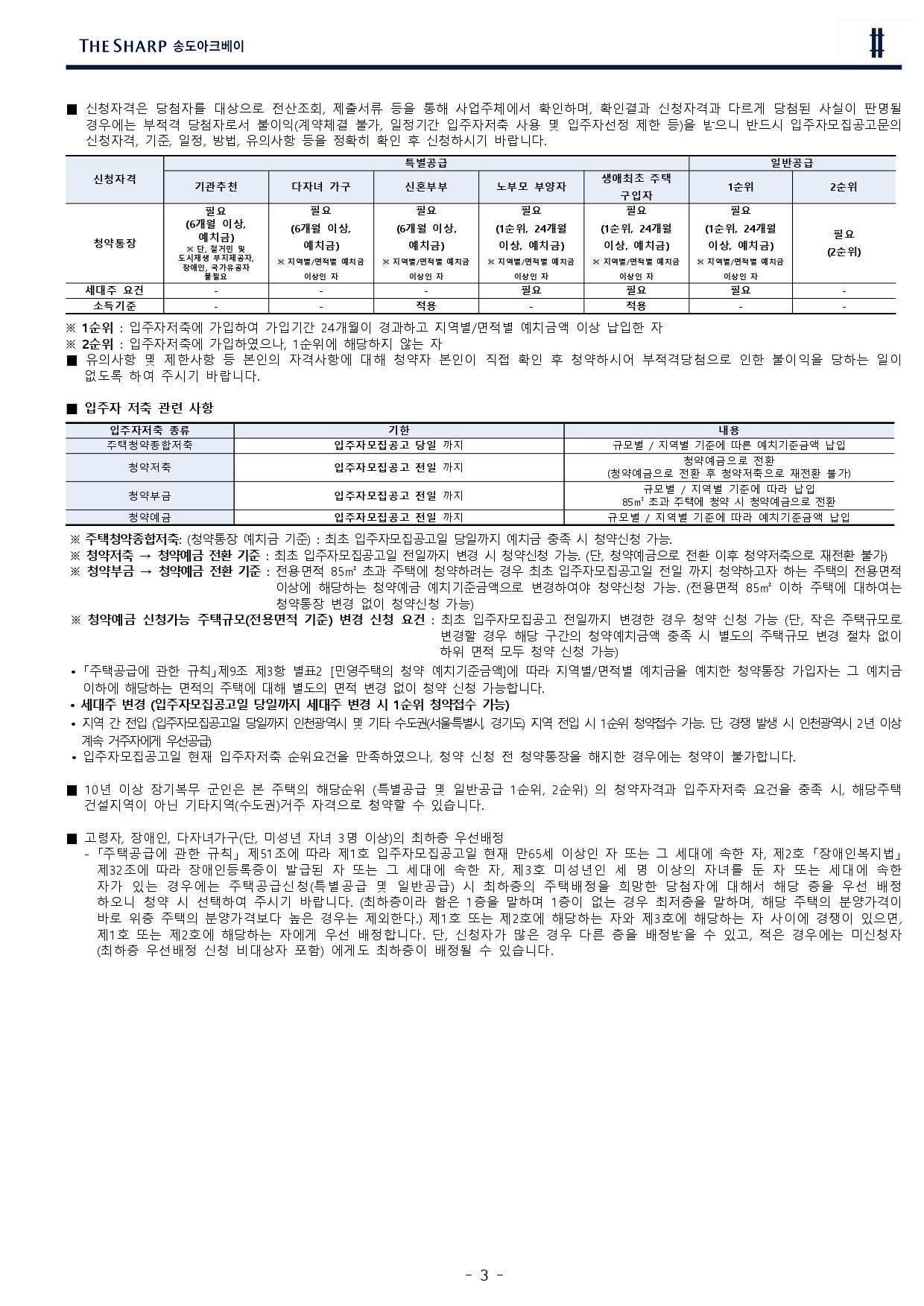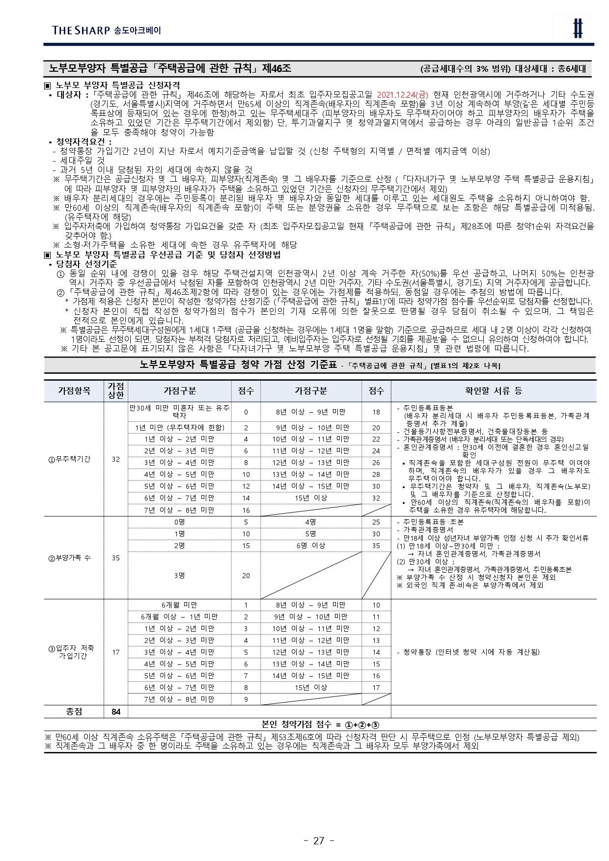 ■ 해당 주택건설지역(인천광역시 연수구, 인천경제자유구역 송도국제도시)은 「수도권정비계획법」 제6조 제1항 및 제2항의 규정에 의한 성장관리권역 이며, 「주택법」제63조 및 제63조의2에 의한 투기과열지구 및 청약과열지역으로서, 본 아파트는 「주택공급에 관한 규칙」에 따라 1주택 이상 소유한 세대에 속한 분은 1순위 가점제 청약이 불가하며, 2주택 이상 소유한 세대에 속한 분은 1순위 자격에서 제외 됩니다.