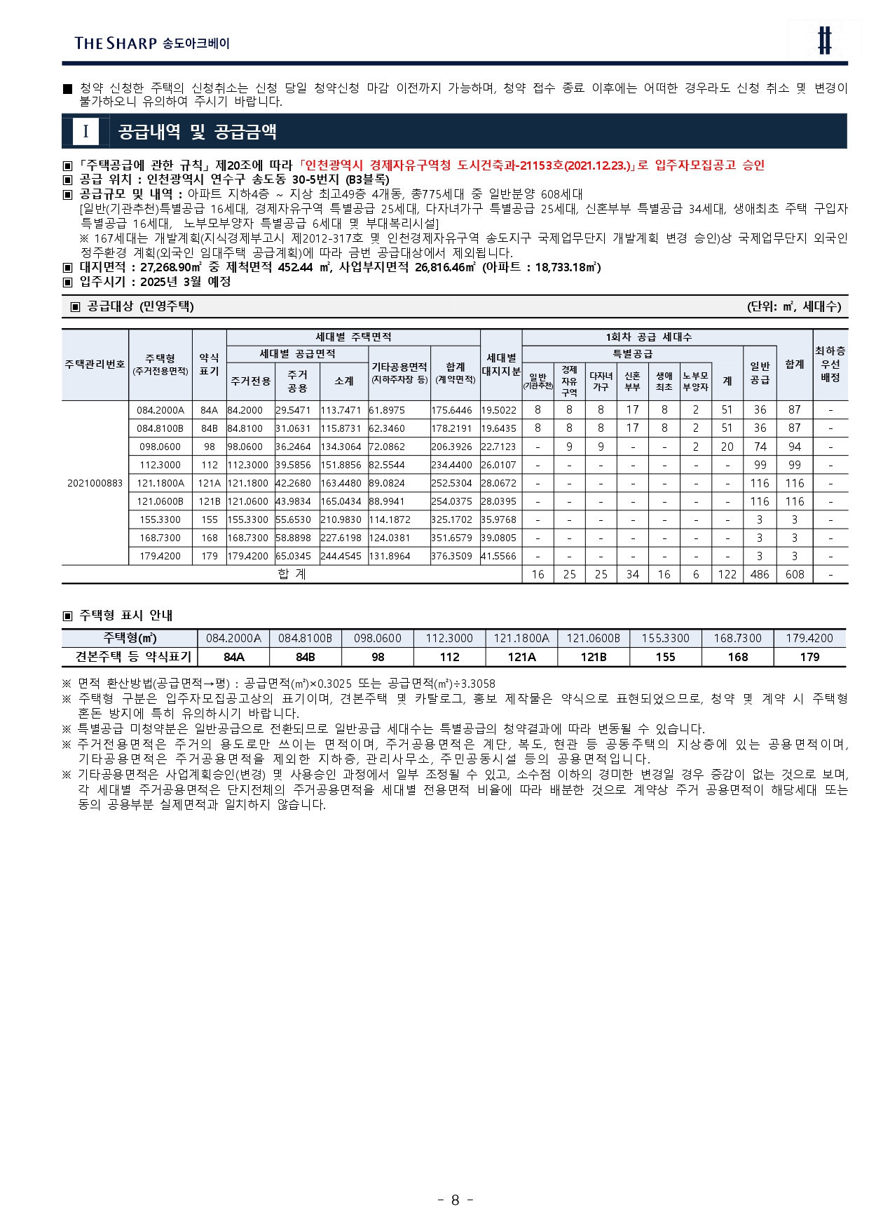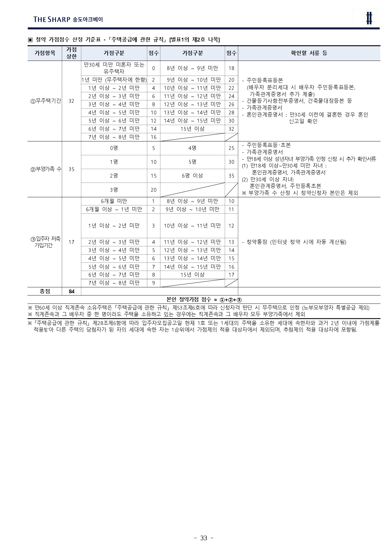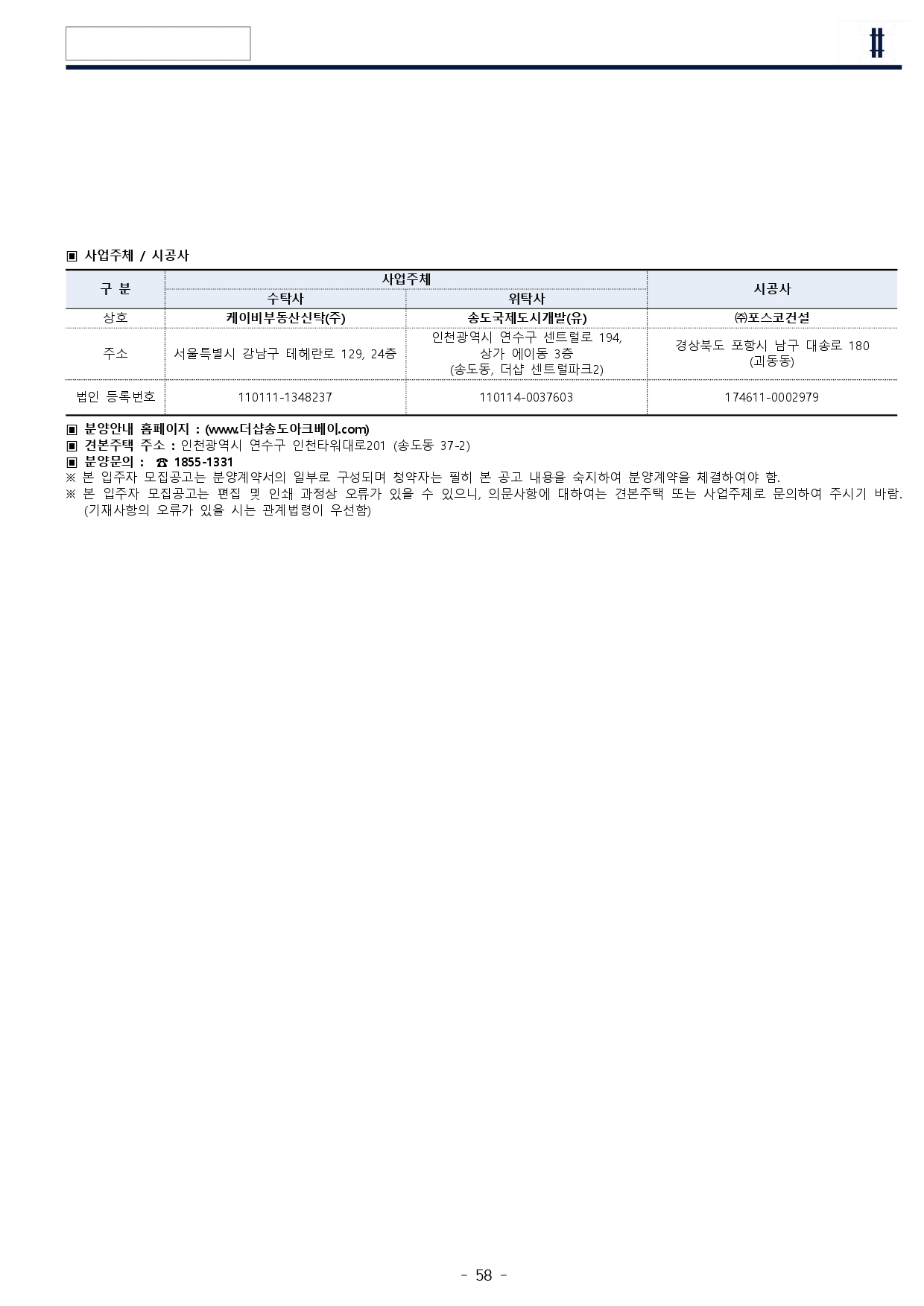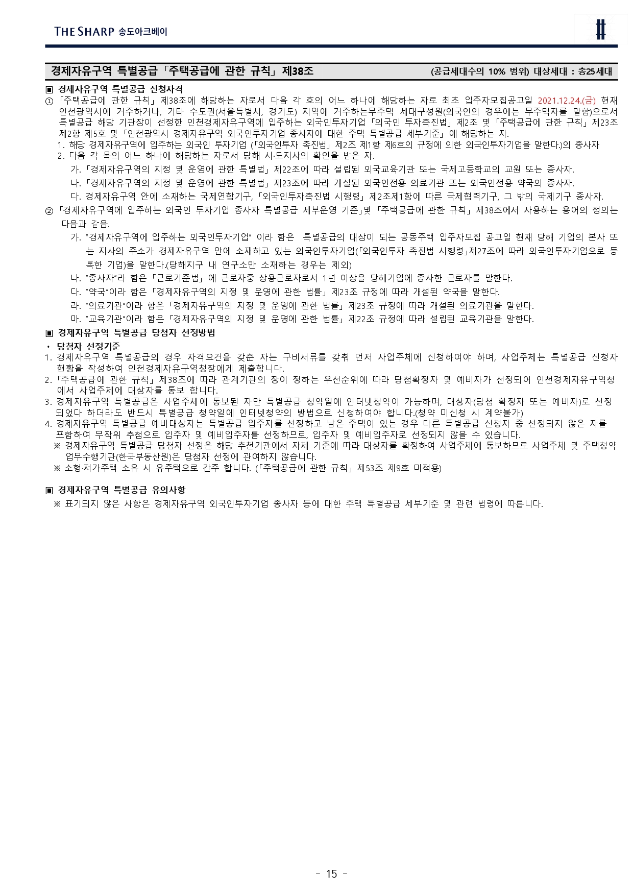 ■ 해당 주택건설지역(인천광역시 연수구, 인천경제자유구역 송도국제도시)은 「수도권정비계획법」 제6조 제1항 및 제2항의 규정에 의한 성장관리권역 이며, 「주택법」제63조 및 제63조의2에 의한 투기과열지구 및 청약과열지역으로서, 본 아파트는 「주택공급에 관한 규칙」에 따라 1주택 이상 소유한 세대에 속한 분은 1순위 가점제 청약이 불가하며, 2주택 이상 소유한 세대에 속한 분은 1순위 자격에서 제외 됩니다.