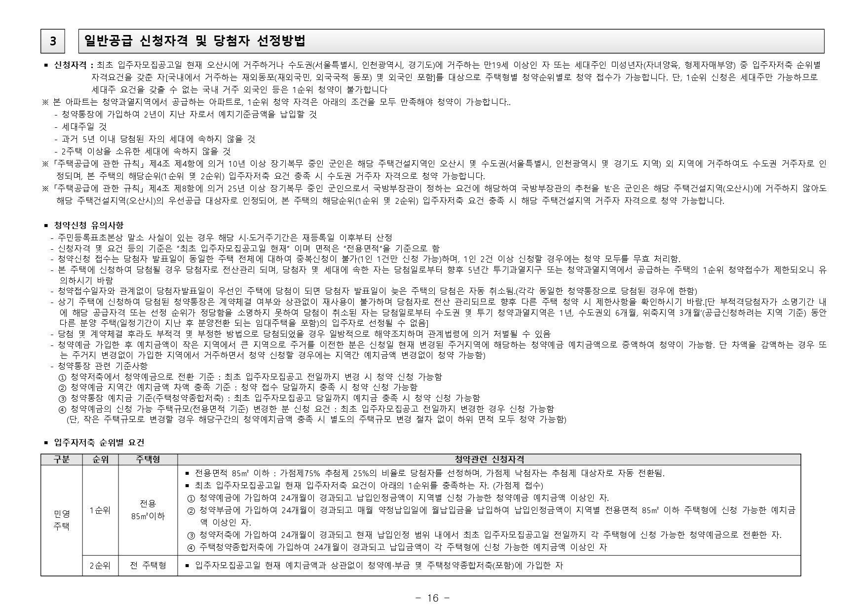 ■ 해당 주택건설지역(경기도 오산시)은 「주택법」 제63조 및 제63조의2에 의한 비투기과열지구 및 청약과열지역이며, 「수도권정비계획법」 제6조 제1항의 규정에 따른 성장관리권역으로서, 본 아파트는 「주택공급에