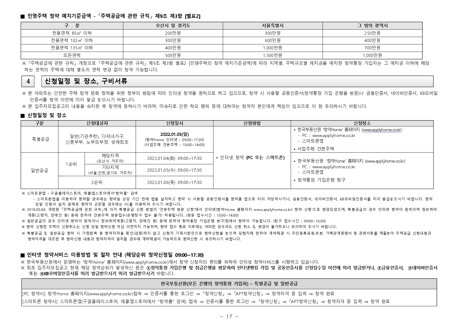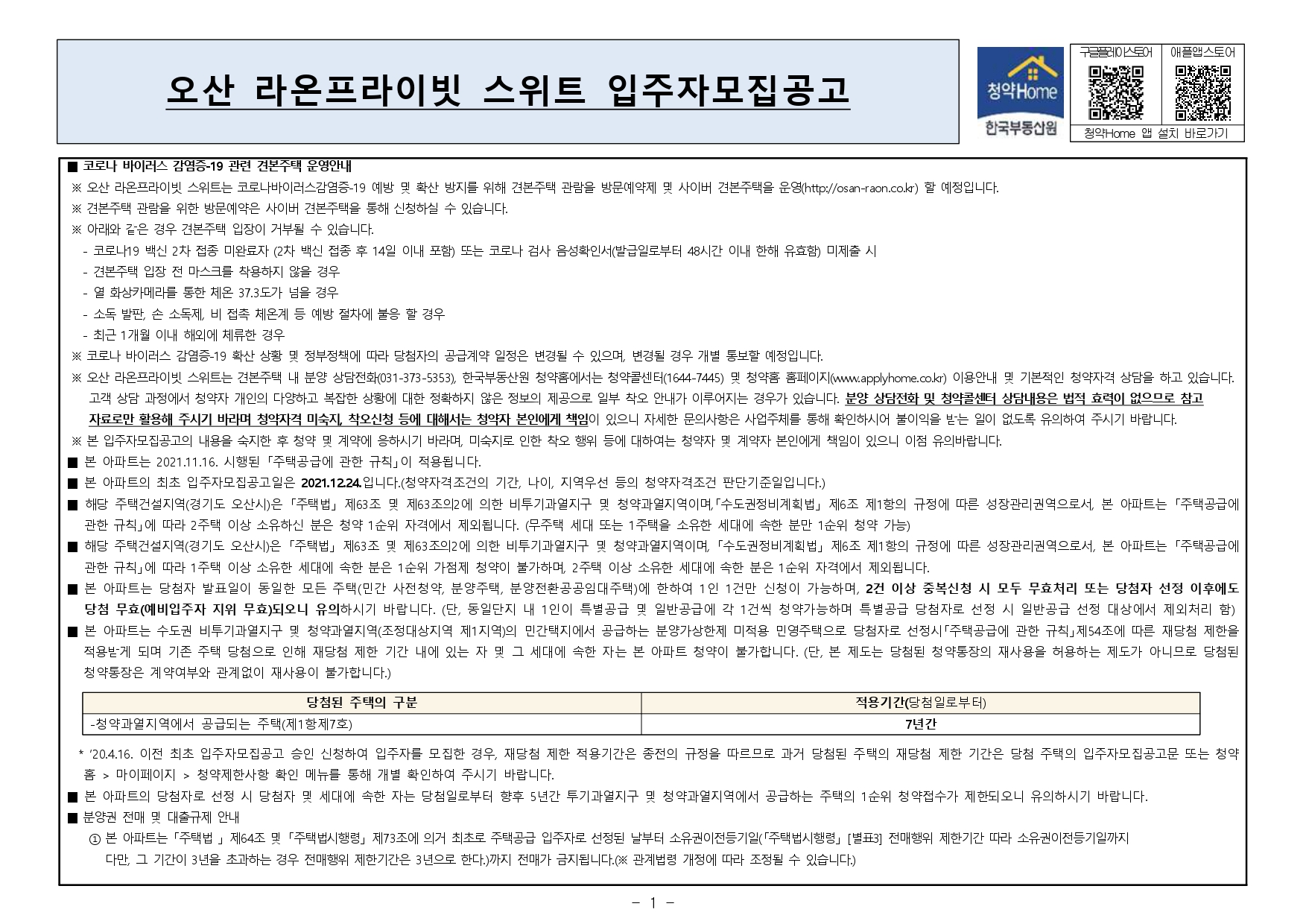■ 해당 주택건설지역(경기도 오산시)은 「주택법」 제63조 및 제63조의2에 의한 비투기과열지구 및 청약과열지역이며, 「수도권정비계획법」 제6조 제1항의 규정에 따른 성장관리권역으로서, 본 아파트는 「주택공급에