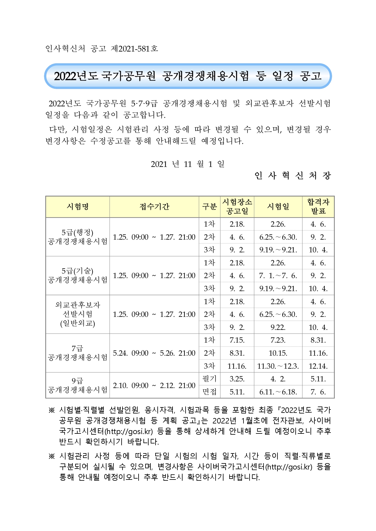 2022년도 국가공무원 5·7·9급 공개경쟁채용시험 및 외교관후보자 선발시험 일정을 다음과 같이 공고합니다. 다만, 시험일정은 시험관리 사정 등에 따라 변경될 수 있으며, 변경될 경우 변경사항은 수정공고를 통해 안내해드릴 예정입니다.