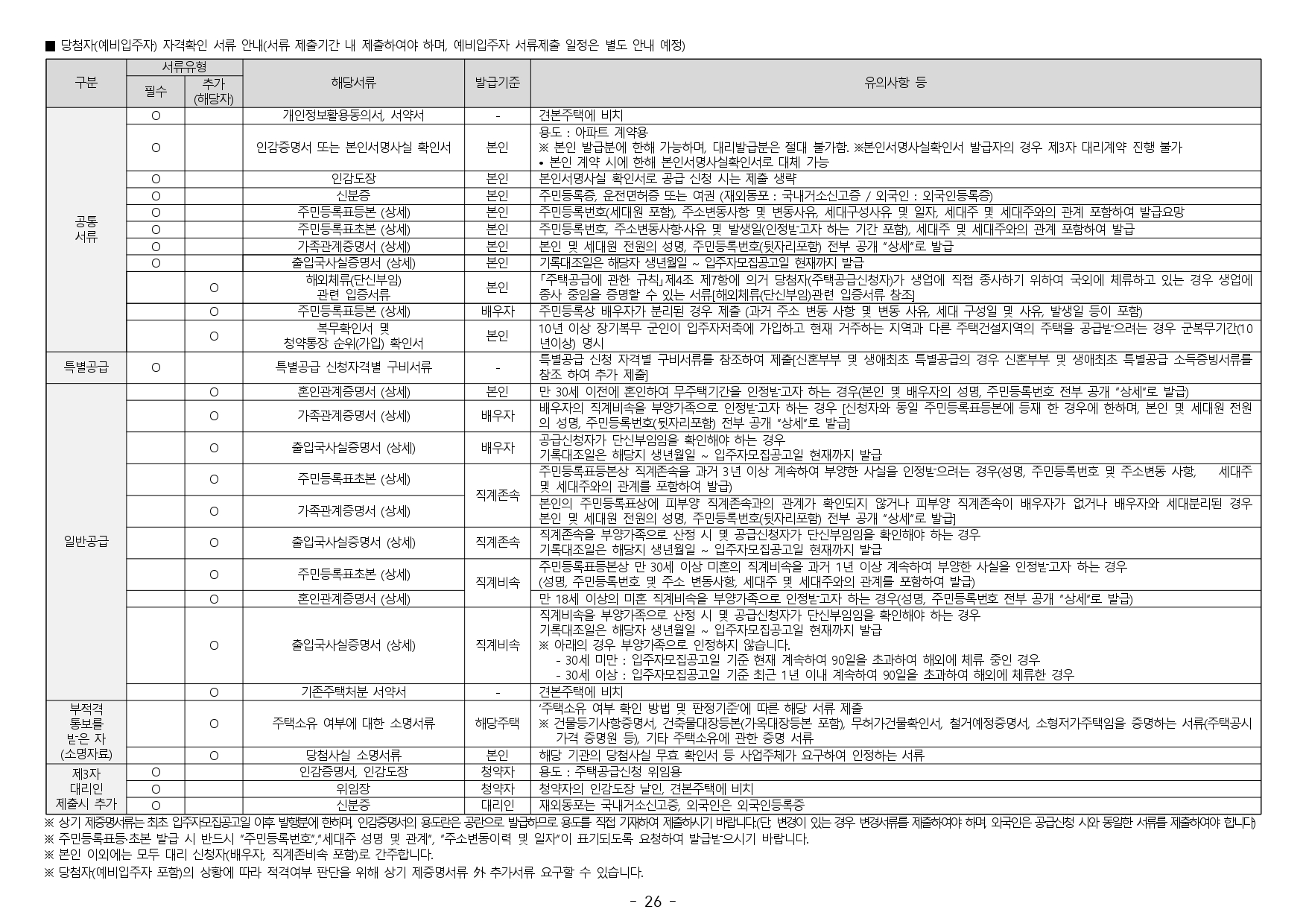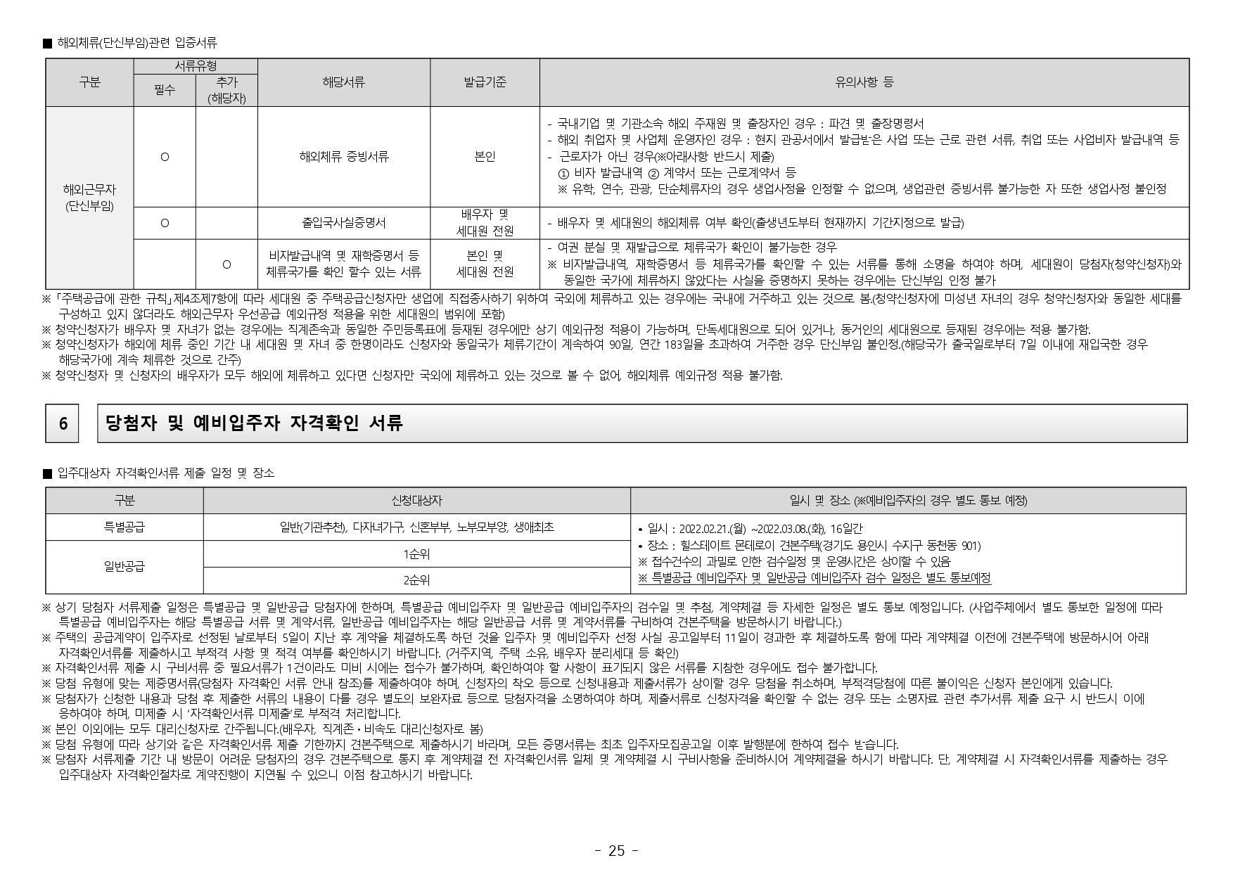 ■ 2019.11.01. 개정된 「주택공급에 관한 규칙」 제4조 제5항 및 제23조 제2항 제7호에 따라 우선공급 받으려는 경우에는 「출입국관리법」제88조의 출입국사실증명서를 사업주체에 제출하여야 합니다. 장기해외체류자는 해당 주택 건설지역 우선공급 대상자로 신청이 불가하며, 이를 위반하여 해당 주택건설지역 거주자로 청약하여 당첨된 경우에는 부적격 당첨자로 처리됩니다.