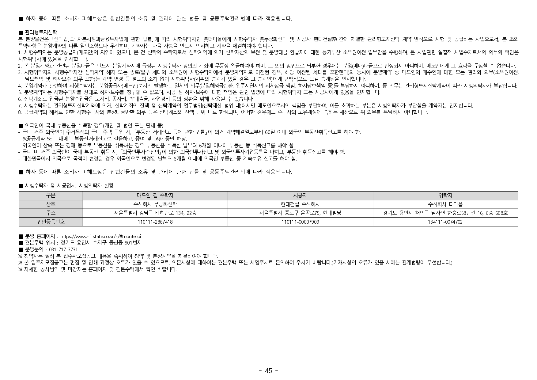 ■ 해당 주택건설지역(경기도 용인시 처인구 모현읍)은 「주택법」 제63조 및 제63조의2에 의한 비투기과열지구 및 비청약과열지역으로서, 본 아파트는 「주택공급에 관한 규칙」에 따라 1주택 이상 소유한 세대에 속한 분도 1순위 자격이 부여됩니다. 또한 본 아파트는 「수도권정비계획법」 제6조 제1항의 규정에 의한 자연보전권역입니다.