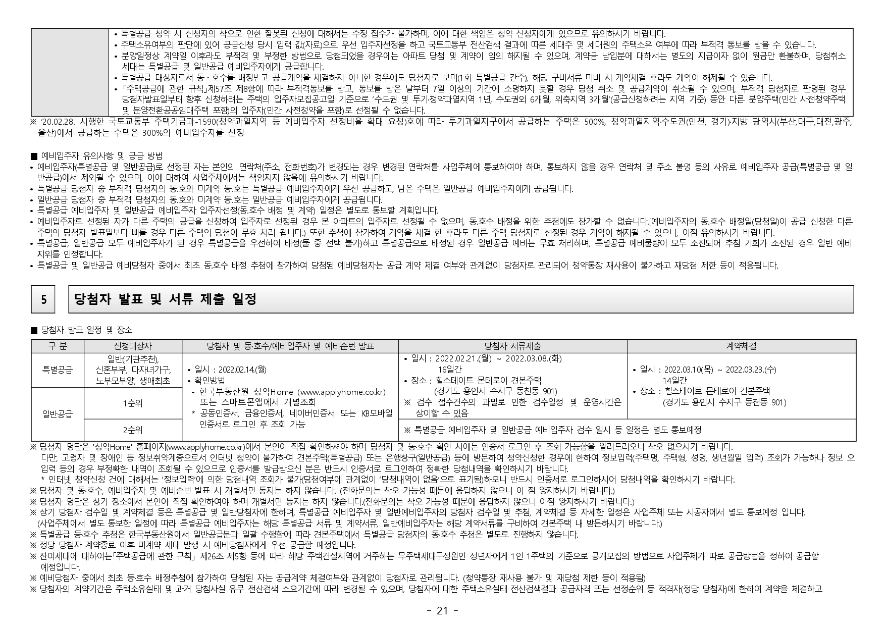 ■ 본 아파트는 당첨자 발표일이 동일한 모든 주택(민간 사전청약, 분양주택, 분양전환공공임대주택)에 한하여 1인 1건만 신청이 가능하며, 2건 이상 중복신청 시 모두 무효처리 또는 당첨자 선정 이후에도 당첨 무효(예비 입주자 지위 무효)되오니 유의하시기 바랍니다. (단, 동일단지 내 1인이 특별공급 및 일반공급에 각 1건씩 청약가능하며 특별공급 당첨자로 선정 시 일반공급 선정 대상에서 제외처리 함)