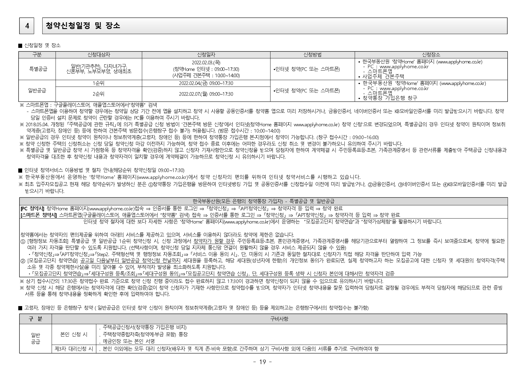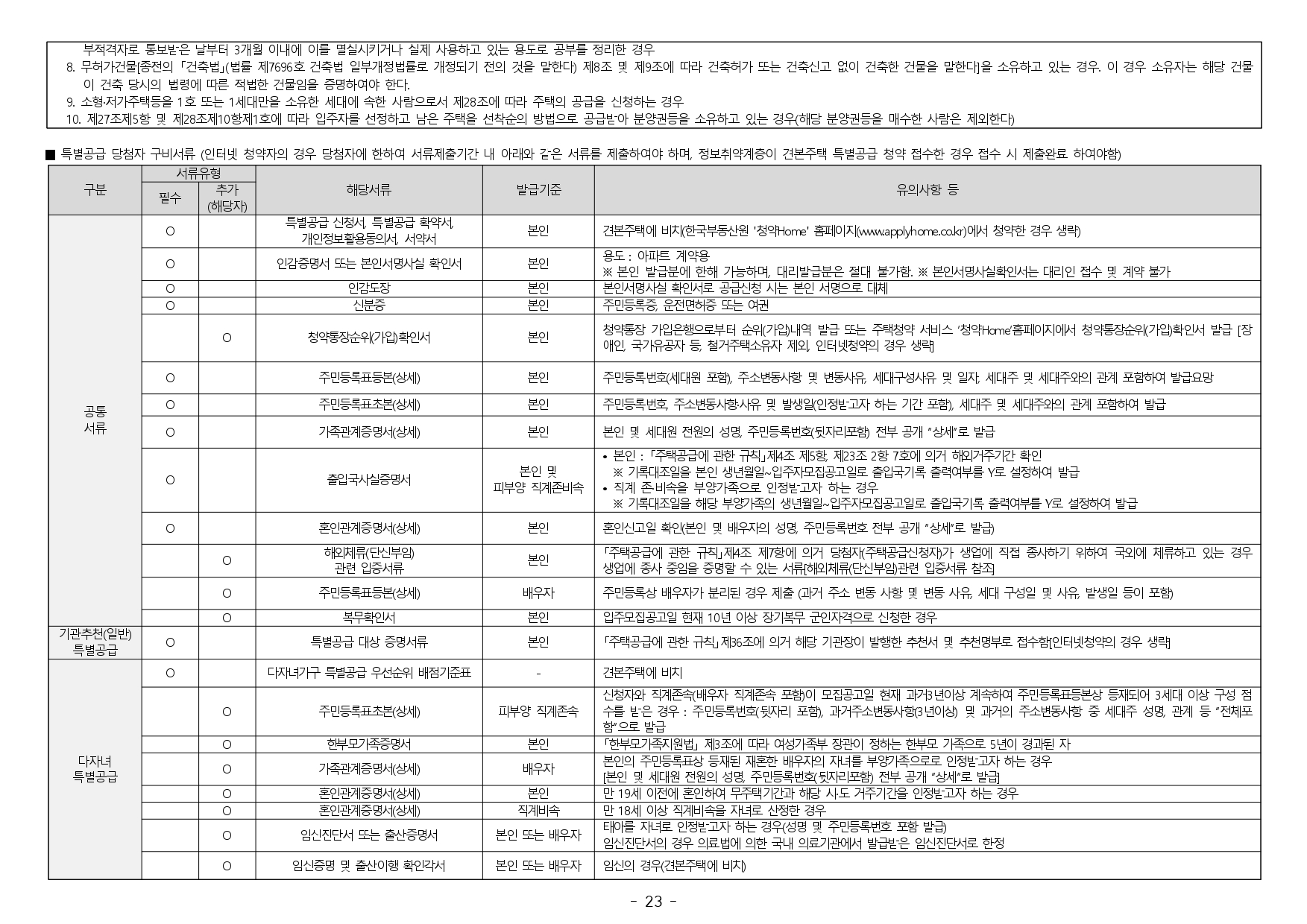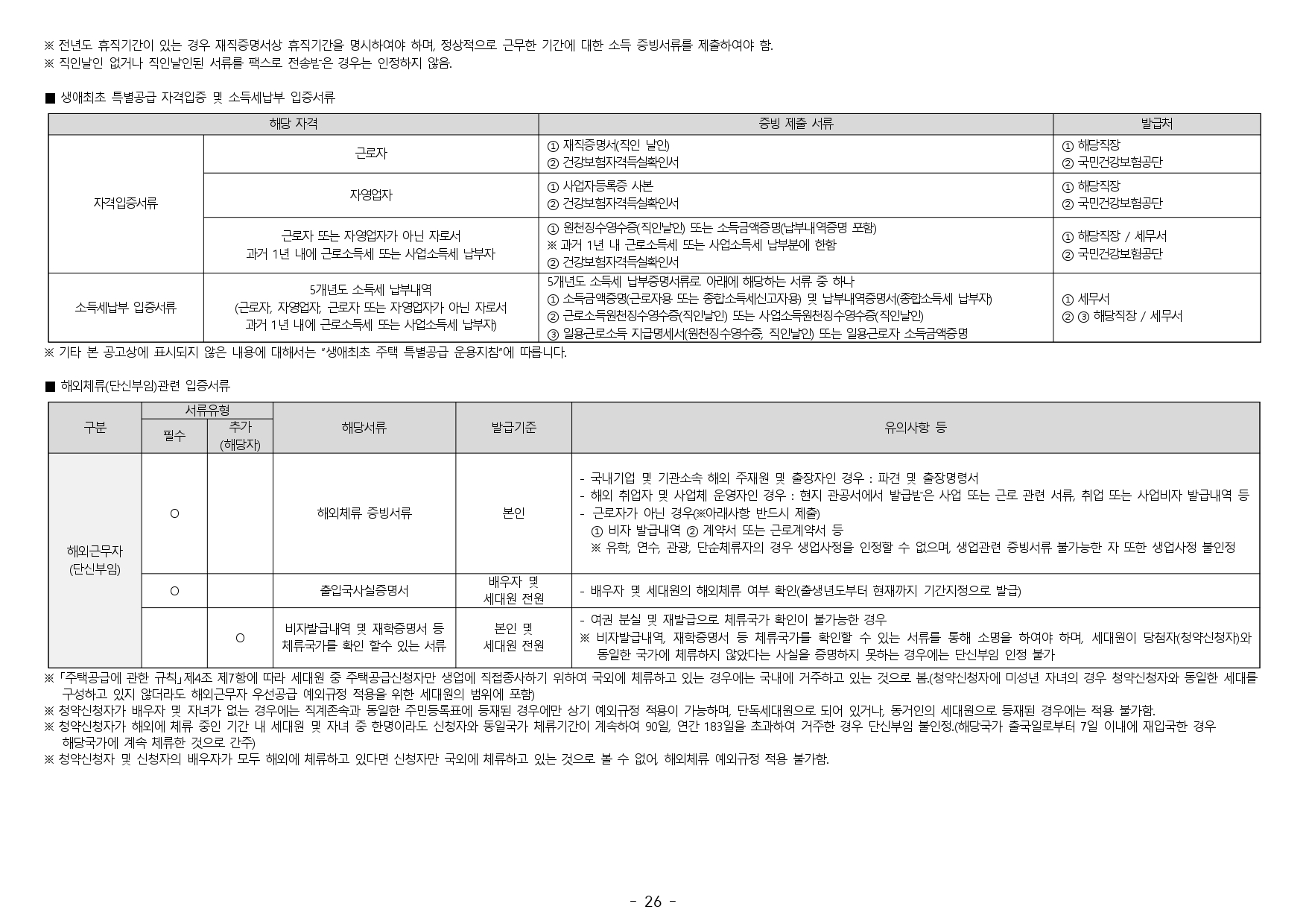 ■ 2019.11.01. 개정된 「주택공급에 관한 규칙」 제4조 제5항 및 제23조 제2항 제7호에 따라 우선공급 받으려는 경우에는 「출입국관리법」제88조의 출입국사실증명서를 사업주체에 제출하여야 합니다. 장기해외체류자는 해당 주택 건설지역 우선공급 대상자로 신청이 불가하며, 이를 위반하여 해당 주택건설지역 거주자로 청약하여 당첨된 경우에는 부적격 당첨자로 처리됩니다.