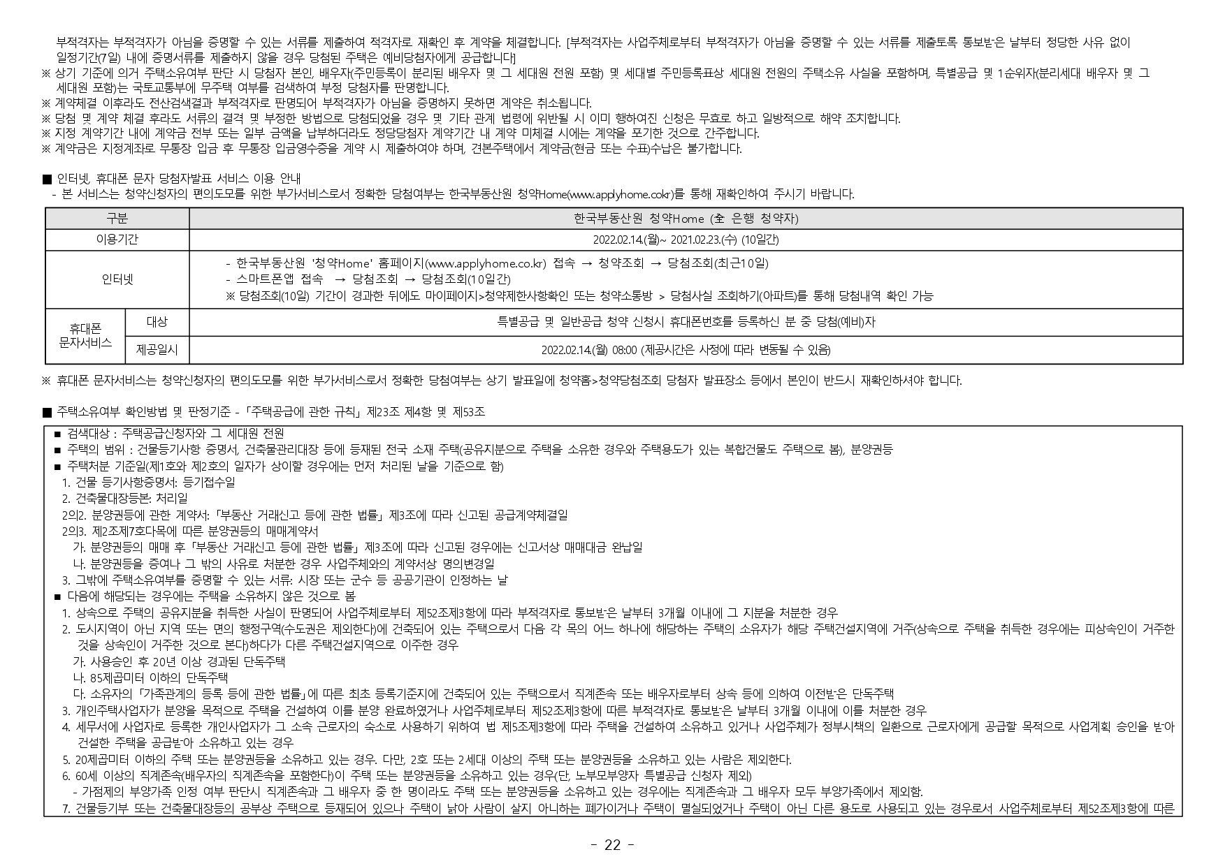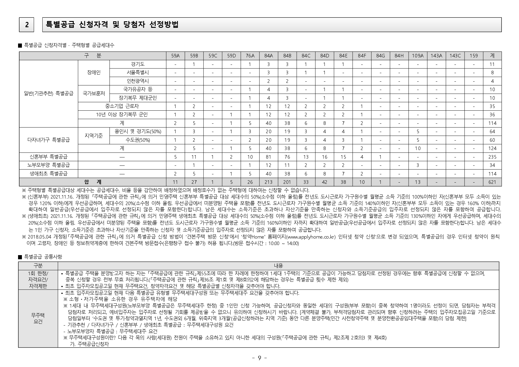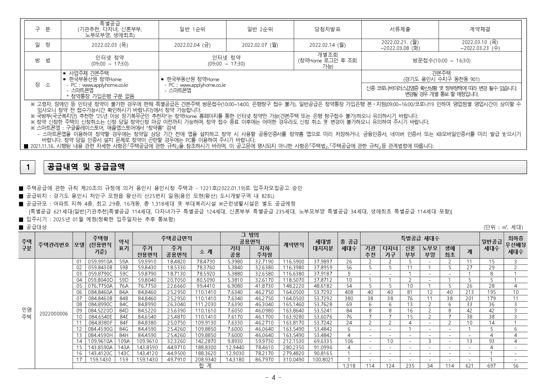 ■ 본 아파트는 당첨자 발표일이 동일한 모든 주택(민간 사전청약, 분양주택, 분양전환공공임대주택)에 한하여 1인 1건만 신청이 가능하며, 2건 이상 중복신청 시 모두 무효처리 또는 당첨자 선정 이후에도 당첨 무효(예비 입주자 지위 무효)되오니 유의하시기 바랍니다. (단, 동일단지 내 1인이 특별공급 및 일반공급에 각 1건씩 청약가능하며 특별공급 당첨자로 선정 시 일반공급 선정 대상에서 제외처리 함)