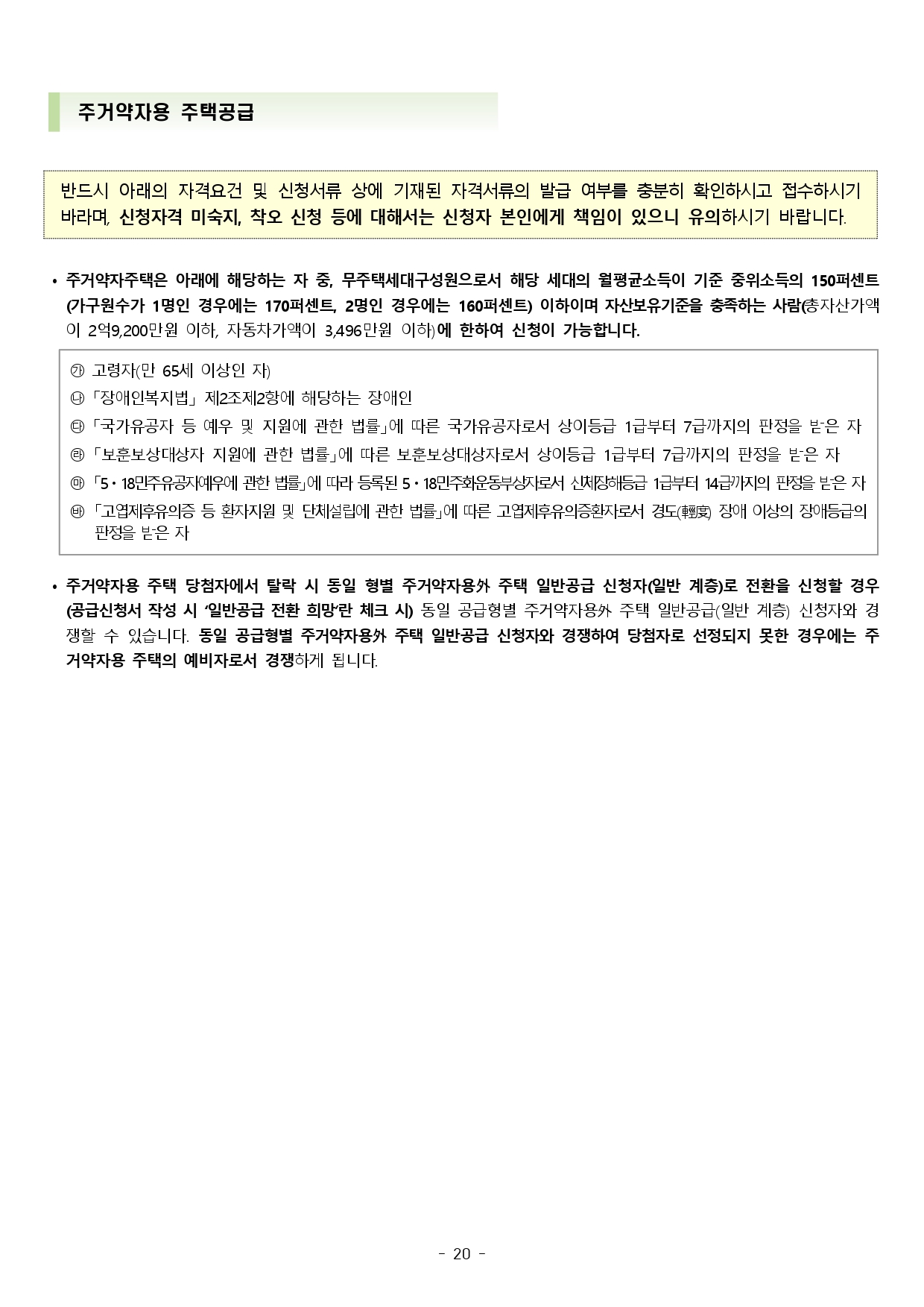 입주자모집공고일(2022.01.27) 현재 무주택세대구성원(청년 및 혼인 중이 아닌 경우로서 단독세대주로 입주하려는 고령자는 무주택자)으로서 자산・소득 기준 및 입주자격 구분별 입주자격을 충족한 자에게 1세대 1주택 기준으로 세대원수에 따라 공급합니다. 다만, 신청자의 세대구성원 중 과거 공공임대주택 임차인 으로서 불법양도, 전대 행위로 적발된 후 4년이 경과되지 않는 자는 입주자로 선정이 불가합니다.