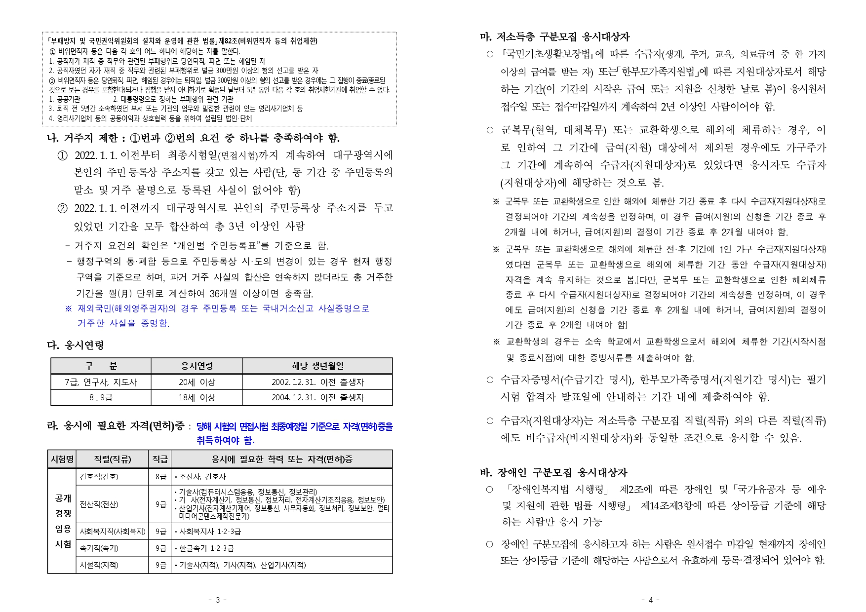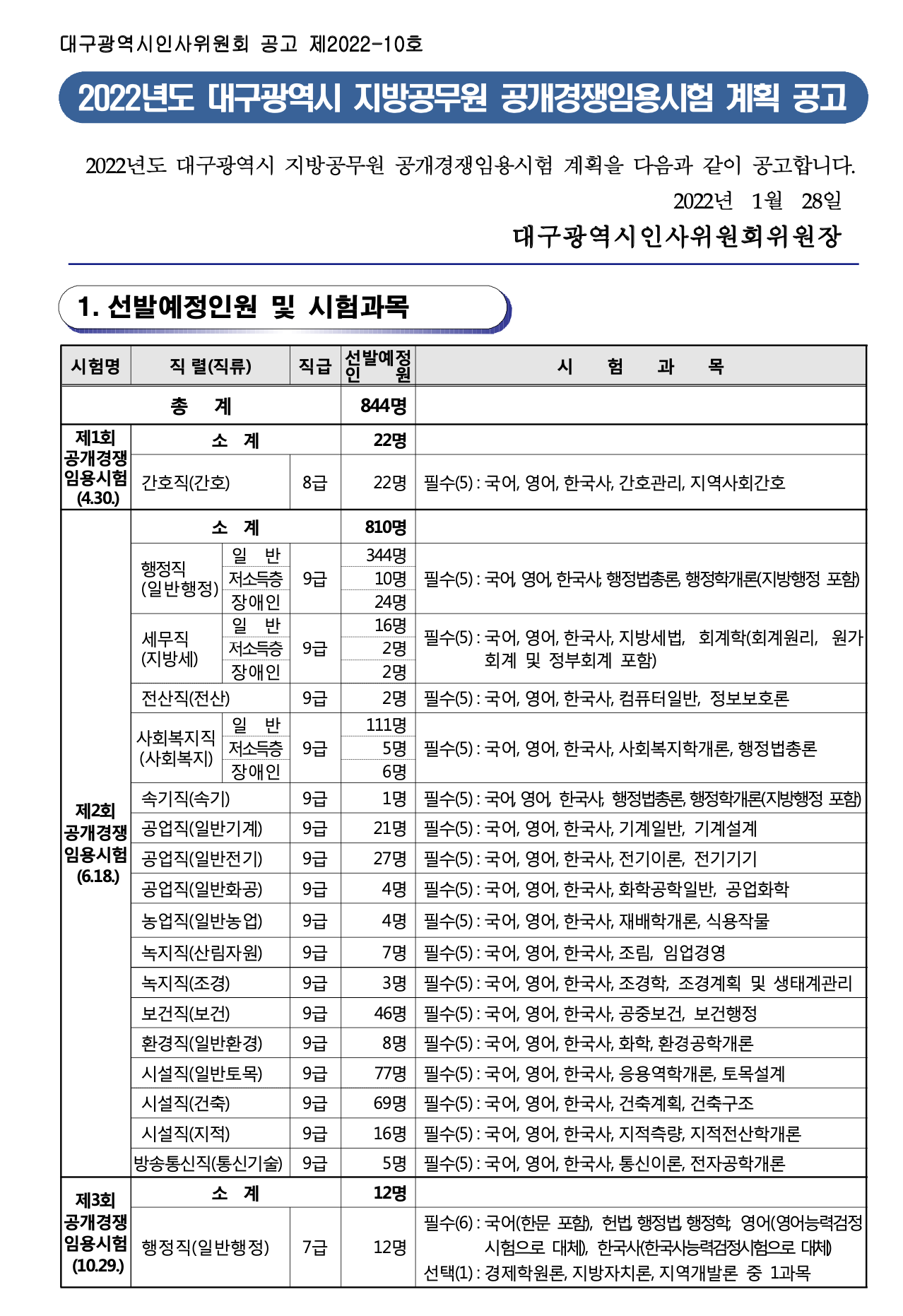 2022년도 대구광역시 지방공무원 공개경쟁임용시험 계획 공고입니다.