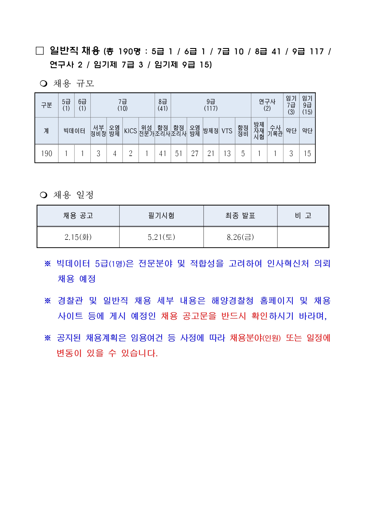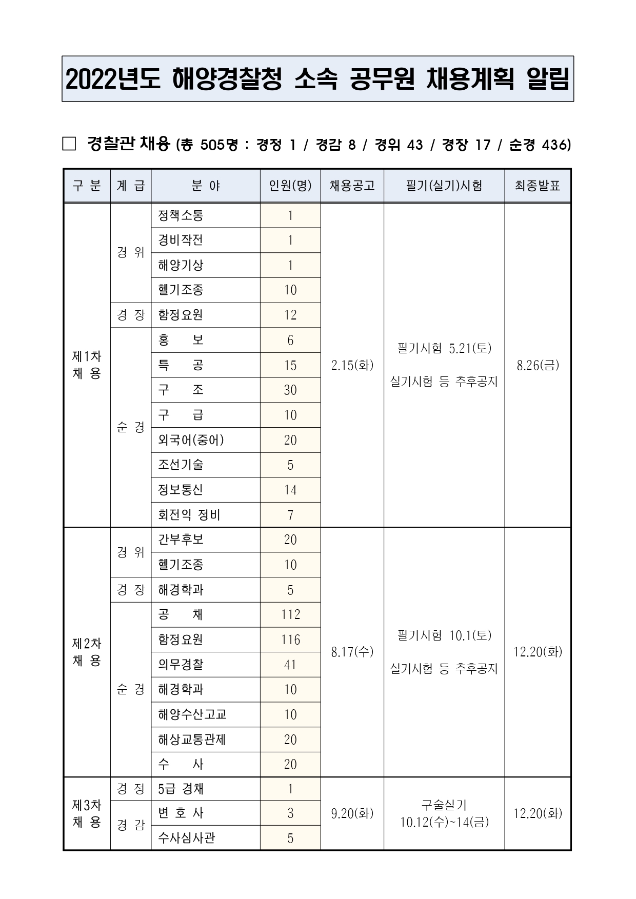 2022 해양경찰청 소속 공무원 채용계획 및 사전 공지 안내입니다.
