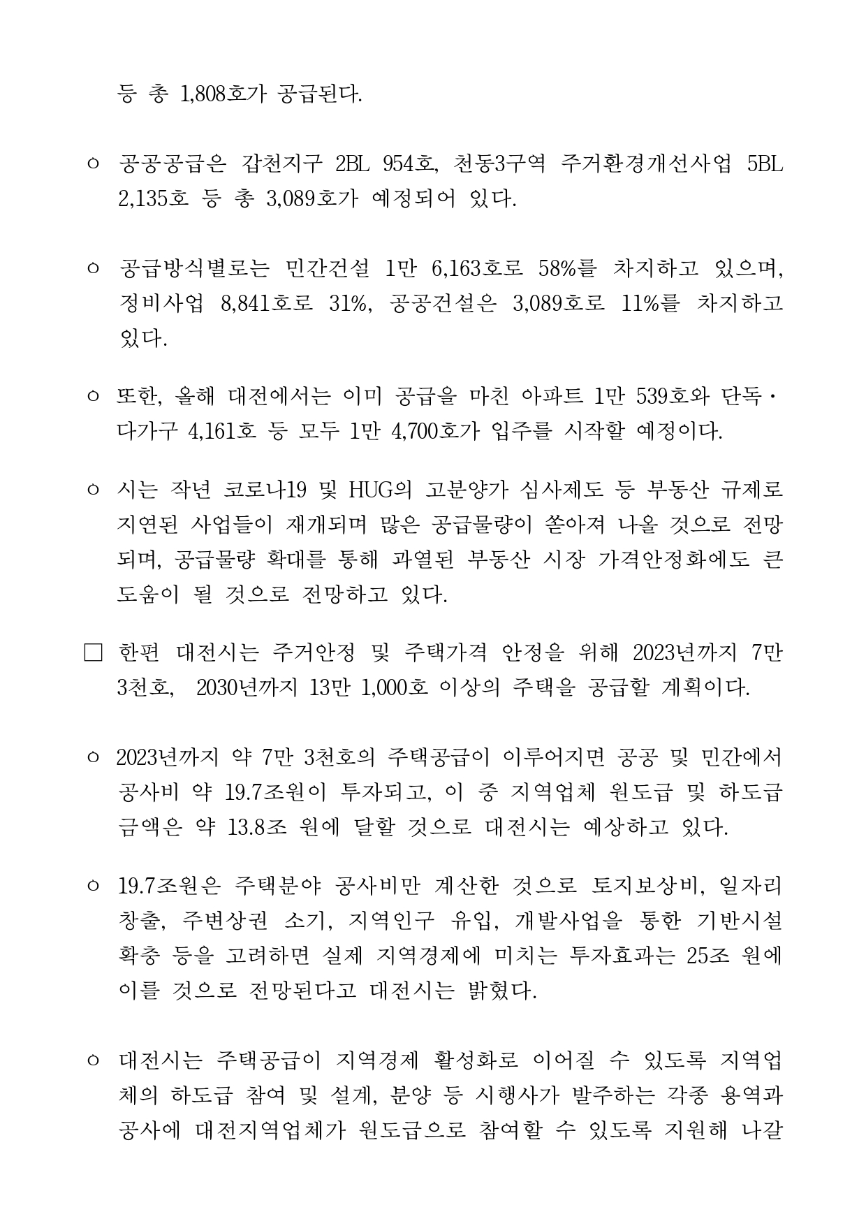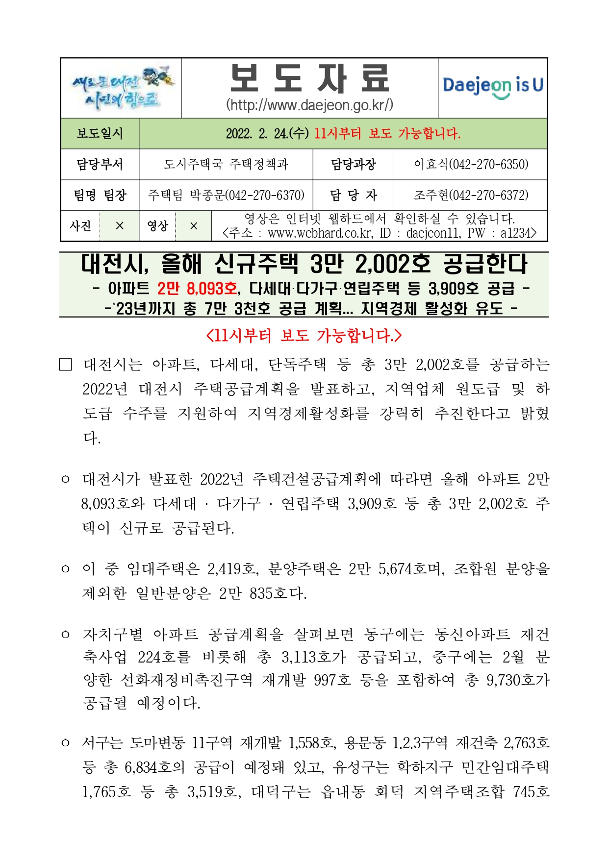 대전시는 아파트, 다세대, 단독주택 등 총 3만 2,002호를 공급하는 2022년 대전시 주택공급계획을 발표하고, 지역업체 원도급 및 하도급 수주를 지원하여 지역경제활성화를 강력히 추진한다고 밝혔습니다.