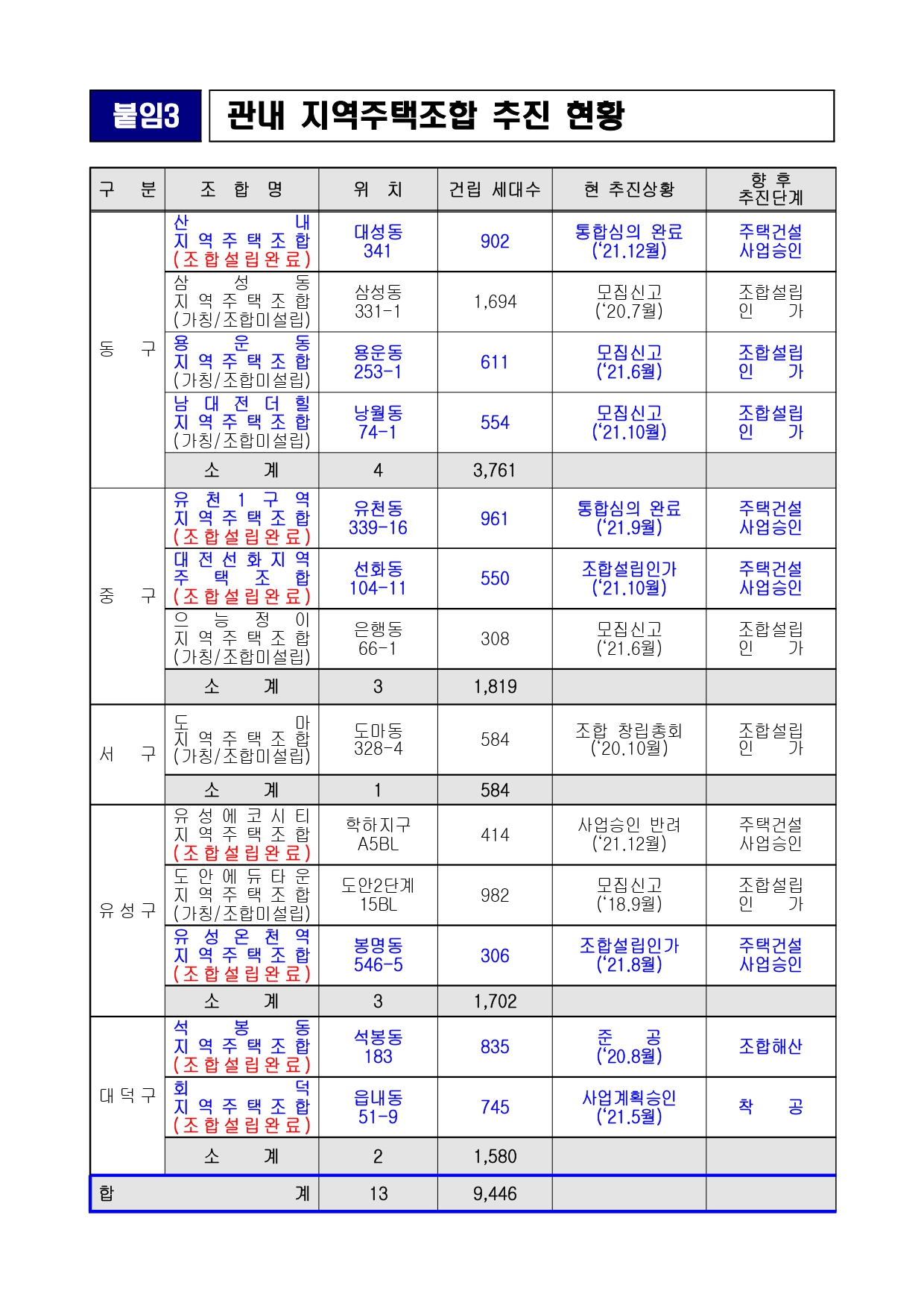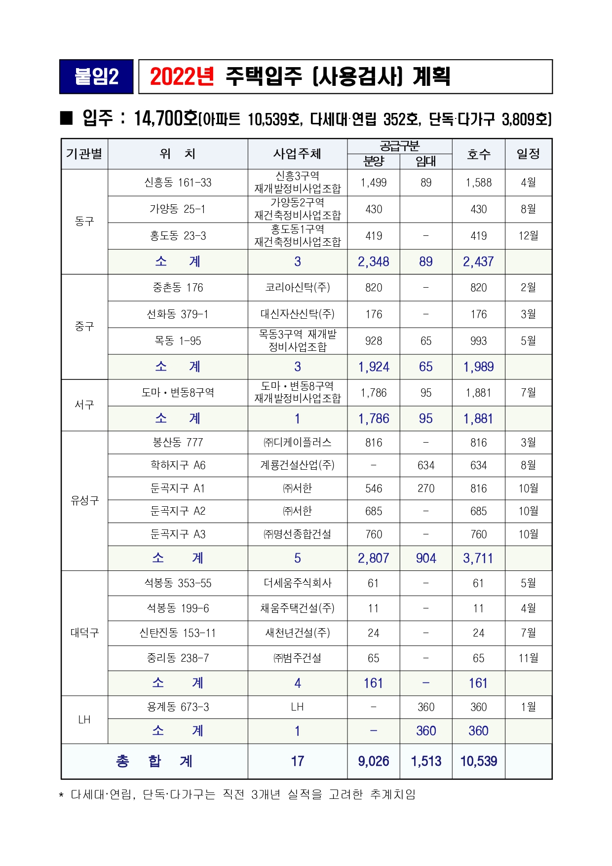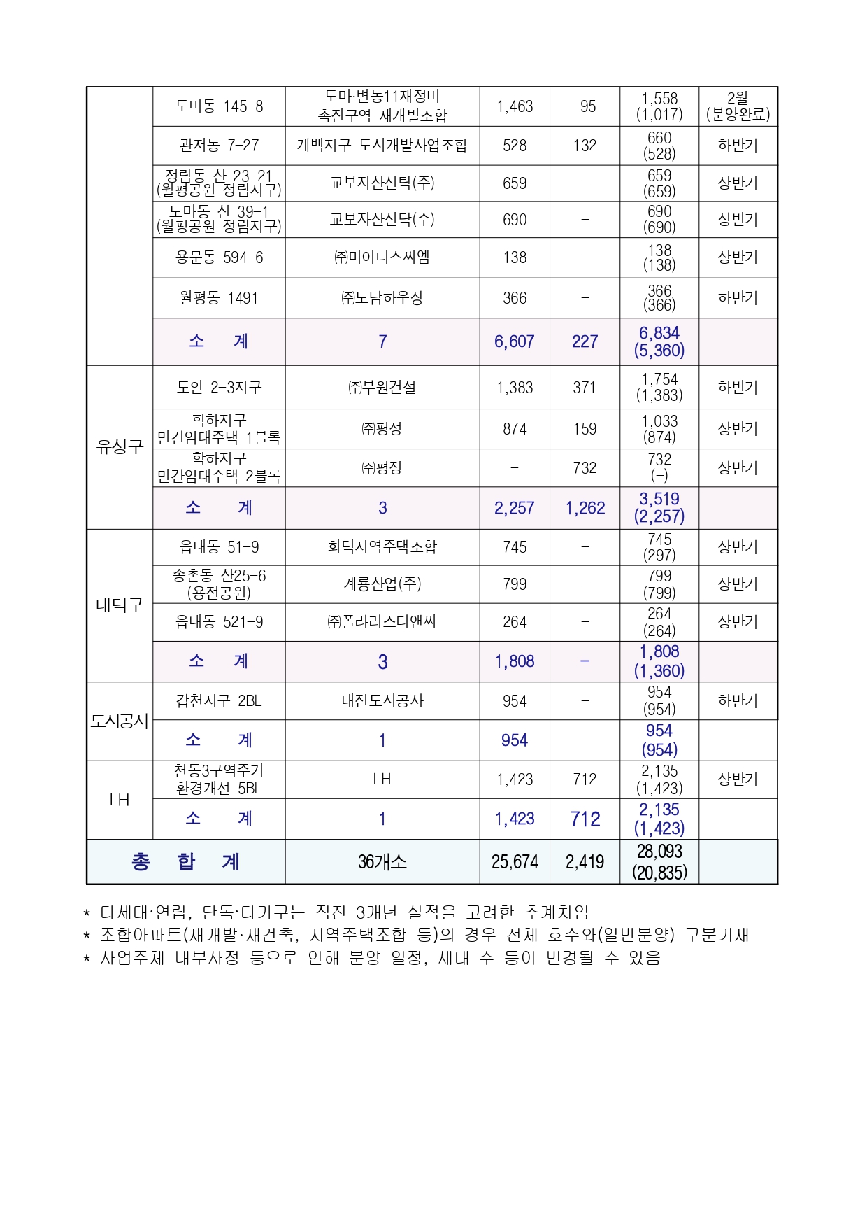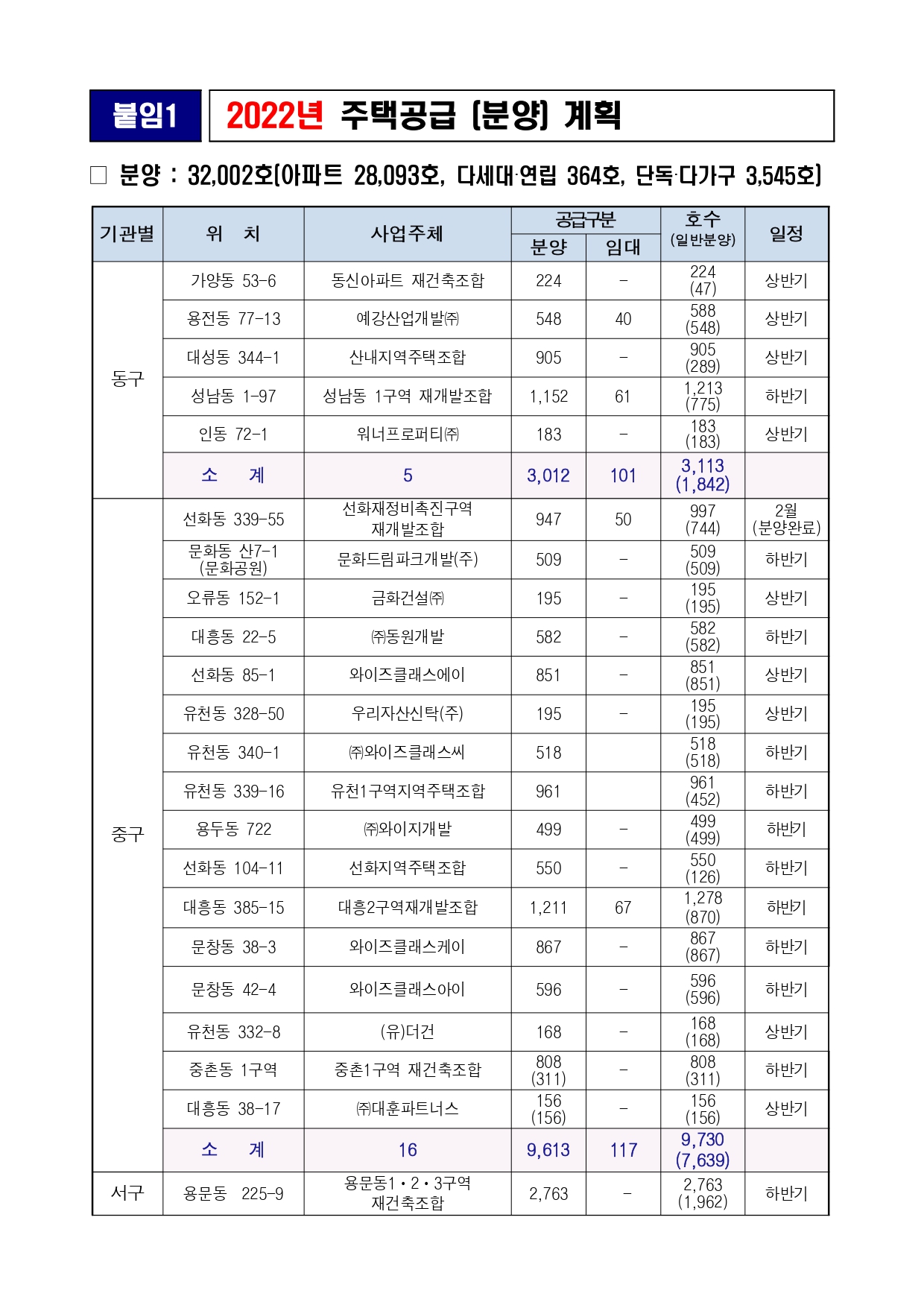 자치구별 아파트 공급계획을 살펴보면 동구에는 동신아파트 재건축사업 224호를 비롯해 총 3,113호가 공급되고, 중구에는 2월 분양한 선화재정비촉진구역 재개발 997호 등을 포함하여 총 9,730호가 공급될 예정입니다.