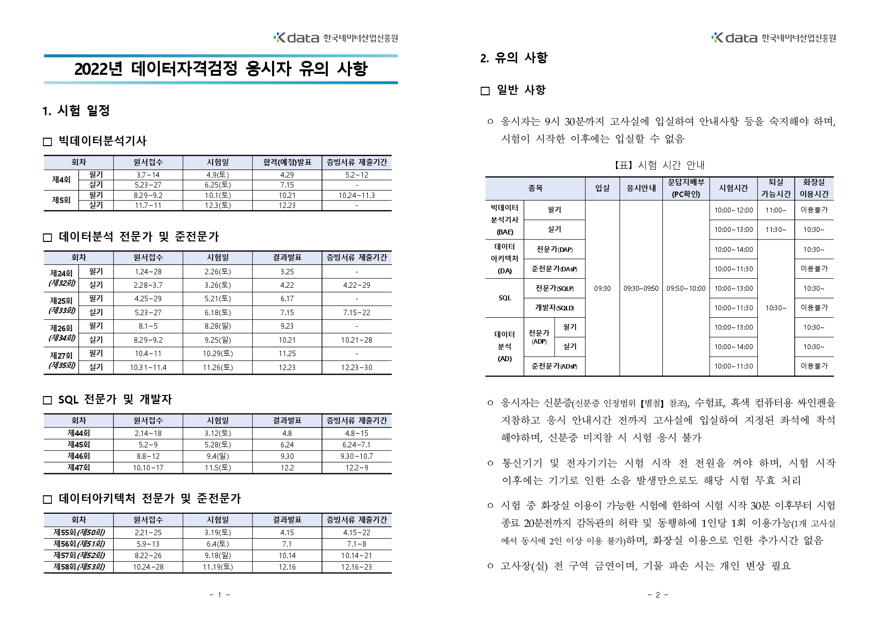 2022년 데이터자격검정 응시자 유의 사항입니다.