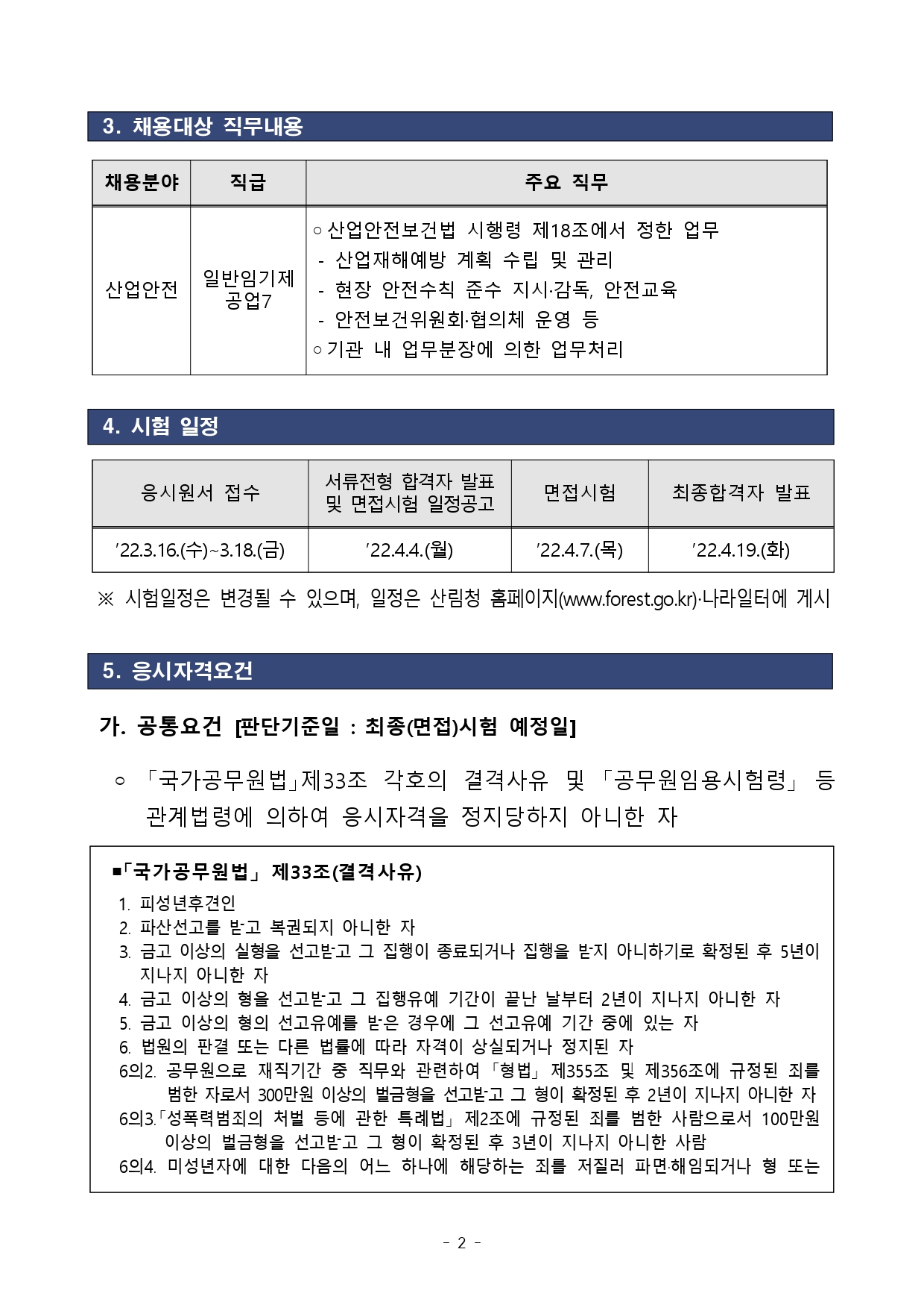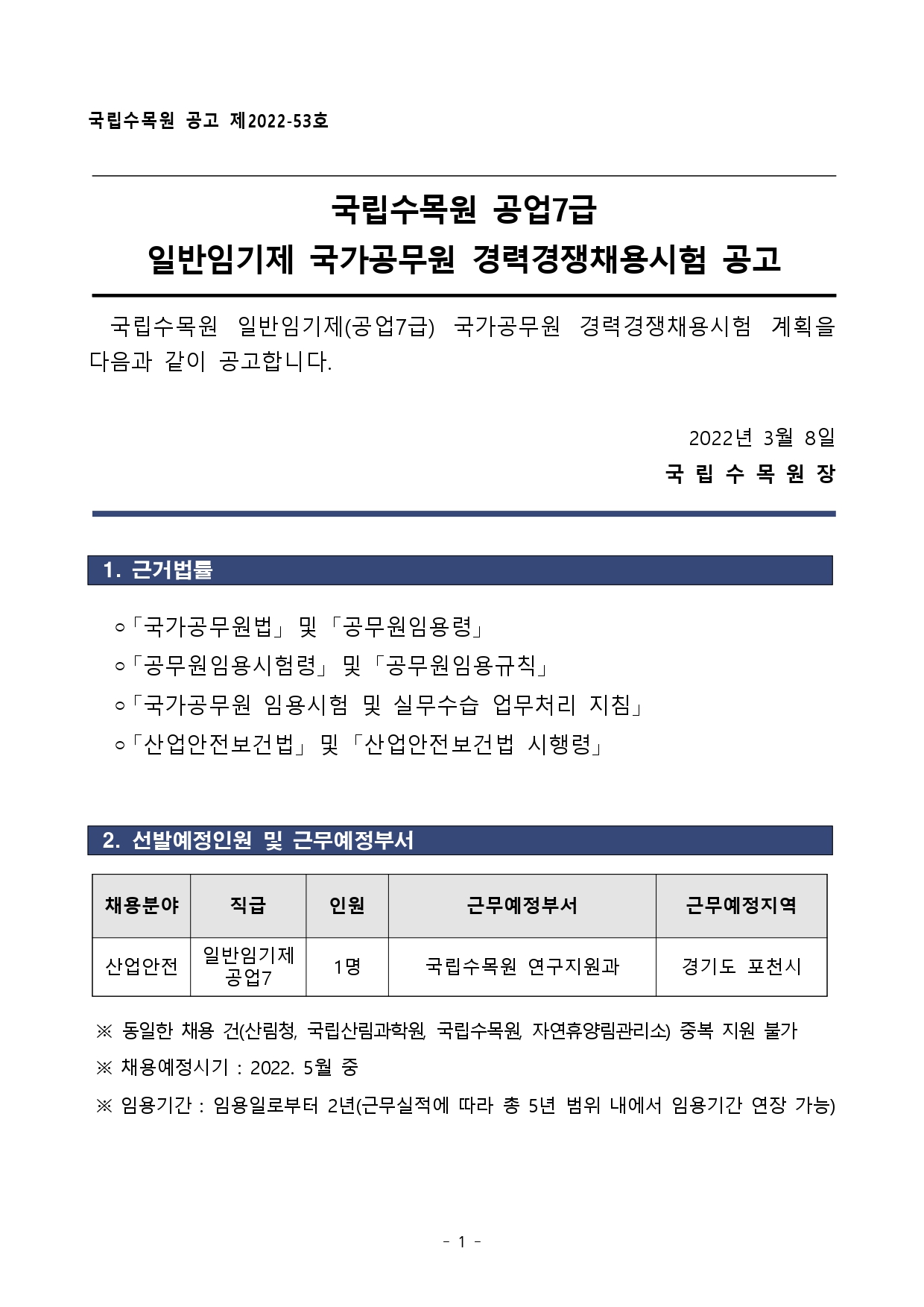 2022년 국립수목원 공업7급 일반임기제 국가공무원 경력채용(~3.18) 공고입니다.