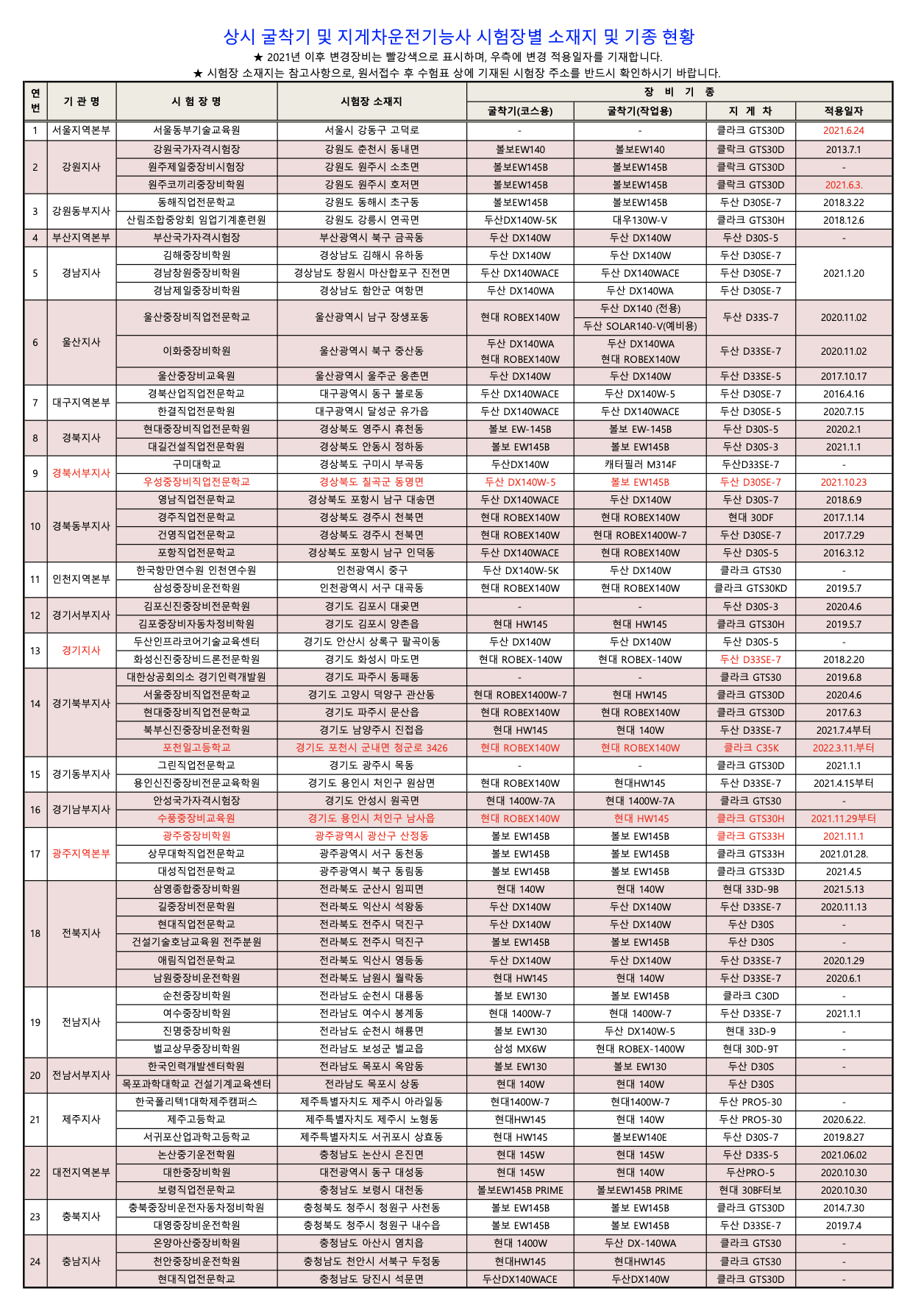 2022년 상시 중장비 종목(굴착기,지게차운전기능사) 시험장별 소재지 및 기종 안내입니다.