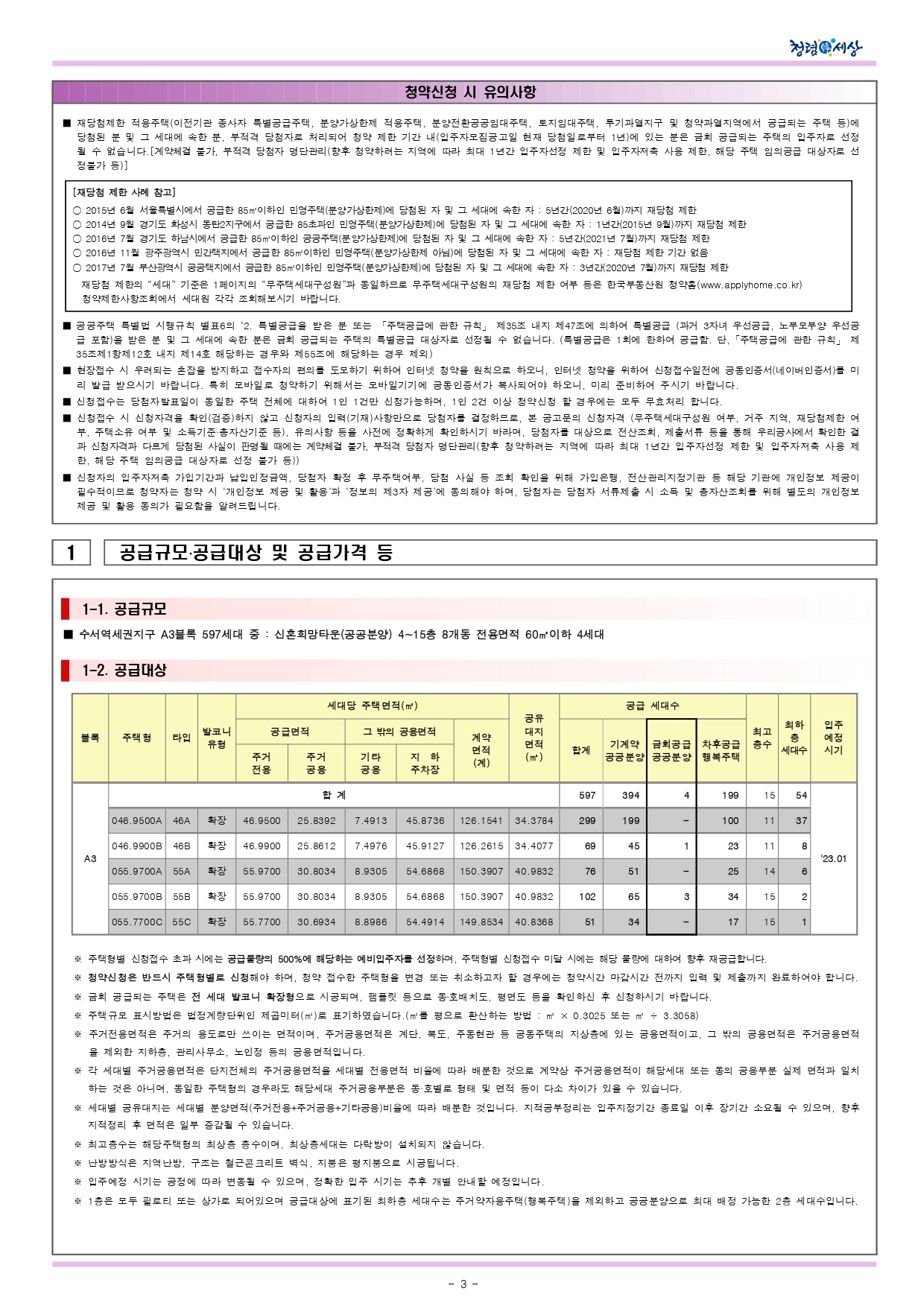 - A3블록 내 신혼희망타운(공공분양)은 무작위 전산추첨으로 동·호 배정됩니다.