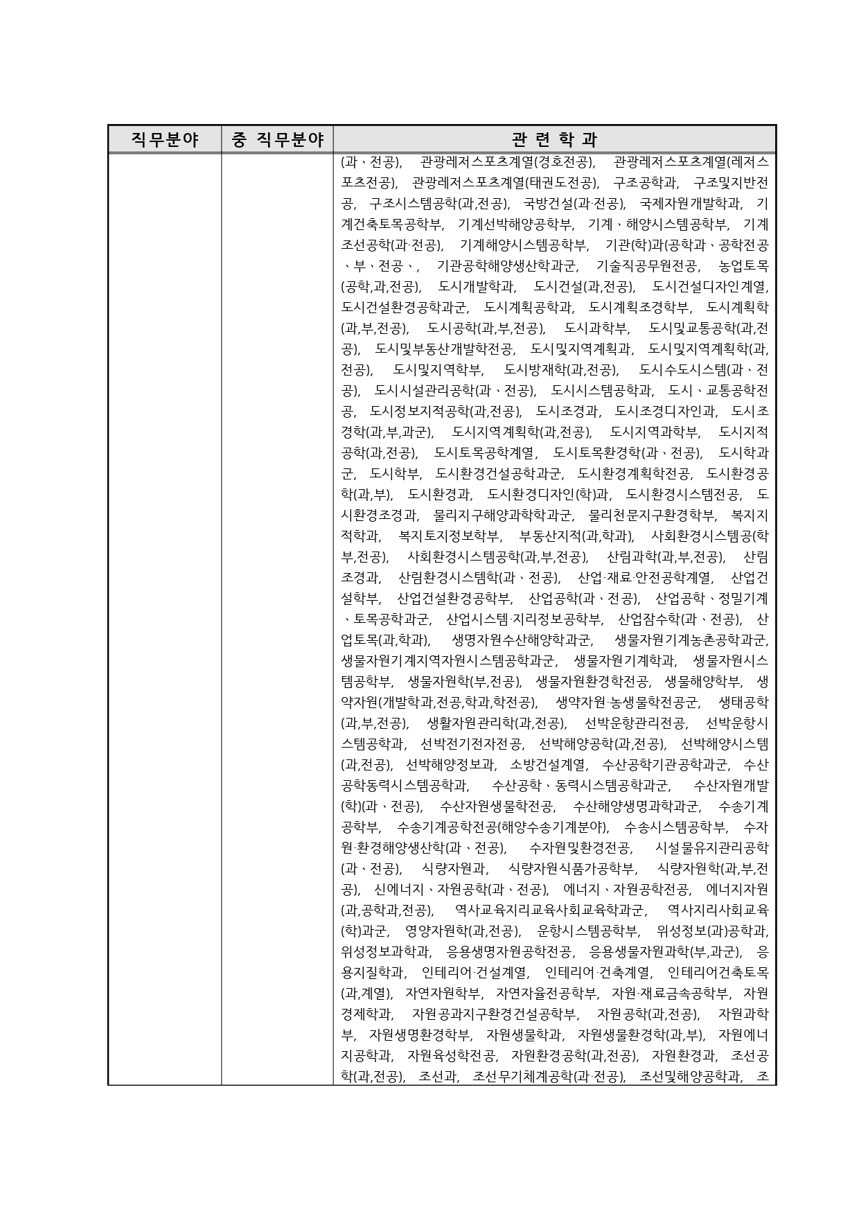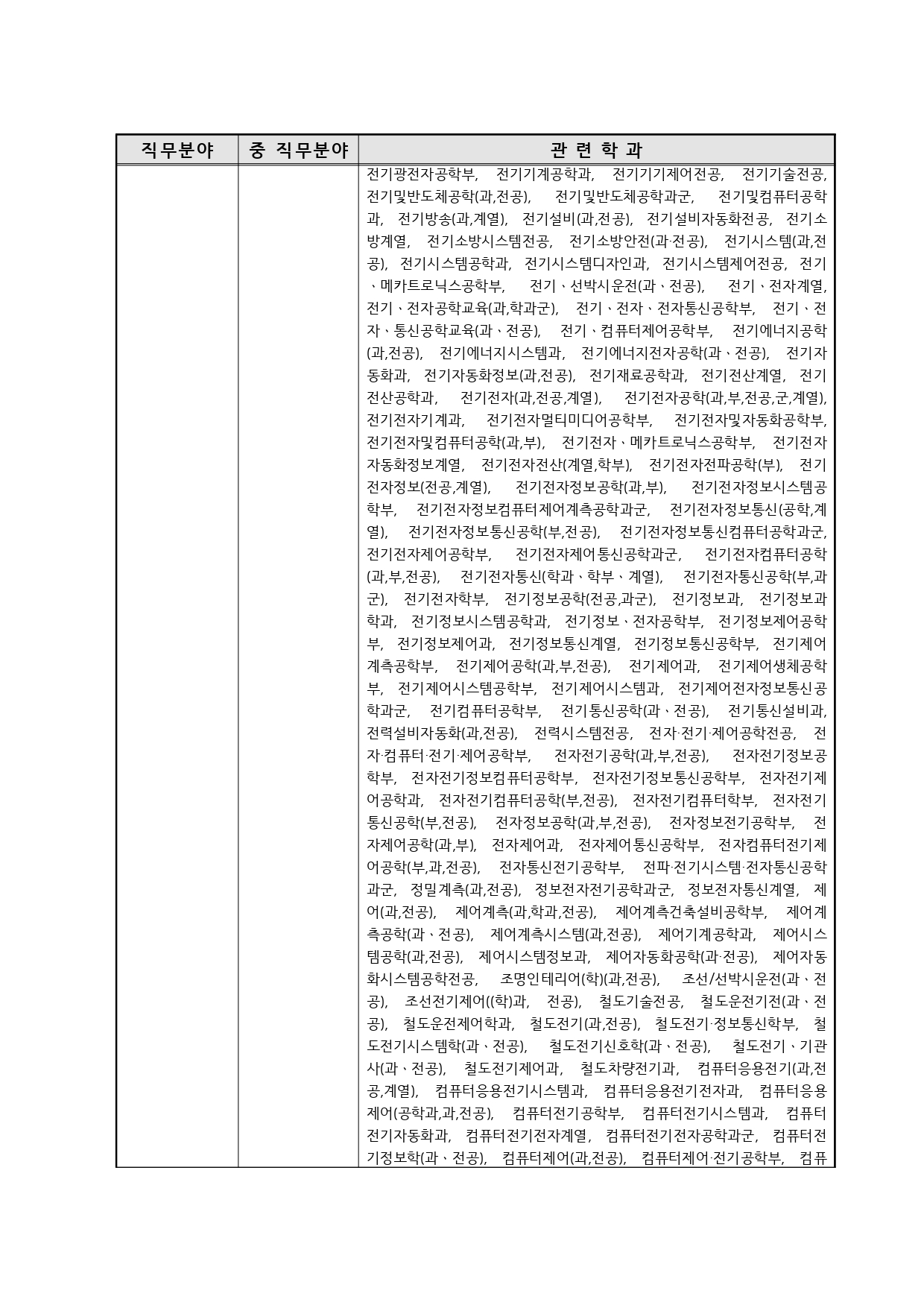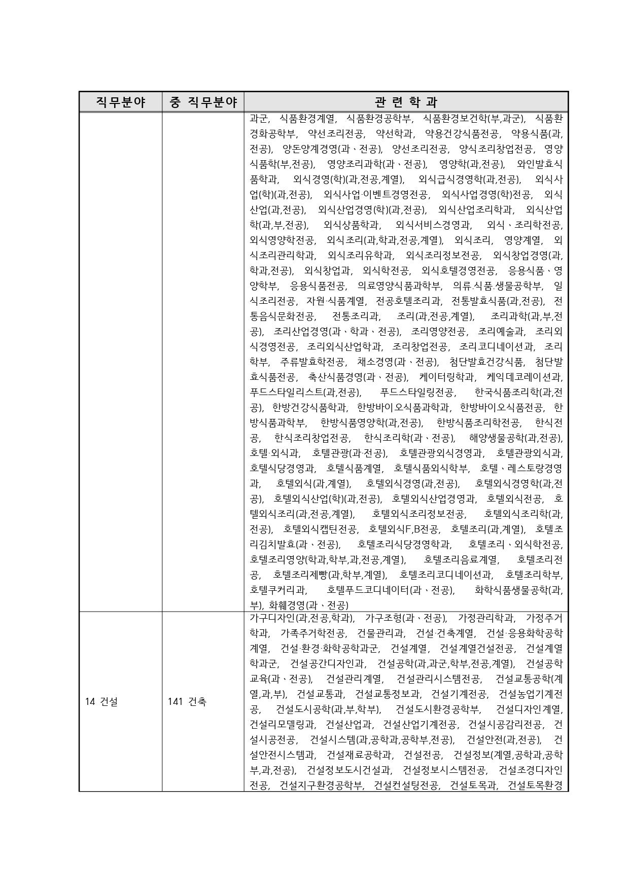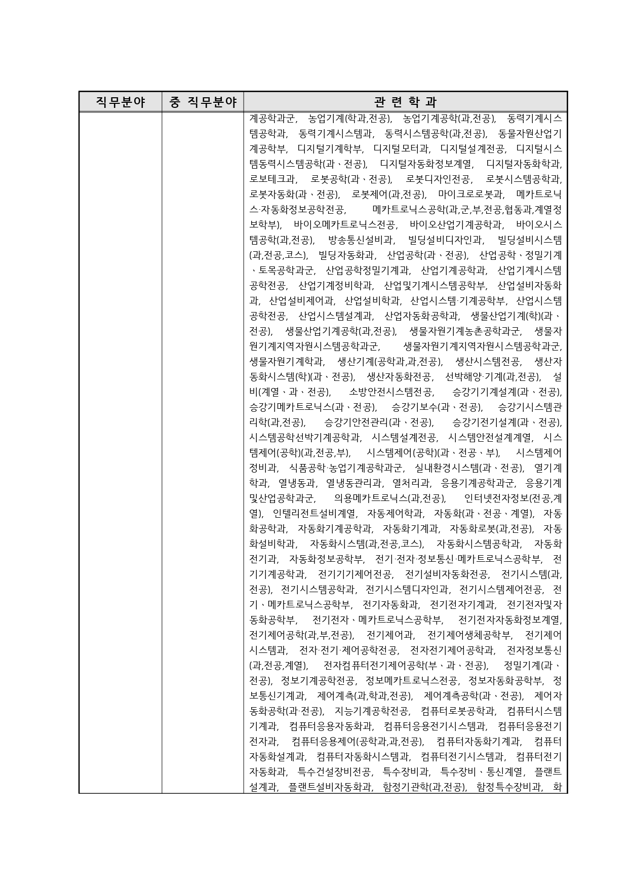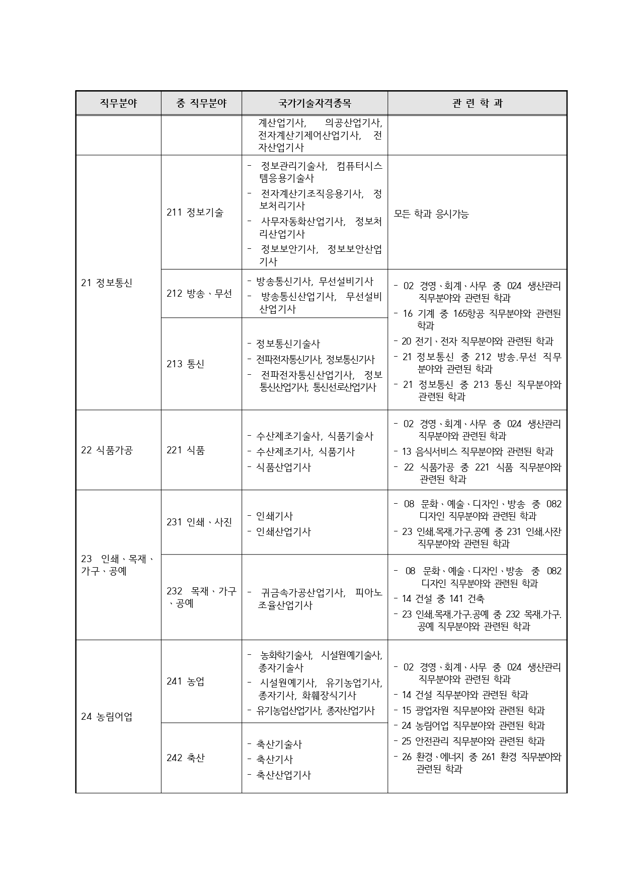 국가기술자격의 종목별 관련학과 안내.