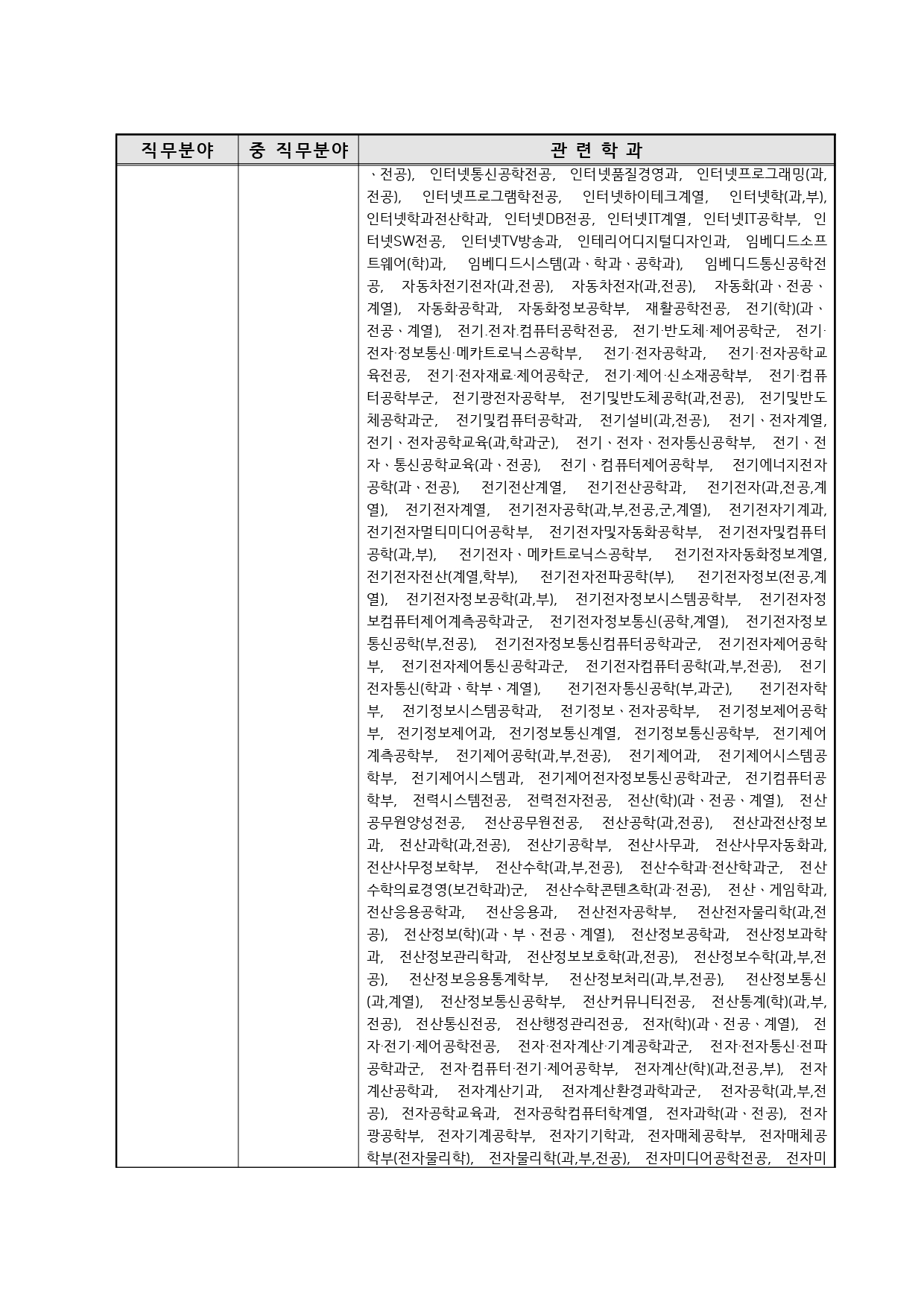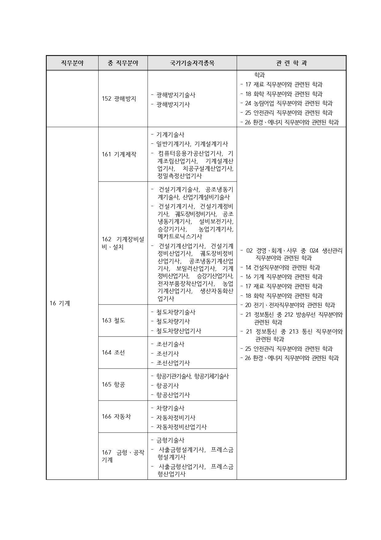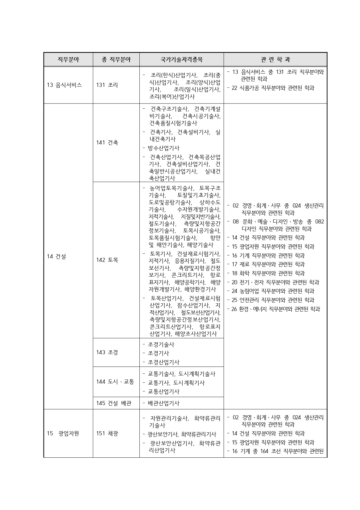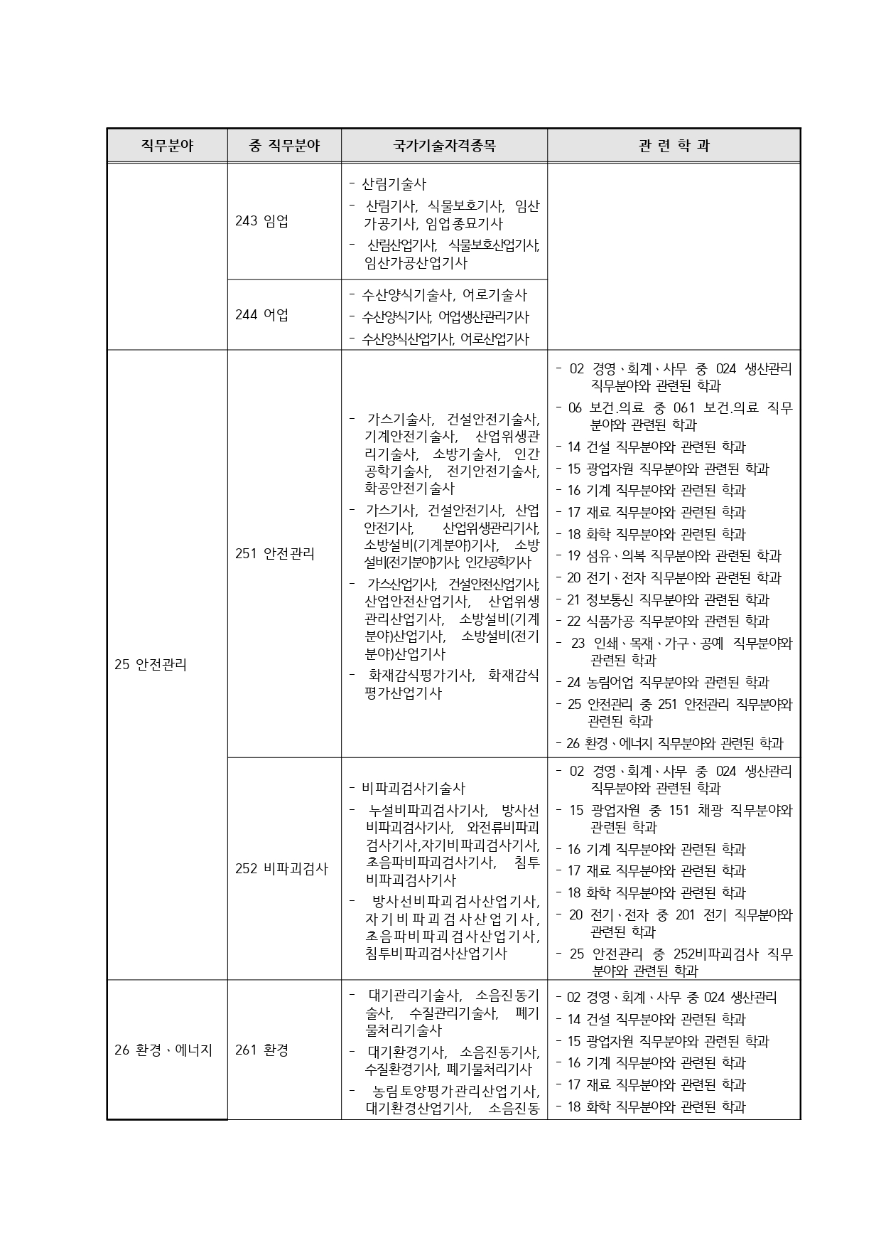 국가기술자격의 종목별 관련학과 안내.