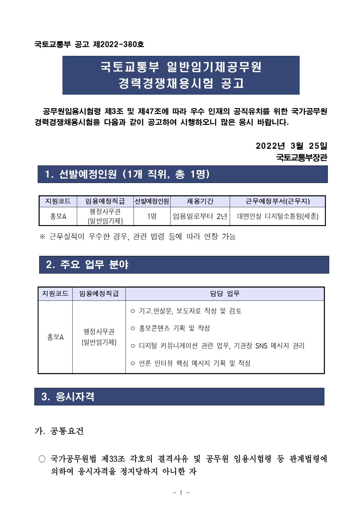 2022 국토교통부 일반임기제공무원경력경쟁채용시험 공고(홍보)입니다.