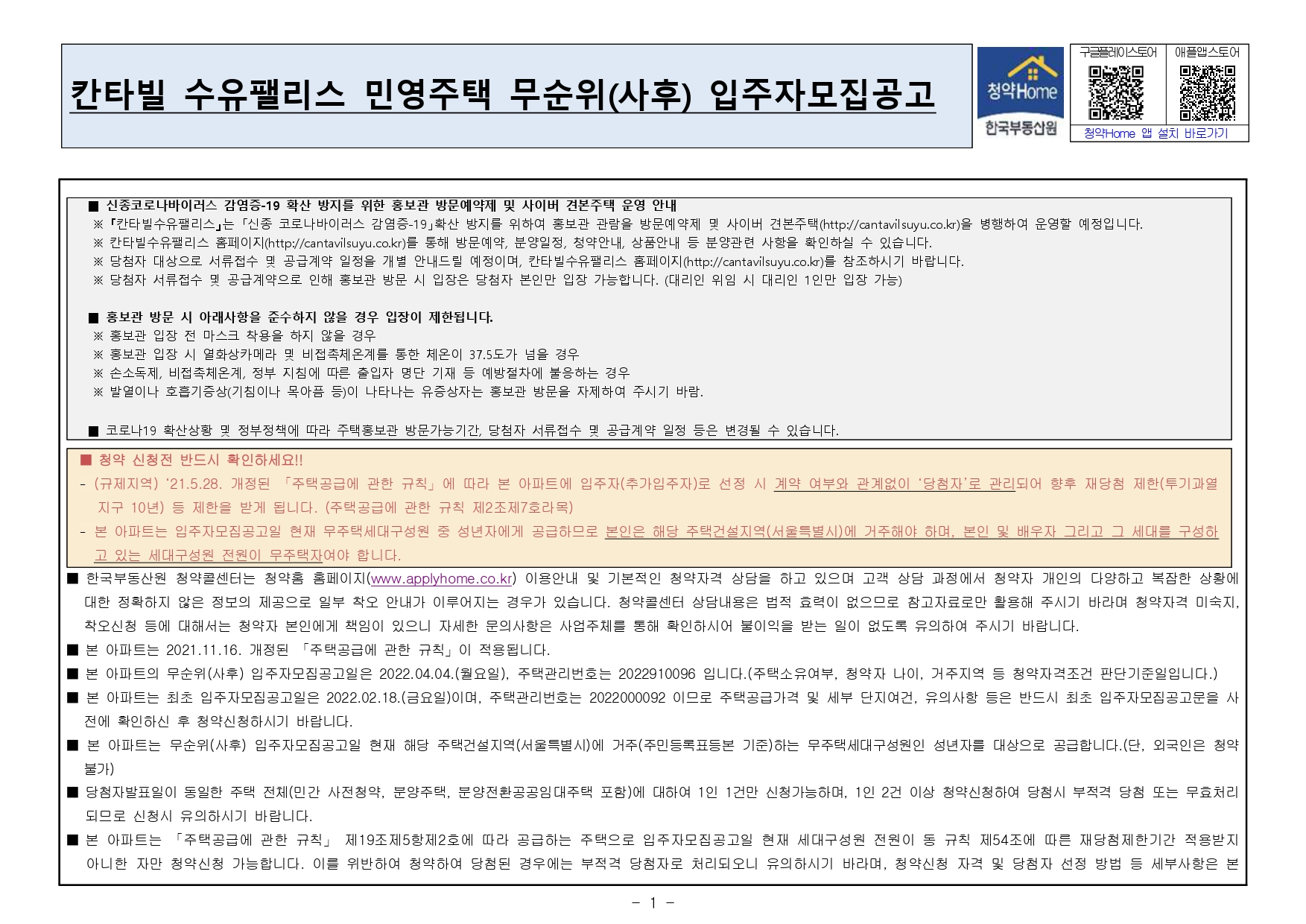 ■ 본 아파트의 무순위(사후) 입주자모집공고일은 2022.04.04.(월요일), 주택관리번호는 2022910096 입니다.(주택소유여부, 청약자 나이, 거주지역 등 청약자격조건 판단기준일입니다.