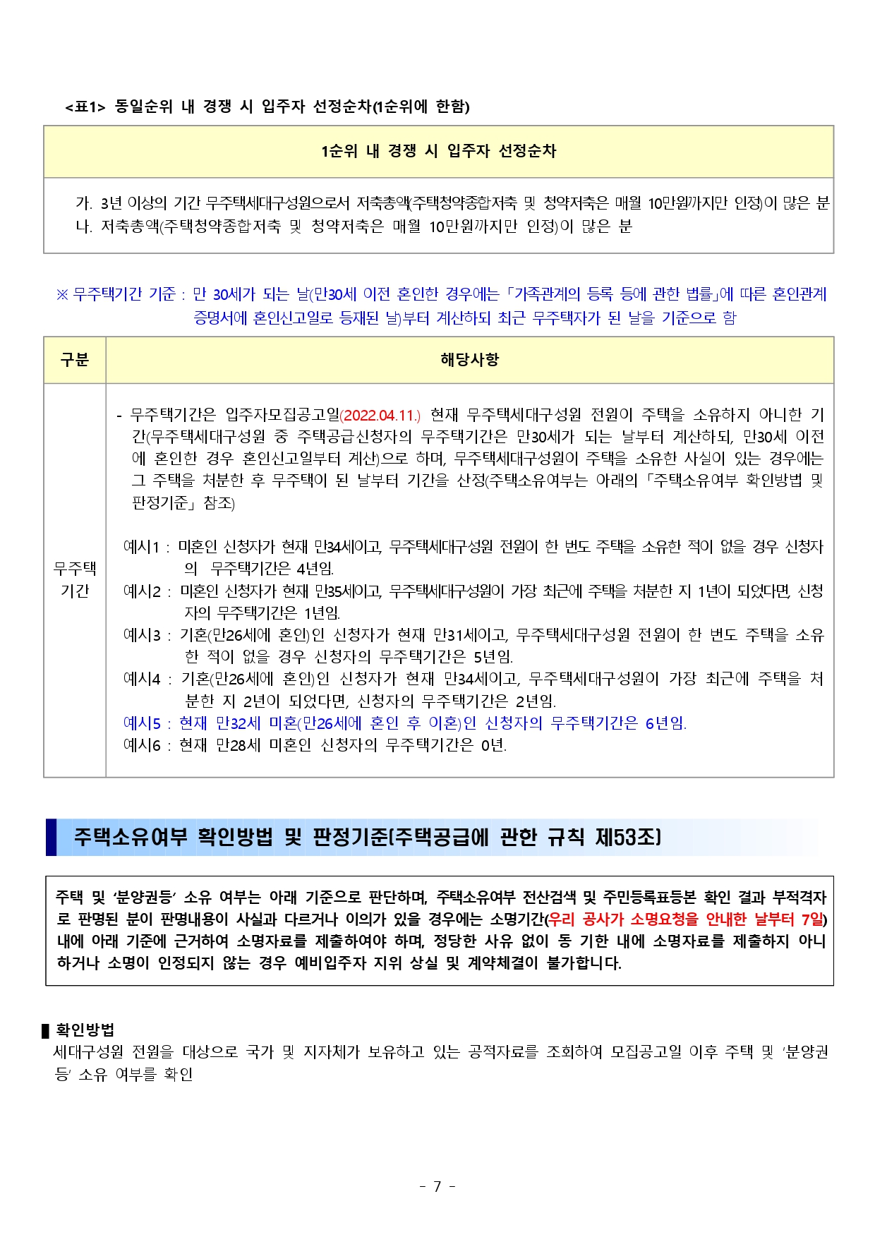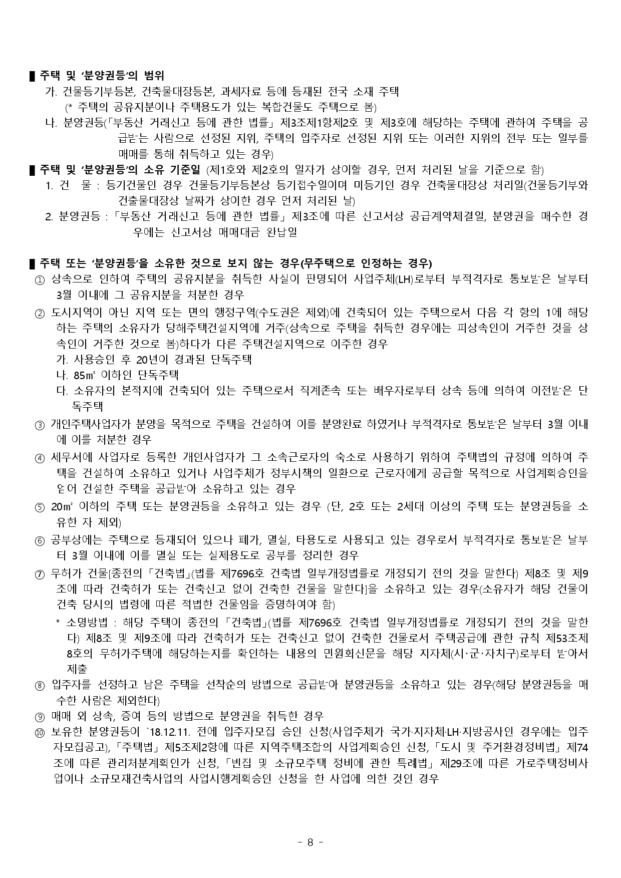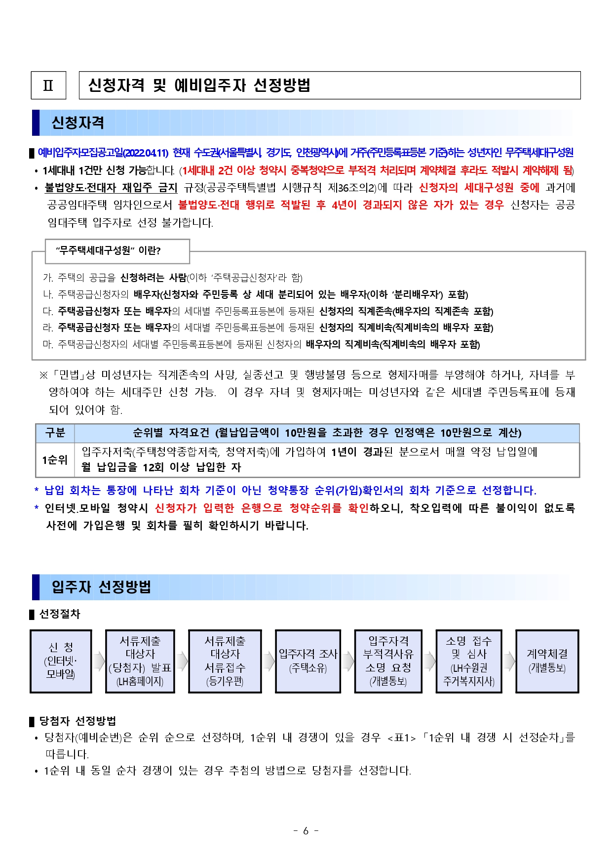 금회 공급되는 주택은 예비입주자모집공고일(2022.04.11) 현재 수도권(서울특별시, 경기도, 인천광역시)에 거주(주민 등록표등본 기준)하는 성년자(만19세이상)인 무주택세대구성원(1세대 1주택 기준)에게 공급(1세대 2인 이상이 청약 하여 한곳이라도 당첨될 경우 중복청약으로 모두 부적격처리 됨)하며, 아래 [무주택세대구성원] 전원이 [주택 및 분양권등] 각목의 요건을 입주자모집공고일부터 분양전환 시 까지 계속해서 유지하여야 합니다.