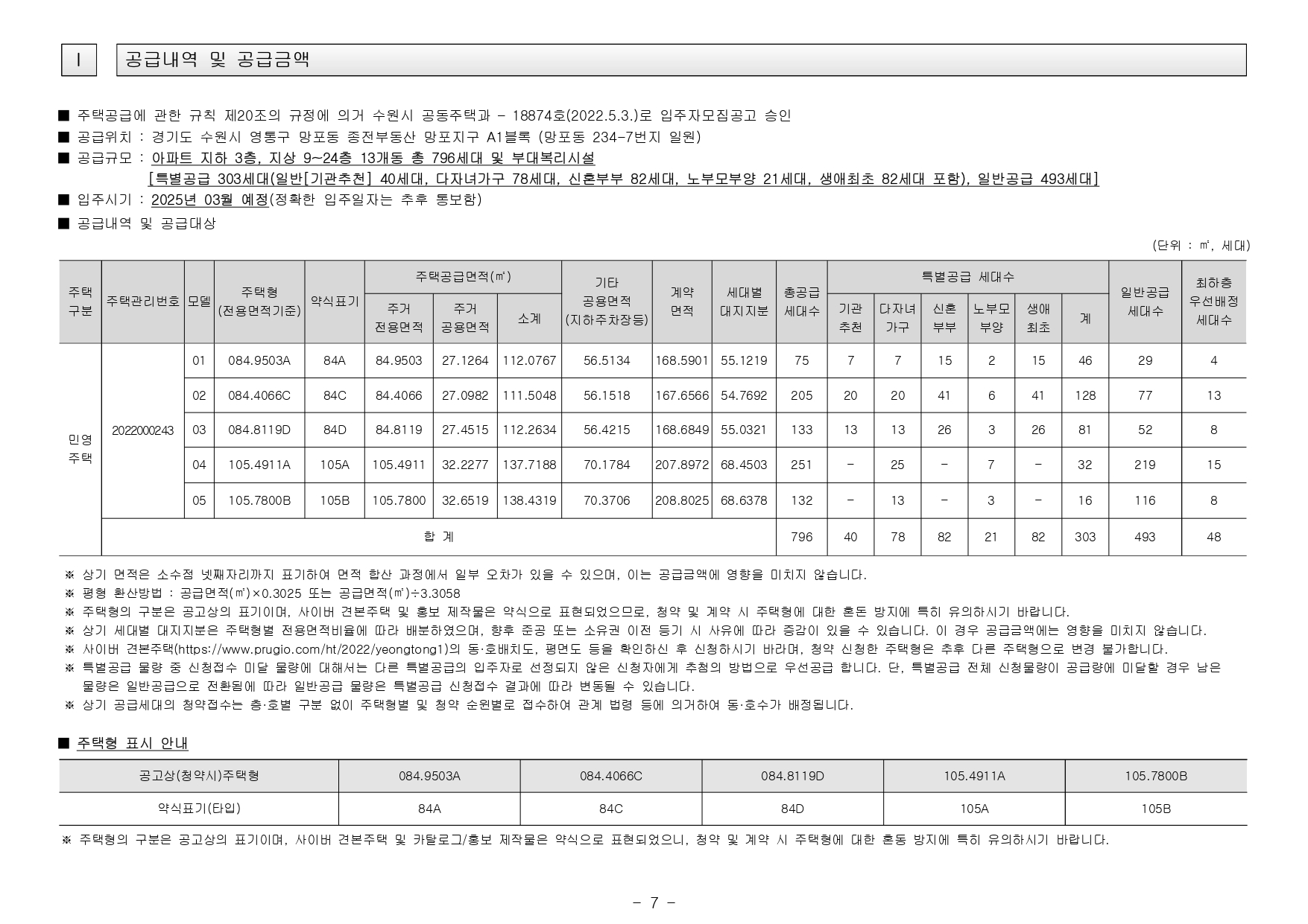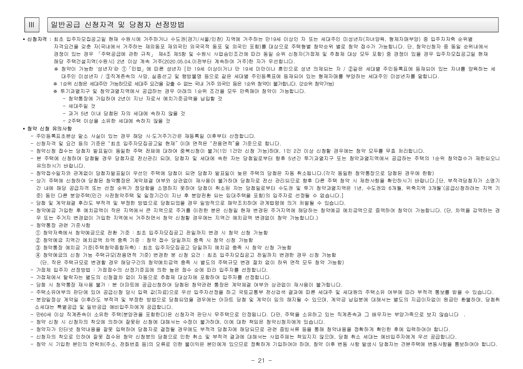 - 본 아파트는 당첨자 발표일이 동일한 모든 주택(민간 사전청약, 분양주택, 분양전환공공임대주택)에 한하여 1인 1건만 신청이 가능하며, 2건 이상 중복신청 시 모두 무효처리 또는 당첨자 선정 이후에도 당첨 무효(예비입주자 지위 무효)되오니 유의하시기 바랍니다. (단, 동일단지 내 1인이 특별공급 및 일반공급에 각 1건씩 청약가능하며 특별공급 당첨자로 선정 시 일반공급 선정 대상에서 제외처리 함)