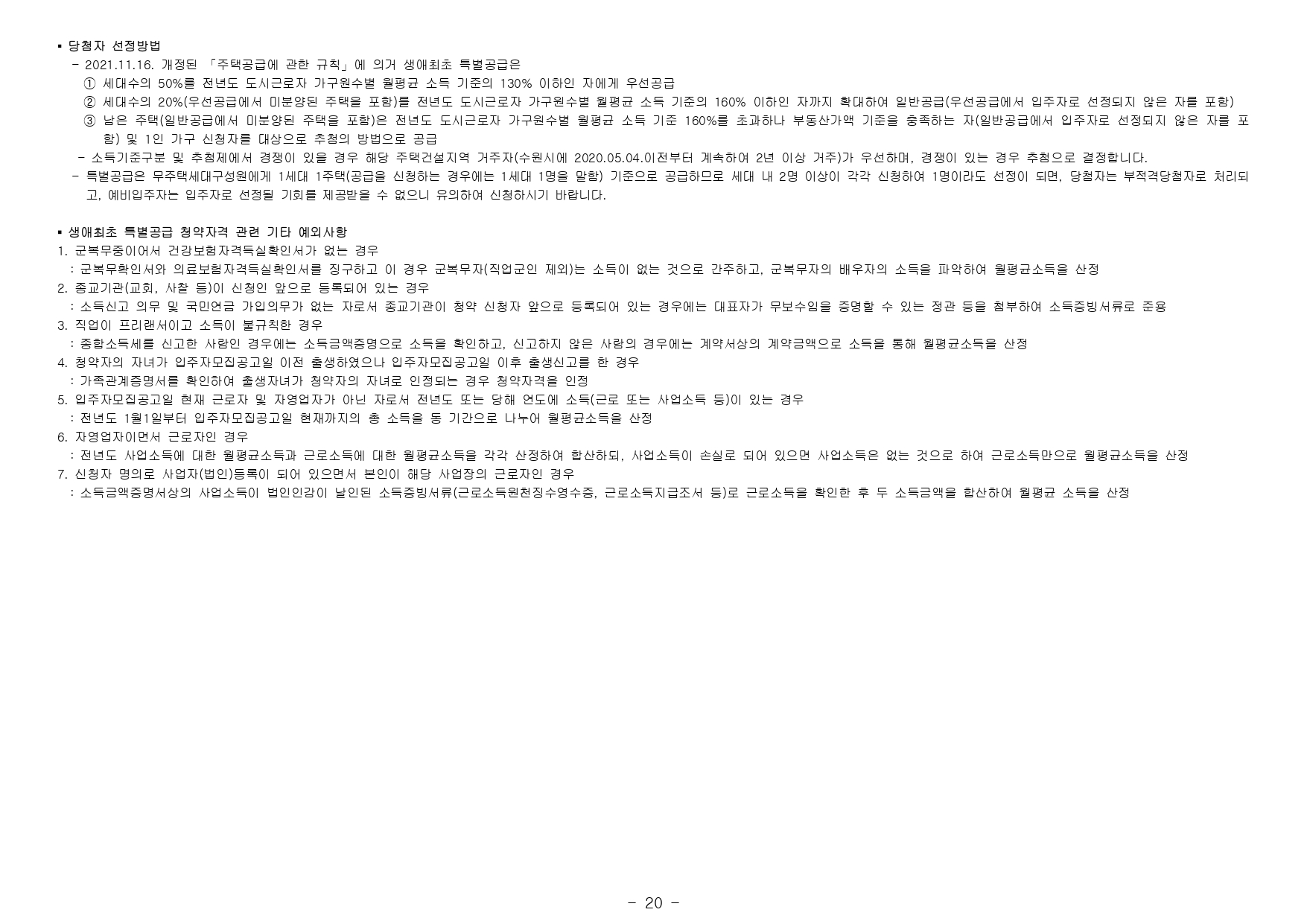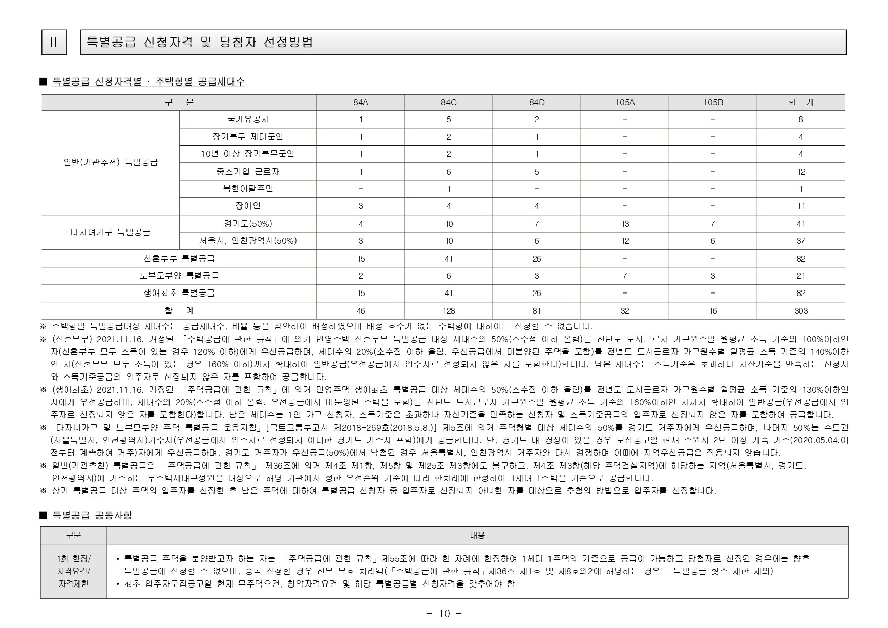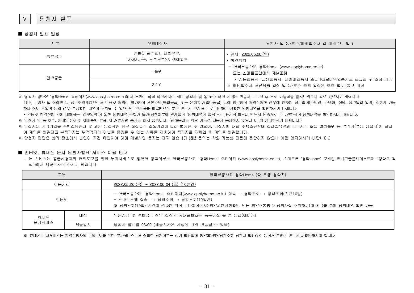 - 본 아파트는 당첨자 발표일이 동일한 모든 주택(민간 사전청약, 분양주택, 분양전환공공임대주택)에 한하여 1인 1건만 신청이 가능하며, 2건 이상 중복신청 시 모두 무효처리 또는 당첨자 선정 이후에도 당첨 무효(예비입주자 지위 무효)되오니 유의하시기 바랍니다. (단, 동일단지 내 1인이 특별공급 및 일반공급에 각 1건씩 청약가능하며 특별공급 당첨자로 선정 시 일반공급 선정 대상에서 제외처리 함)