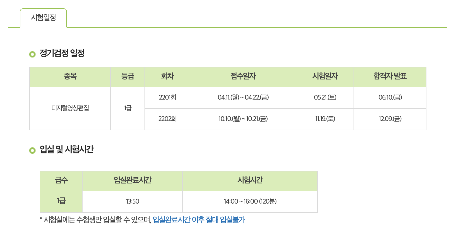 정기검정 일정 종목 등급 회차 접수일자 시험일자 합격자 발표 디지털영상편집 1급 2201회 04.11.(월) ~ 04.22.(금) 05.21.(토) 06.10.(금) 2202회 10.10.(월) ~ 10.21.(금) 11.19.(토) 12.09.(금) 입실 및 시험시간 입