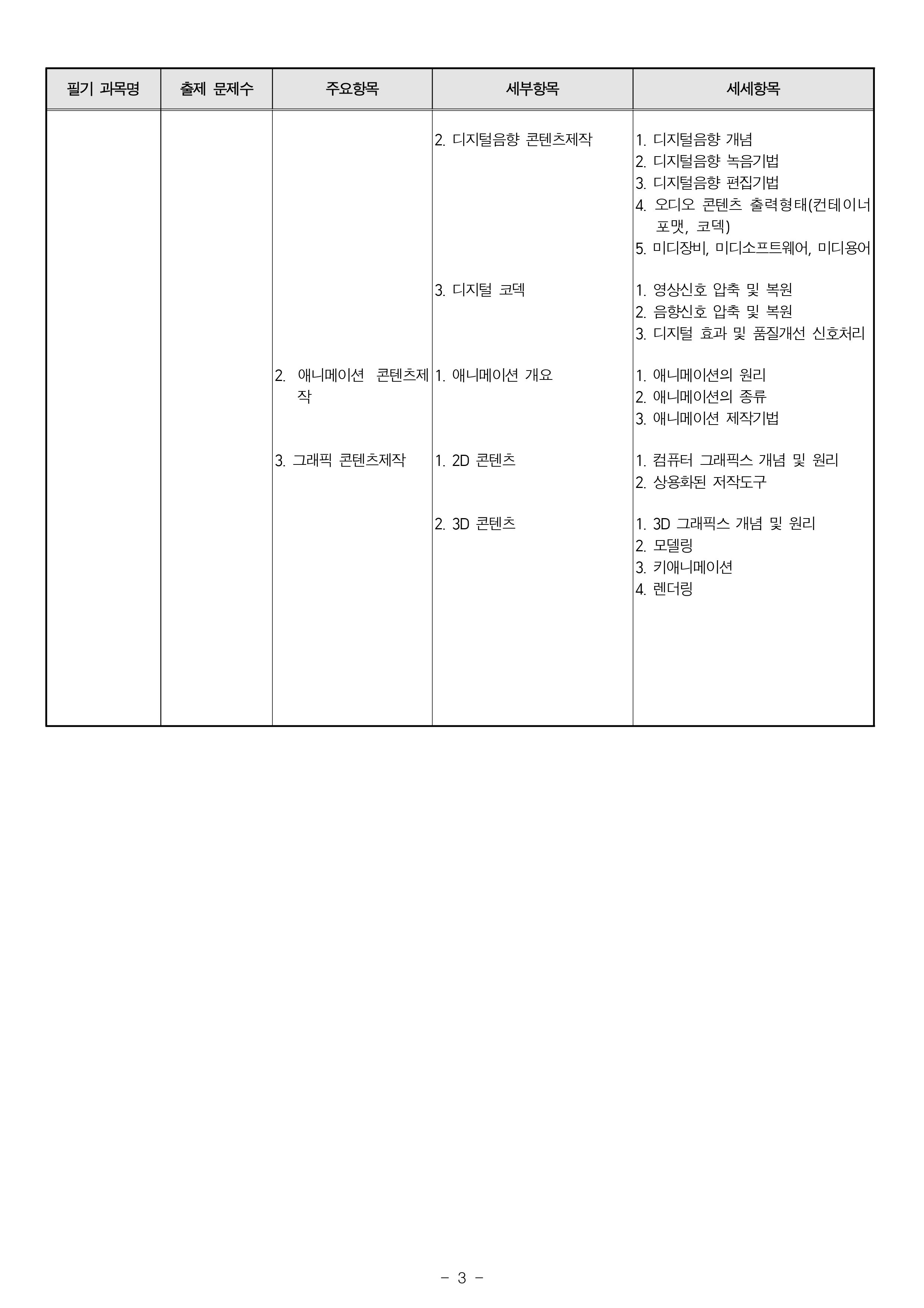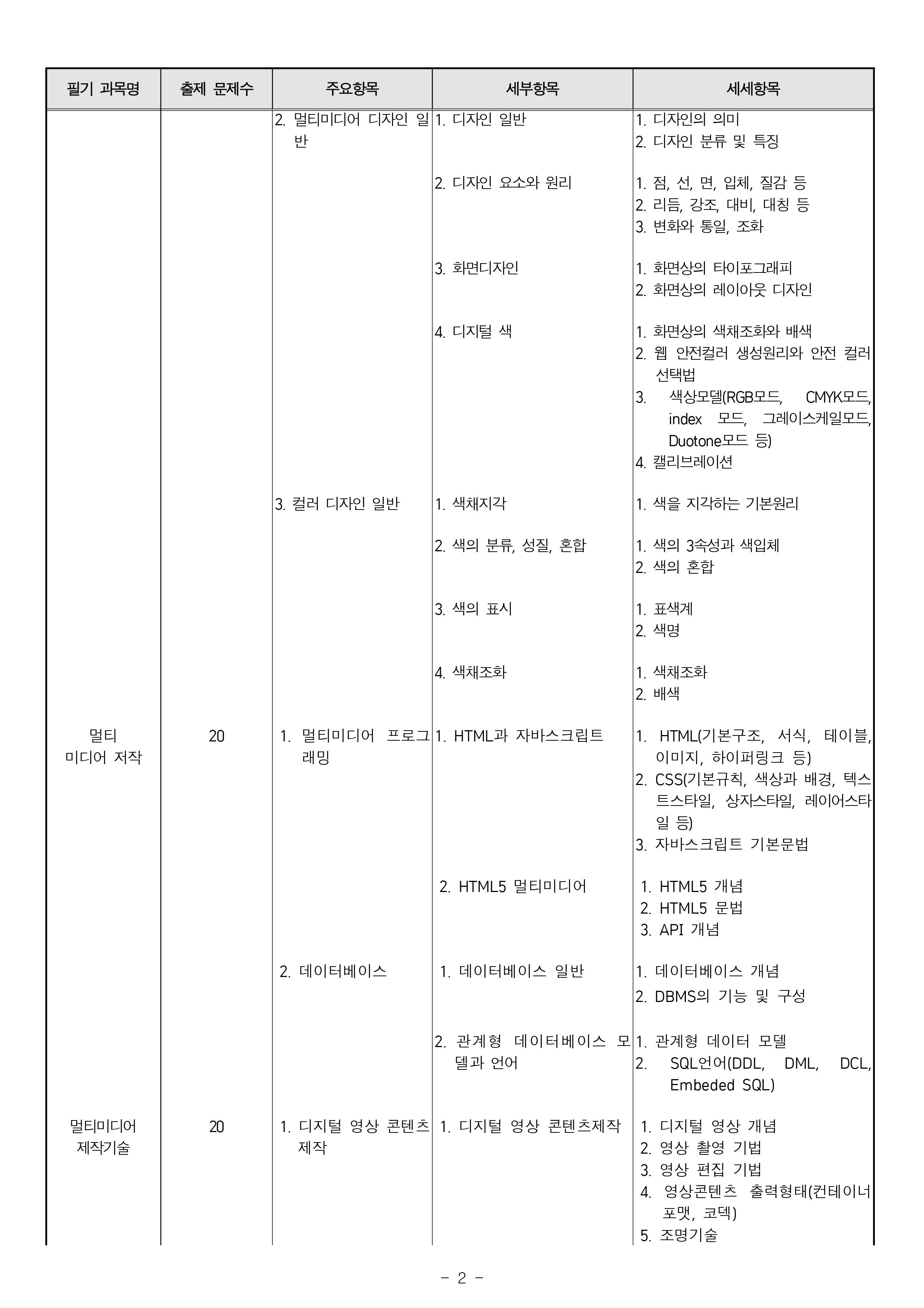 - 필기 1. 멀티미디어개론 2. 멀티미디어 기획 및 디자인 3. 멀티미디어 저작 4. 멀티미디어 제작 기술