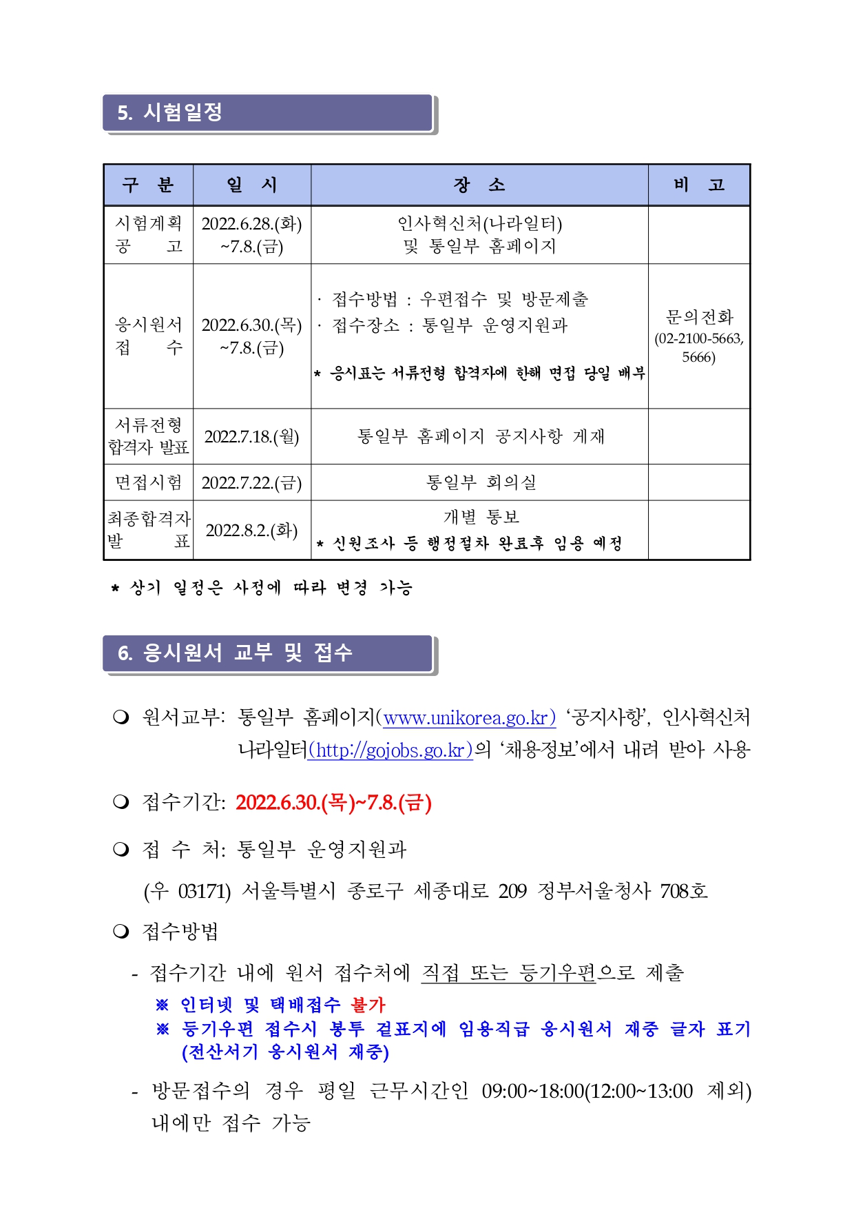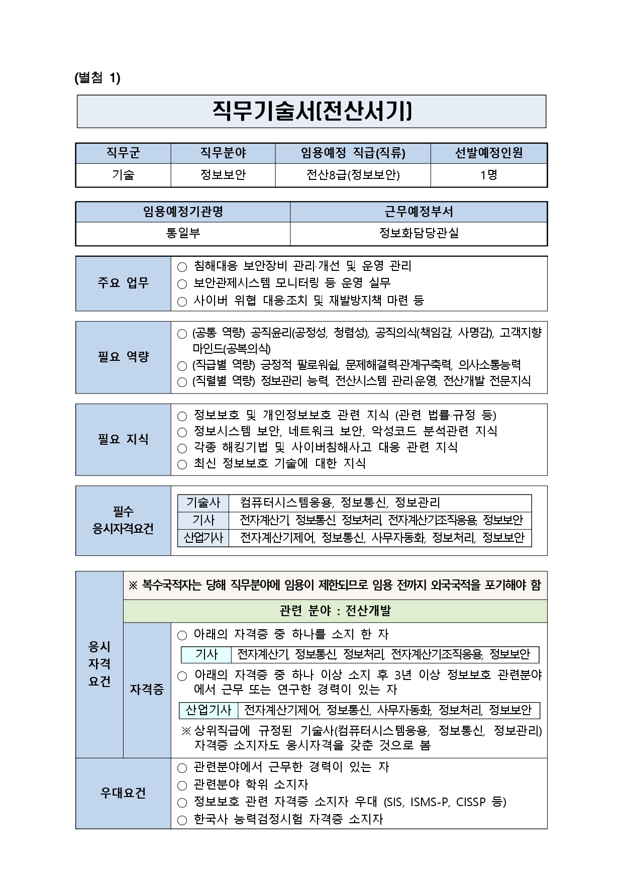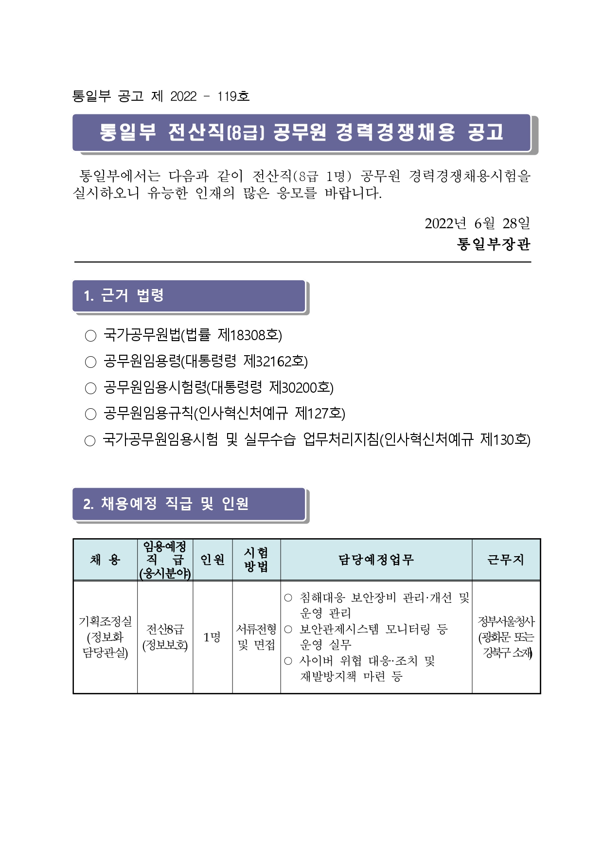 통일부에서는 다음과 같이 전산직(8급 1명) 공무원 경력경쟁채용시험을실시하오니 유능한 인재의 많은 응모를 바랍니다.
