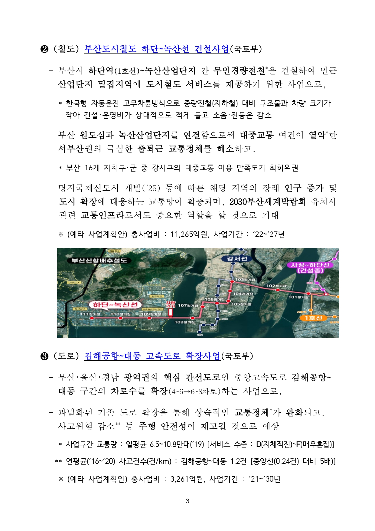 □ 수색~광명 고속철도 건설사업, 부산도시철도 하단~녹산선 건설, 낙동강 유역 안전한 먹는 물 공급체계 구축 등 4개 사업 예타 통과