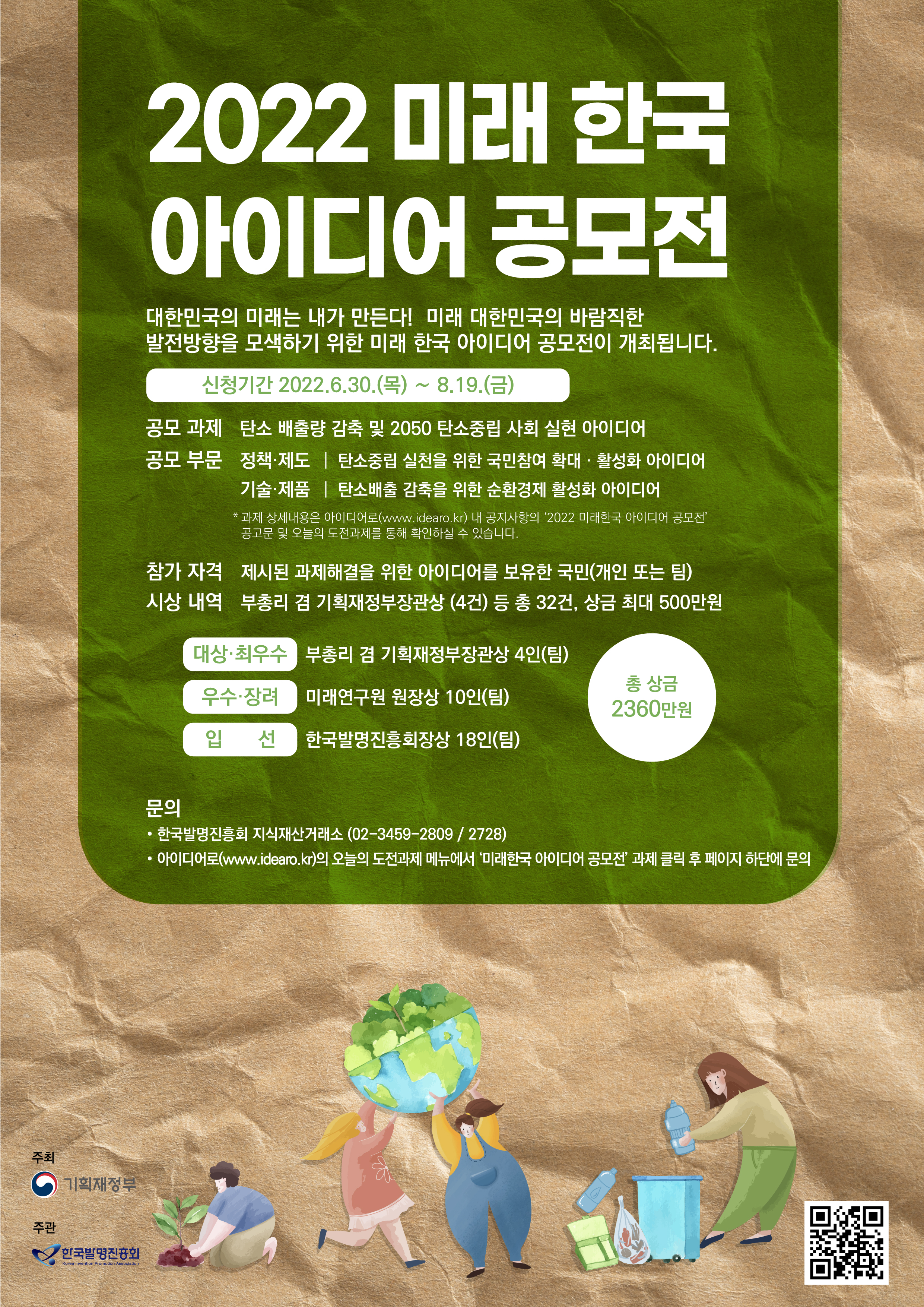 기획재정부가 급격한 경제․사회 구조 변화 속에서 미래 대한민국의 바람직한 발전방향에 대하여 국민들과 같이 고민하는 기회를 마련하기 위하여 2022년도 「미래 한국 아이디어 공모전」을 개최합니다.
