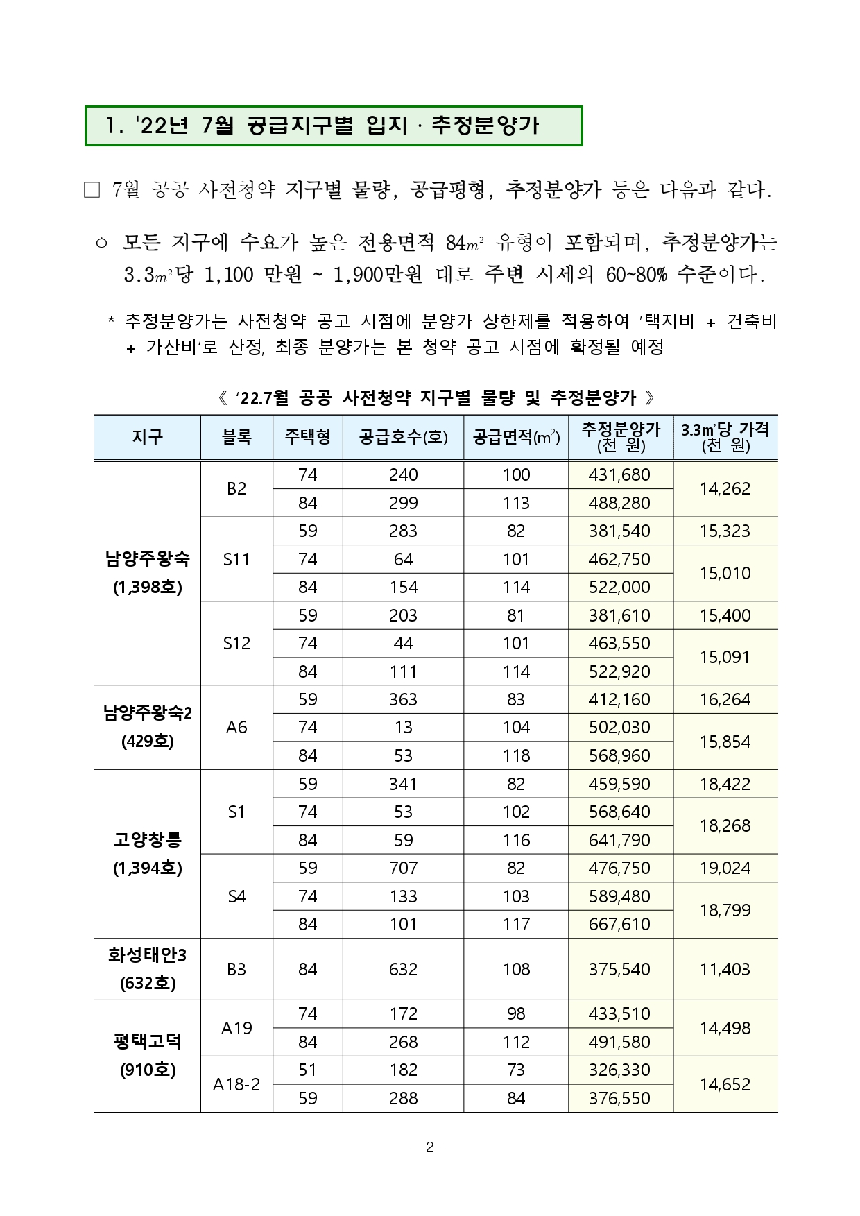이번에 공급되는 지구는 3기 신도시(남양주왕숙,왕숙2,고양창릉) 3,221호, 전국구 청약 지구인 평택고덕 910호 등 수요자 선호가 높은 지구다.