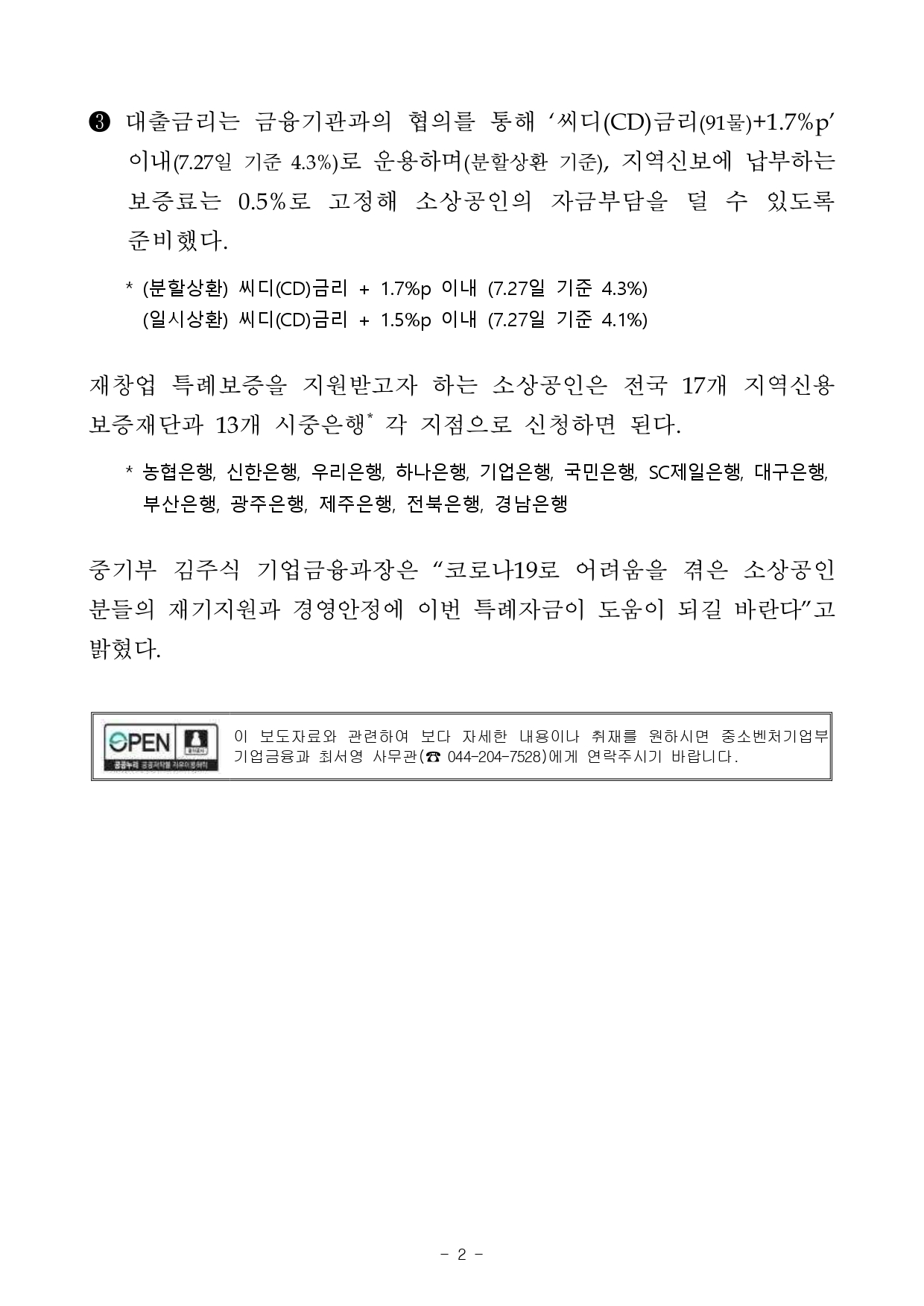 5년간 최대 5,000만원을 보증지원하며, 협약금리와 보증료 할인 우대로 소상공인의 재기지원