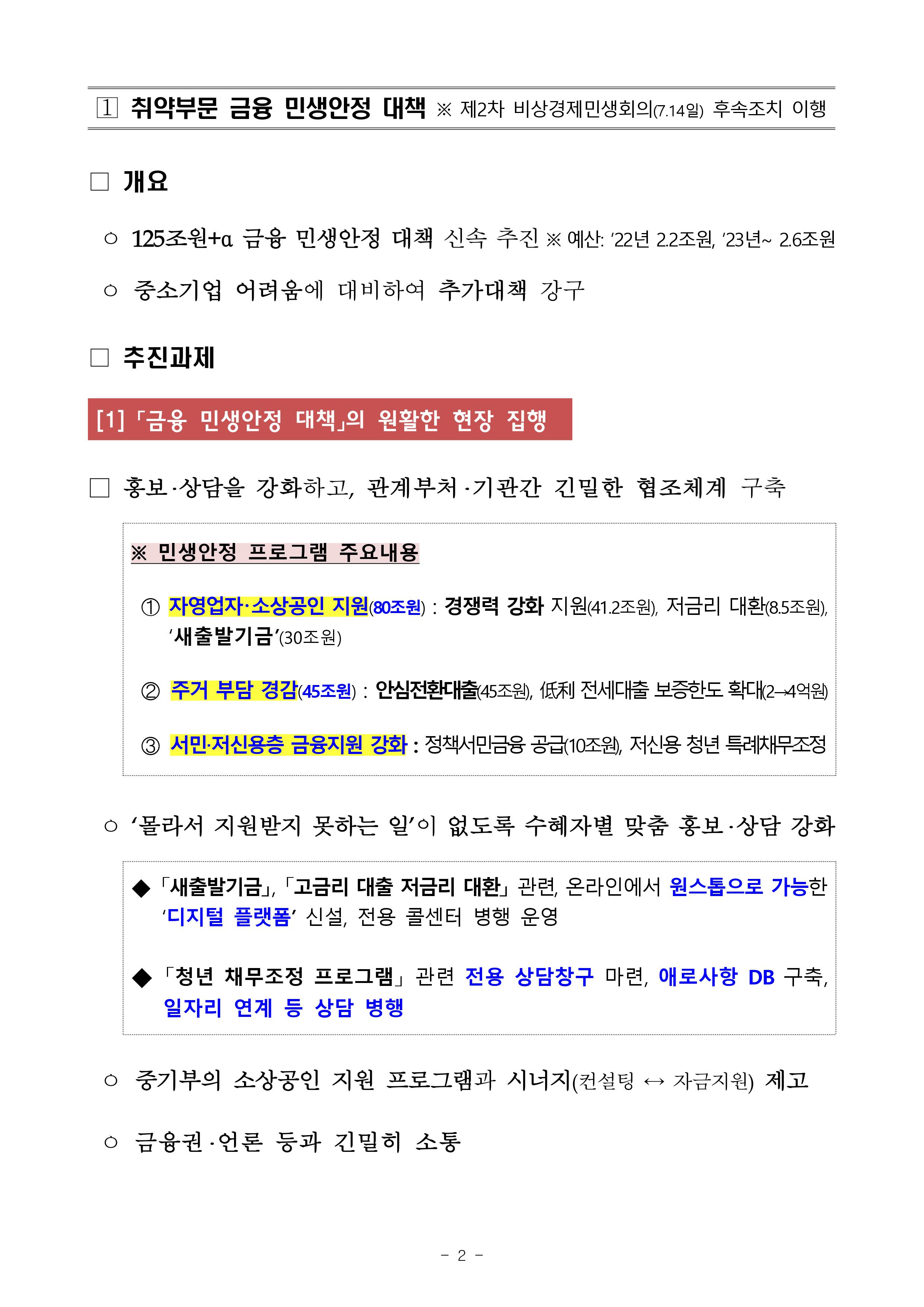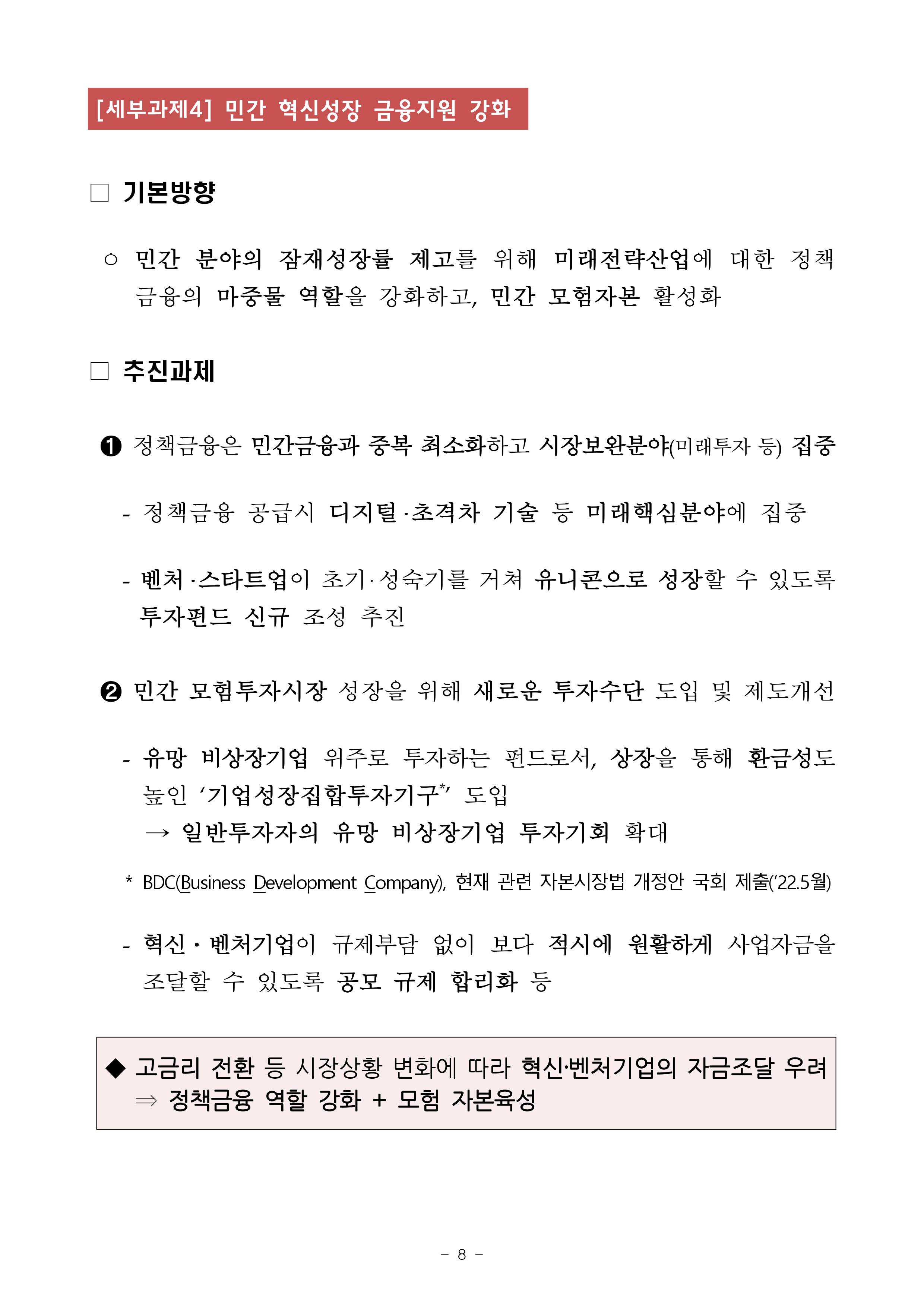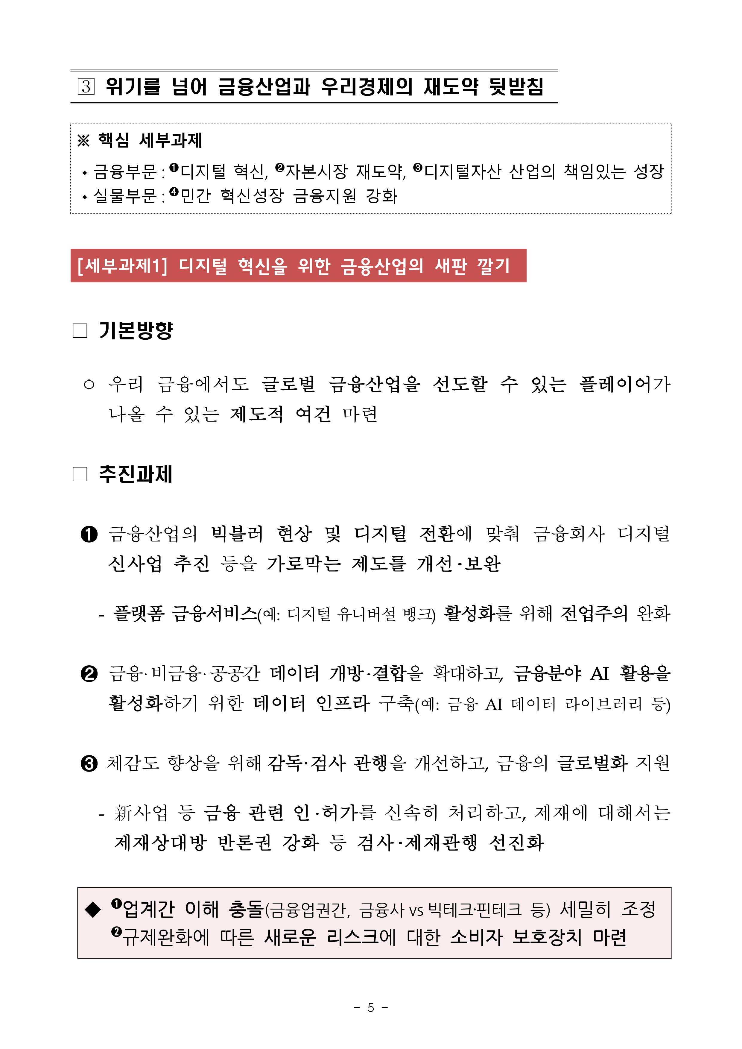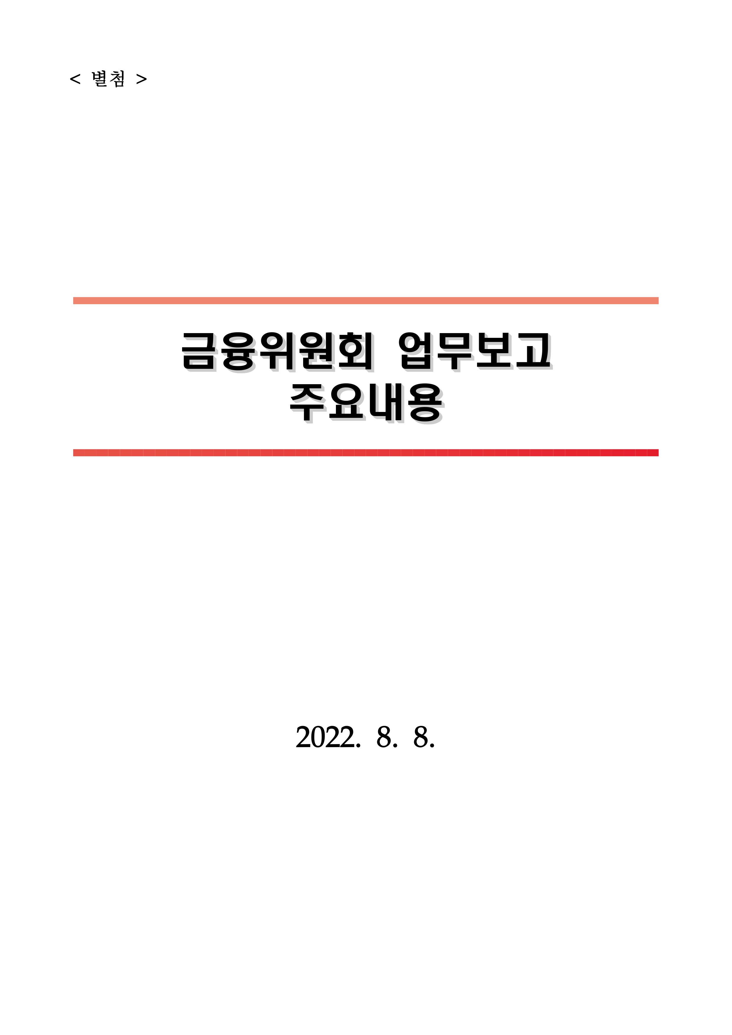 □ 김주현 금융위원장은 8.8일(월) 15:00 대통령실에서 “위기 선제대응 + 위기 넘어 금융산업과 우리경제의 재도약 뒷받침” 이라는 주제로 금융위원회 업무보고를 실시하였습니다. ㅇ 자세한