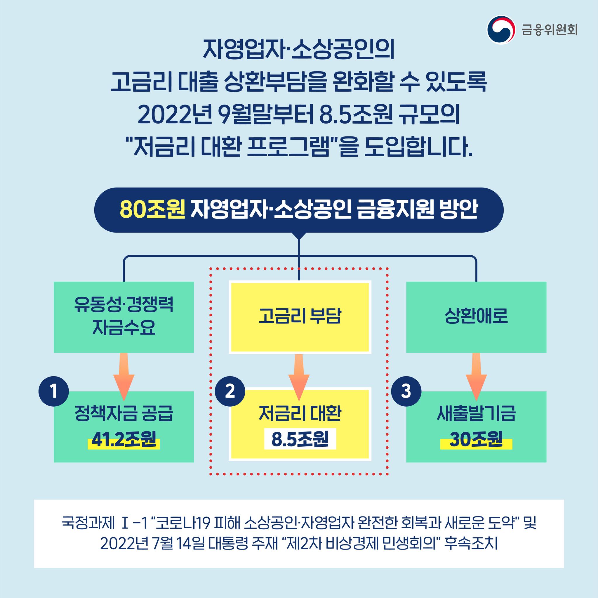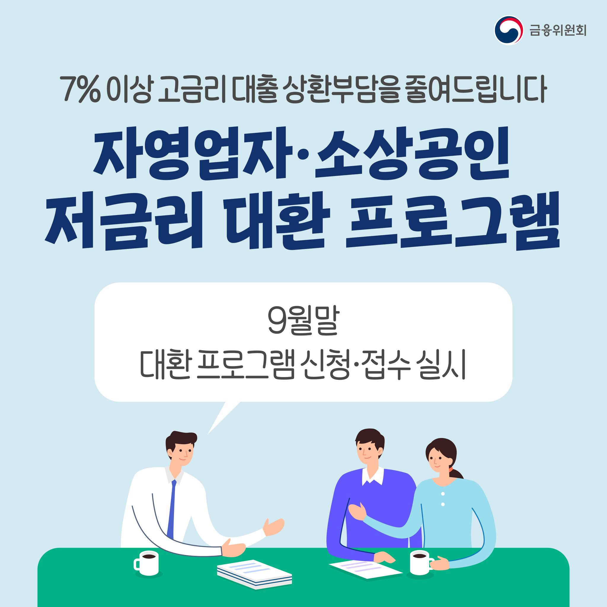 자영업자·소상공인 저금리 대환 프로그램, 7% 이상 고금리 대출 상환 부담을 줄여드립니다 2022-08-17 자영업자·소상공인의 고금리 대출 상환부담을 줄이기 위해 올해 9월말부터 시행되는 8.5조원