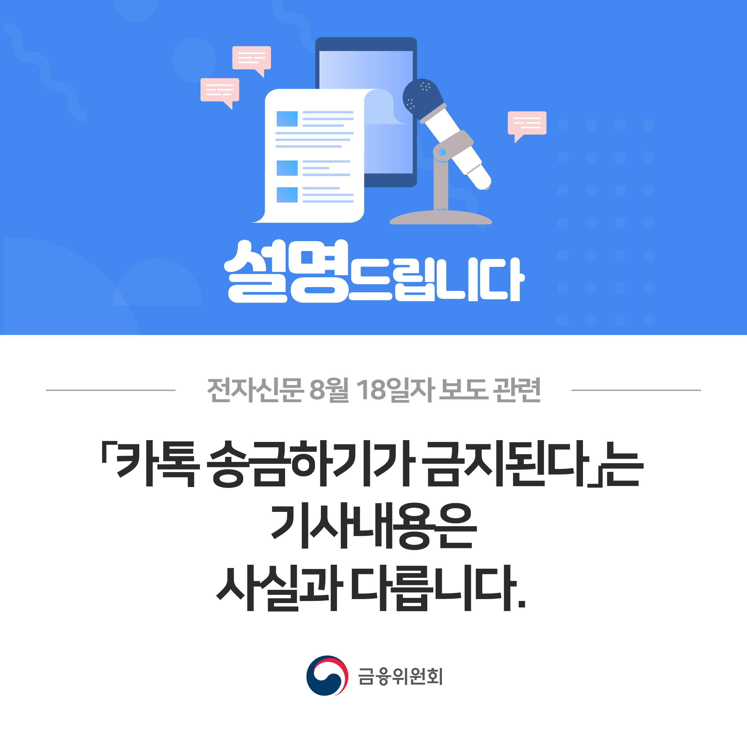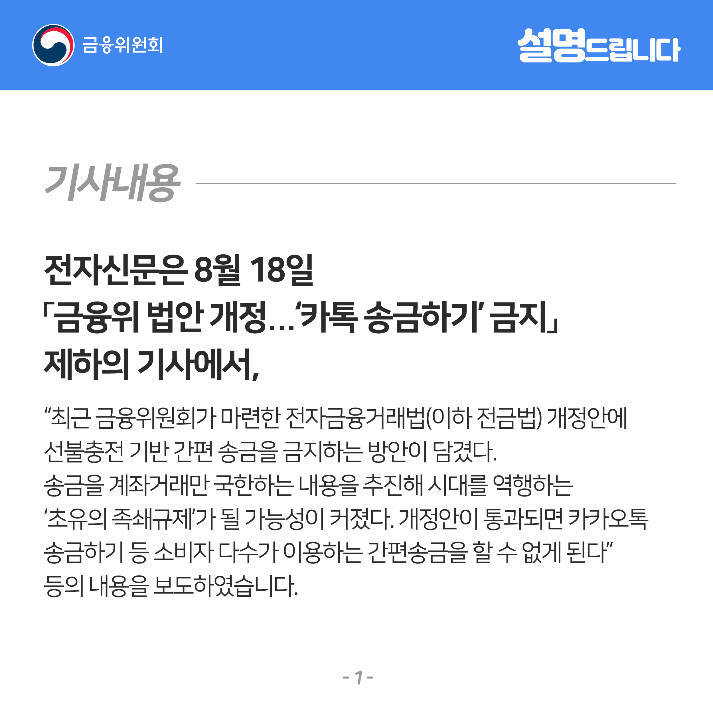 금융위원회 홈페이지에 들어가보니 '카톡 송금하기가 금지된다'는 기사내용은 사실과 다르다는 반박자료가 올라와 있었다.