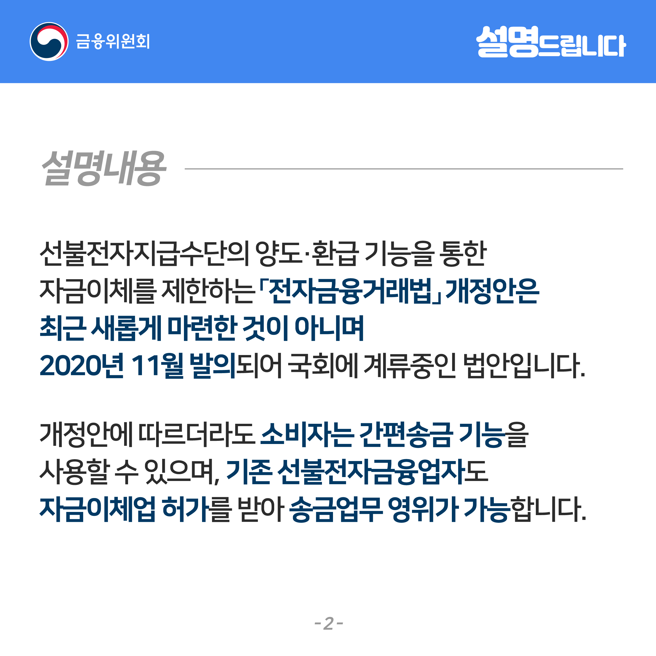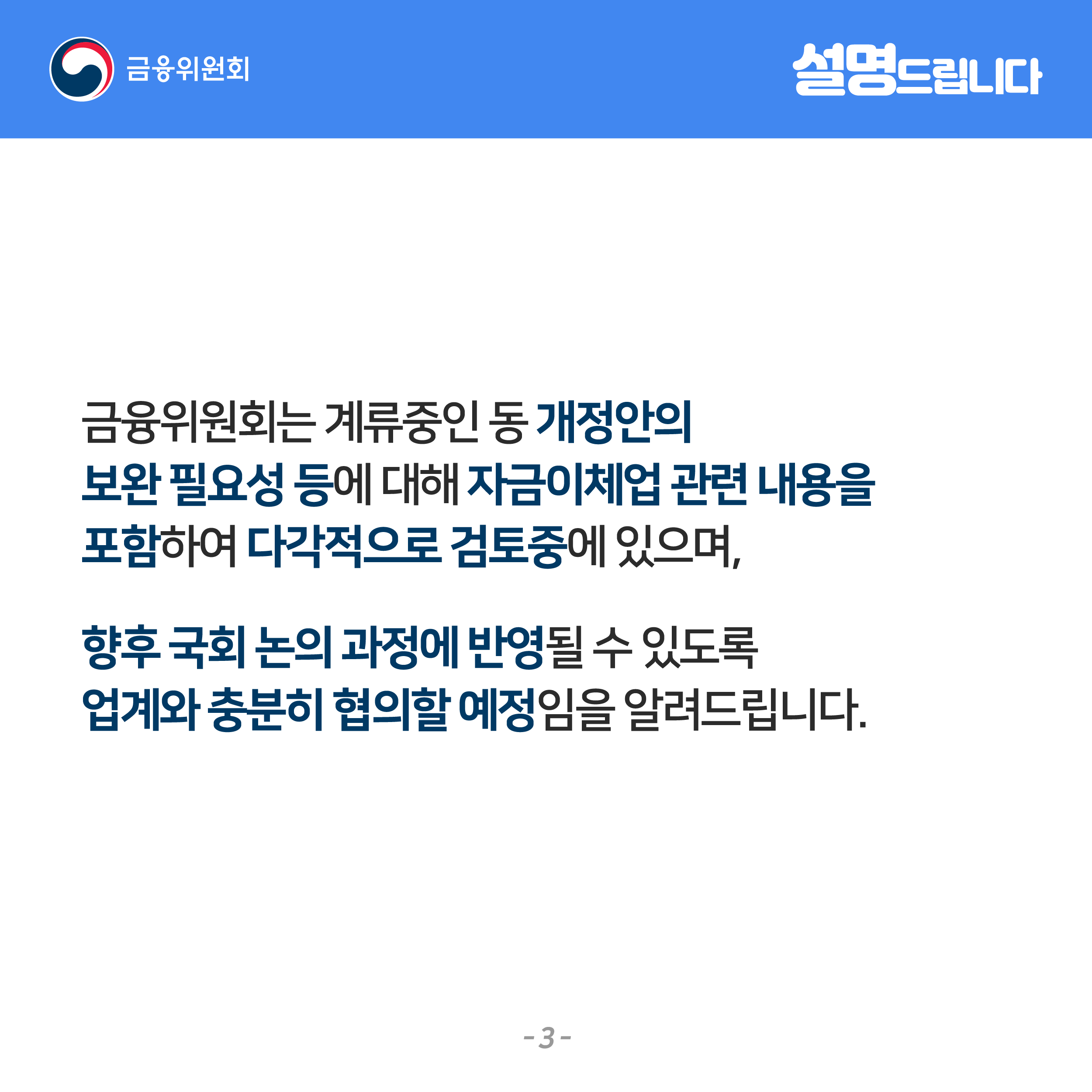 금융위원회에서 반박자료를 내놓았지만, 앞으로 자금이체와 관련된 개정안이 어떻게 흘러갈지 계속해서 지켜봐야 할 것 같다.